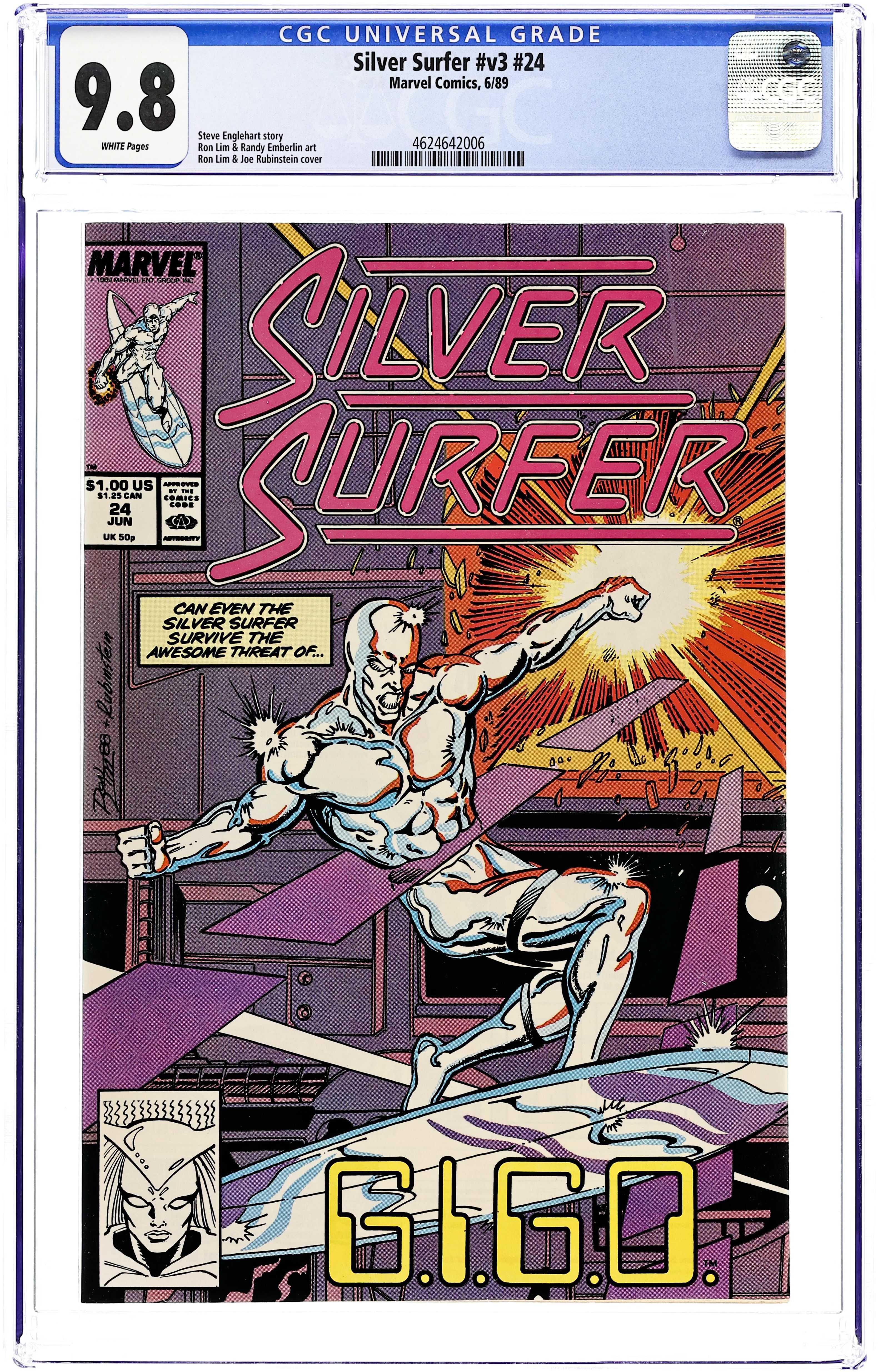 "G.I.G.O." Story by Steve Englehart. Art by Ron Lim and Randy Emberlin. When the Silver Surfer arrives on a planet that is one giant computer with A.I., the planet mistakes Norrin Radd for still being the Herald of Galactus and defends itself accordingly. Can even the Surfer survive an assault by an entire planet? 32 pages. Cover price $1.00.