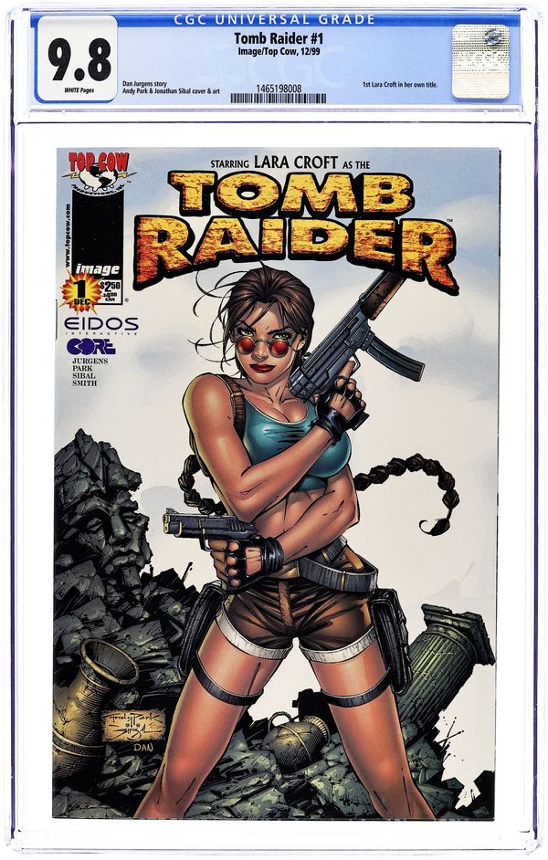 Andy Park Cover. Cover A: White background, art has Tomb raider standing in front of debris. (W) Dan Jurgens (P) Andy Park (I) Jon Sibal Lara Croft is BACK--in her own NEW SERIES!!! That's right, Top Cow proudly presents the long-awaited TOMB RAIDER series. This November, join Lara as she embarks on all-new adventures into exotic locales and dangerous surroundings. Pick up TOMB RAIDER while you can, or you just might miss what is sure to be one of the hottest books of 1999!!! RETAILER NOTE: To celebrate the launch of TOMB RAIDER, there will be three special covers in equal percentages by Marc Silvestri, David Finch and Andy Park! AND, for every 25 copies ordered, retailers will receive a special 5th holofoil cover. FC, 32pg" Cover price $2.50.