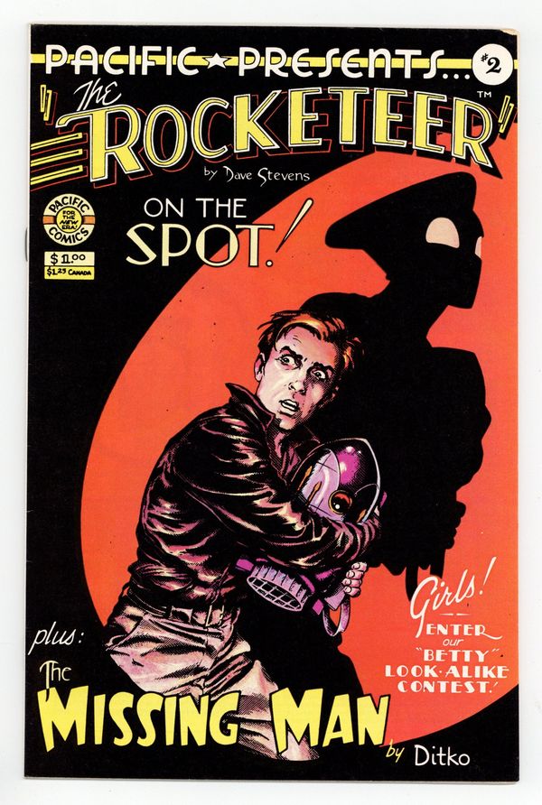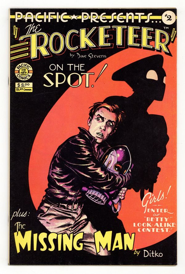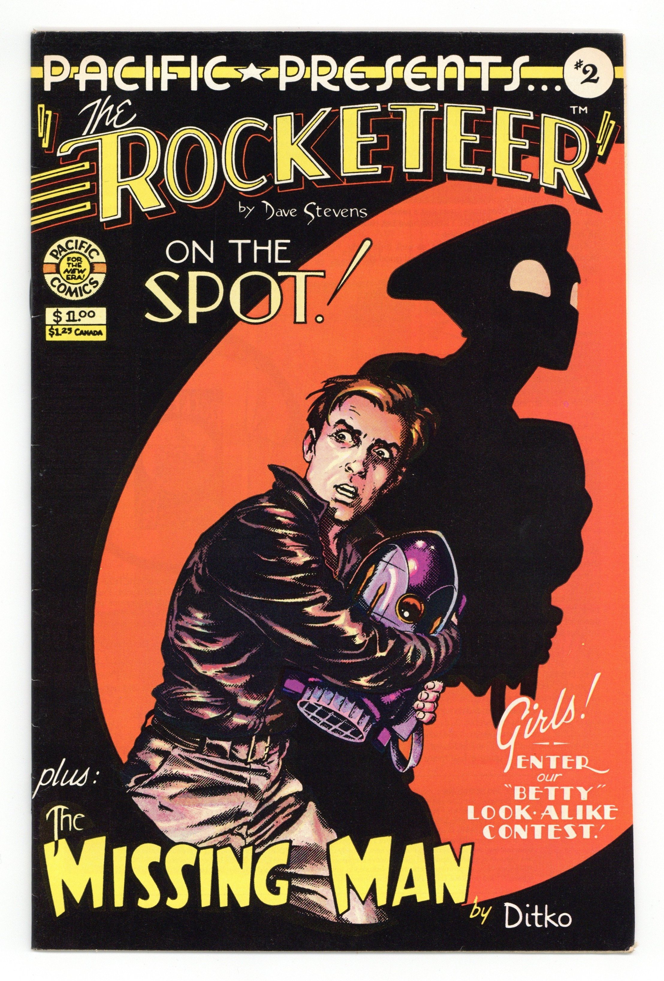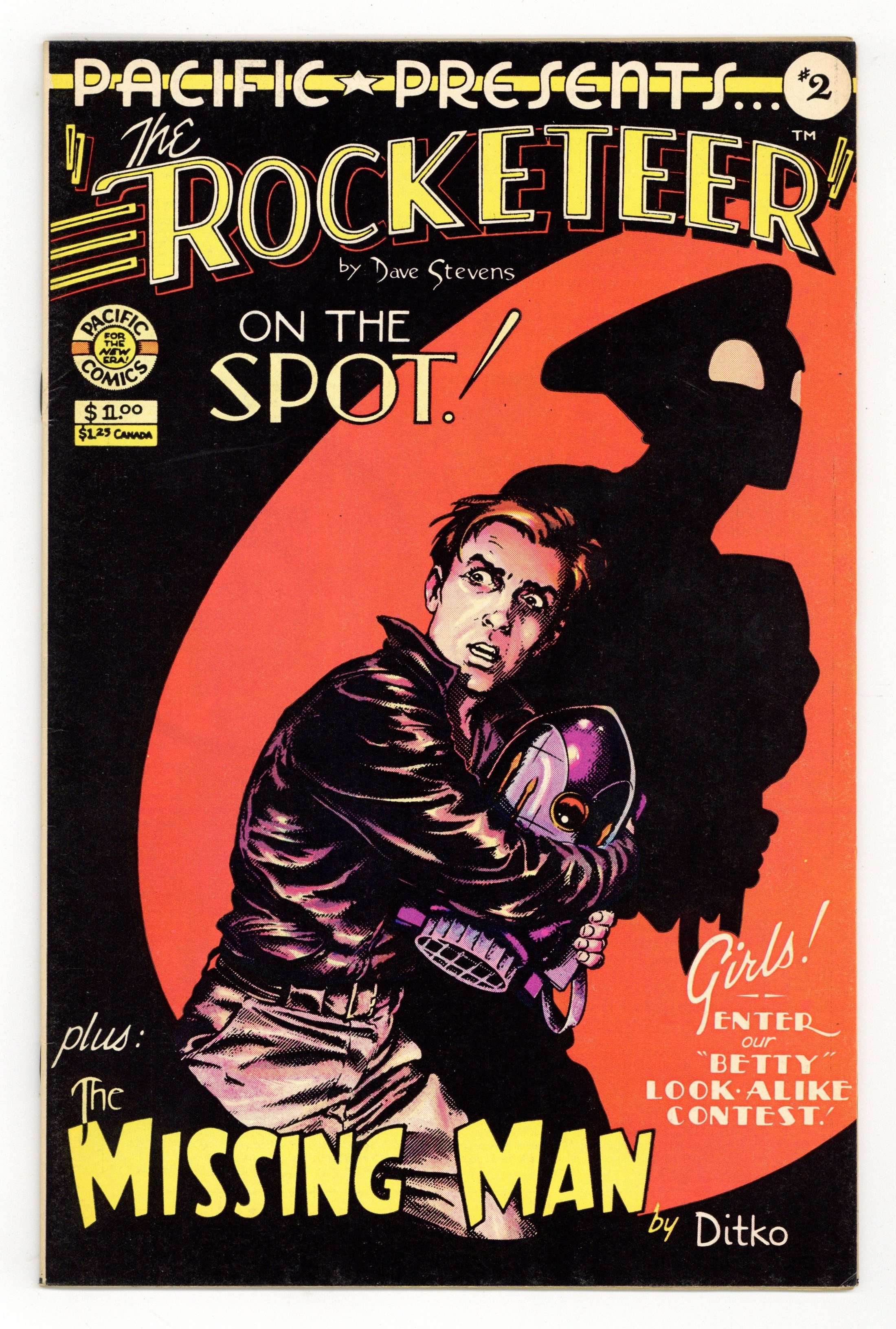 Cover by Dave Stevens. Edited by David Scroggy. Stories by Dave Stevens, Robin Snyder and Steve Ditko. Art by Dave Stevens and Steve Ditko. An early anthology series from influential independent publisher Pacific Comics. In the fourth chapter of Dave Stevens beloved Rocketeer series, Cliff meets two familiar-looking gents who turn out to work for the Man of Bronze himself, Doc Savage. Also, Missing Man, another offbeat hero from Marvel legend Steve Ditko. Lettering by future superstar artist Andy Kubert. The Rocketeer saga continued in Rocketeer Special Edition (1984) #1. Rocketeer Chapter 4; The Missing Man Meets The Payne Family. 32 pages, Full Color. Cover price $1.00.