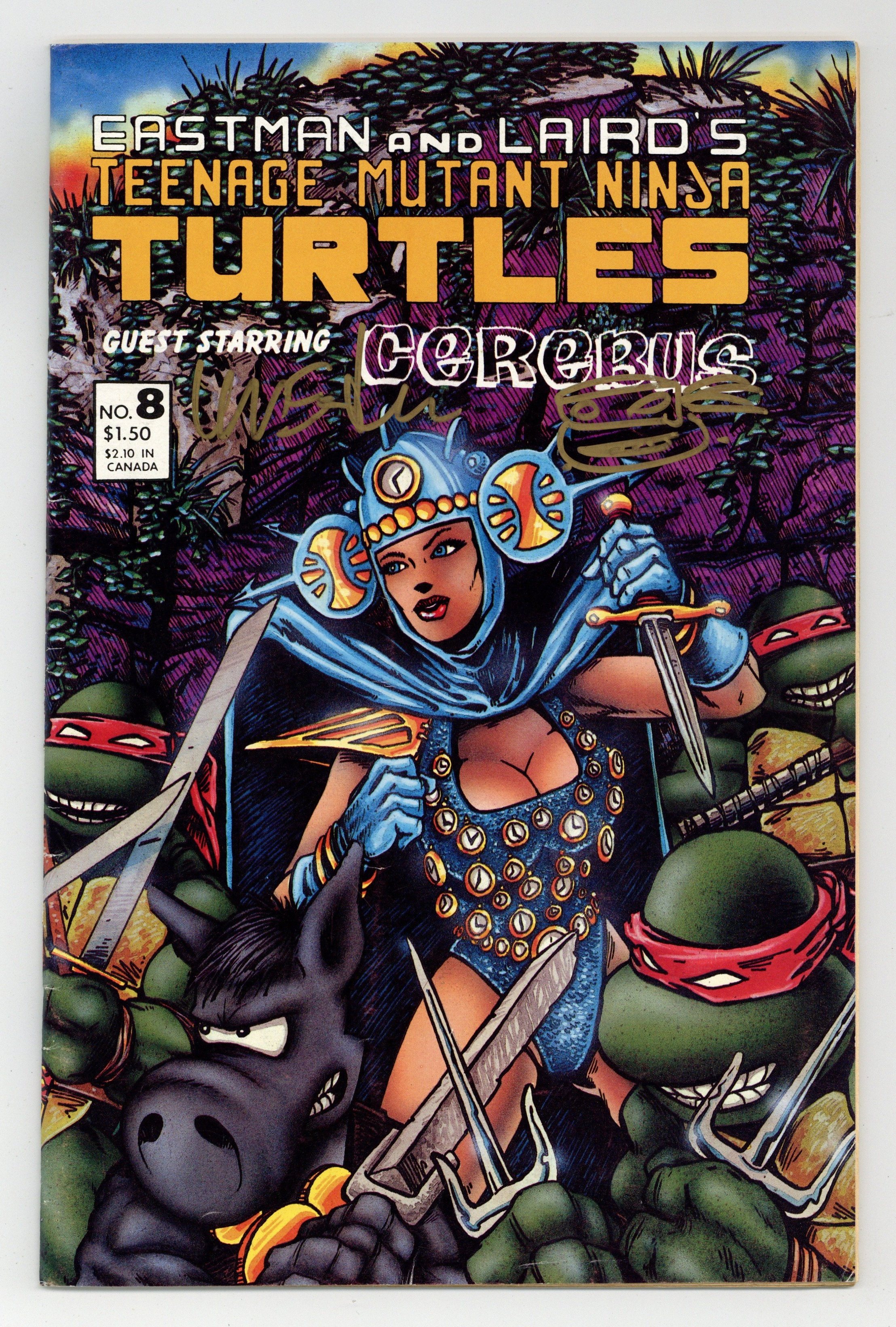 The original series that introduced the Turtles to the world. An errant time traveler accidentally sends the Turtles and herself through time, where they meet Dave Sims Cerebus the Aardvark. Story, art and cover by Dave Sim, Kevin Eastman & Peter Laird; backgrounds by Gerhard. Black and white; 32 pages. Cover price $1.50.