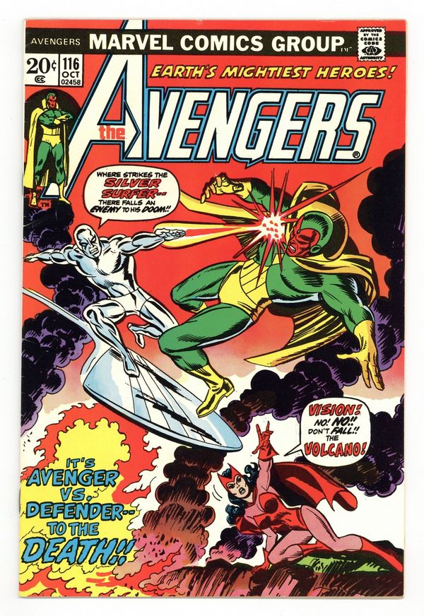 "Betrayal!" Avengers-Defenders crossover. Part 3 of 8. Guest-starring the Defenders. Script by Steve Englehart. Pencils by Bob Brown. Inks by Mike Esposito. Cover by John Romita and Mike Esposito. Story continues from Defenders 8. Earth's Mightiest Heroes visit Dr. Strange's townhouse in Greenwich Village and request permission to enter, but Wong slams the door in their faces! After an angry Thor breaks down the door, the Avengers storm inside, but a mystic spell sweeps them back out onto the street! Meanwhile gathered around the Orb of Agamotto, the Defenders put together a plan to find the six pieces of the Evil Eye. However, in the dark realm, Loki has grown suspicious of his dreadful ally! And contacts the Avengers to tell them about the Defenders' search for the ancient instrument from Avalon! So the die is cast! And the blockbuster battles are about to begin! Flashback cameos by Prester John, Wyatt Wingfoot, and the Human Torch to recap the history of the Evil Eye. Next Chapter: "The Silver Surfer vs. the Vision and the Scarlet Witch" The Avengers-Defenders Clash kicks into high gear as members of both teams span the globe to searching for the Evil Eye! And the first showdown features two of the most popular Marvel super-heroes of the 1970's! The Silver Surfer arrives in French Polynesia and plunges into the island's indigenous volcano to look for the Evil Eye. But the cosmic sky-rider's probing triggers a volcanic eruption! The fiery blast knocks a passing quinjet out of the sky and nearly kills the Scarlet Witch! Needless to say, this act enrages the synthezoid avenger! And in the heart of the raging volcano, the Vision and the Silver Surfer fight for the Evil Eye! Story continues in Defenders 9. (Notes: The Evil Eye previously appeared in Fantastic Four 54. This issue includes a full-page survey for readers to complete and mail back to the Marvel bullpen. A reprint edition exists for this issue.) 36 pgs. Cover price $0.20.