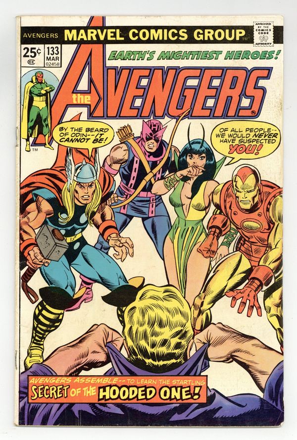 $19.00"Yesterday and Beyond…" Script by Steve Englehart. Art by Sal Buscema (layouts) and Joe Staton (finishes). Cover by Gil Kane, Dave Cockrum, and Frank Giacoia. The Celestial Madonna saga continues after the Avengers narrowly defeated Kang in Giant-Size Avengers 3. As a reward for thwarting the Conqueror, Immortus sends Mantis and the Vision on separate journeys through time to discover their respective origins. The Vision's path of discovery starts in the laboratory of Dr. Phineas T. Horton during the early days of World War II. While Mantis' history lesson begins eons ago on Hala, the home planet of the Kree. Meanwhile inside Avengers Mansion, the Scarlet Witch trains with Agatha Harkness to hone her mutant powers. Origin of the Vision. Origin of Mantis. Cameo appearances by Moondragon, Libra, and the Cotati. Flashback cameos by the original Human Torch, the Sentinels, Skrullls, and Kree. Avengers Lineup: Iron Man, Hawkeye, Mantis, Scarlet Witch, Thor, and the Vision. (Note: The first subplot connecting the Vision to the original Human Torch was introduced in Avengers 93.) 36 pgs. Cover price $0.25.