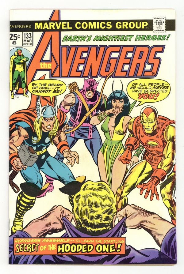 $25.50"Yesterday and Beyond…" Script by Steve Englehart. Art by Sal Buscema (layouts) and Joe Staton (finishes). Cover by Gil Kane, Dave Cockrum, and Frank Giacoia. The Celestial Madonna saga continues after the Avengers narrowly defeated Kang in Giant-Size Avengers 3. As a reward for thwarting the Conqueror, Immortus sends Mantis and the Vision on separate journeys through time to discover their respective origins. The Vision's path of discovery starts in the laboratory of Dr. Phineas T. Horton during the early days of World War II. While Mantis' history lesson begins eons ago on Hala, the home planet of the Kree. Meanwhile inside Avengers Mansion, the Scarlet Witch trains with Agatha Harkness to hone her mutant powers. Origin of the Vision. Origin of Mantis. Cameo appearances by Moondragon, Libra, and the Cotati. Flashback cameos by the original Human Torch, the Sentinels, Skrullls, and Kree. Avengers Lineup: Iron Man, Hawkeye, Mantis, Scarlet Witch, Thor, and the Vision. (Note: The first subplot connecting the Vision to the original Human Torch was introduced in Avengers 93.) 36 pgs. Cover price $0.25.