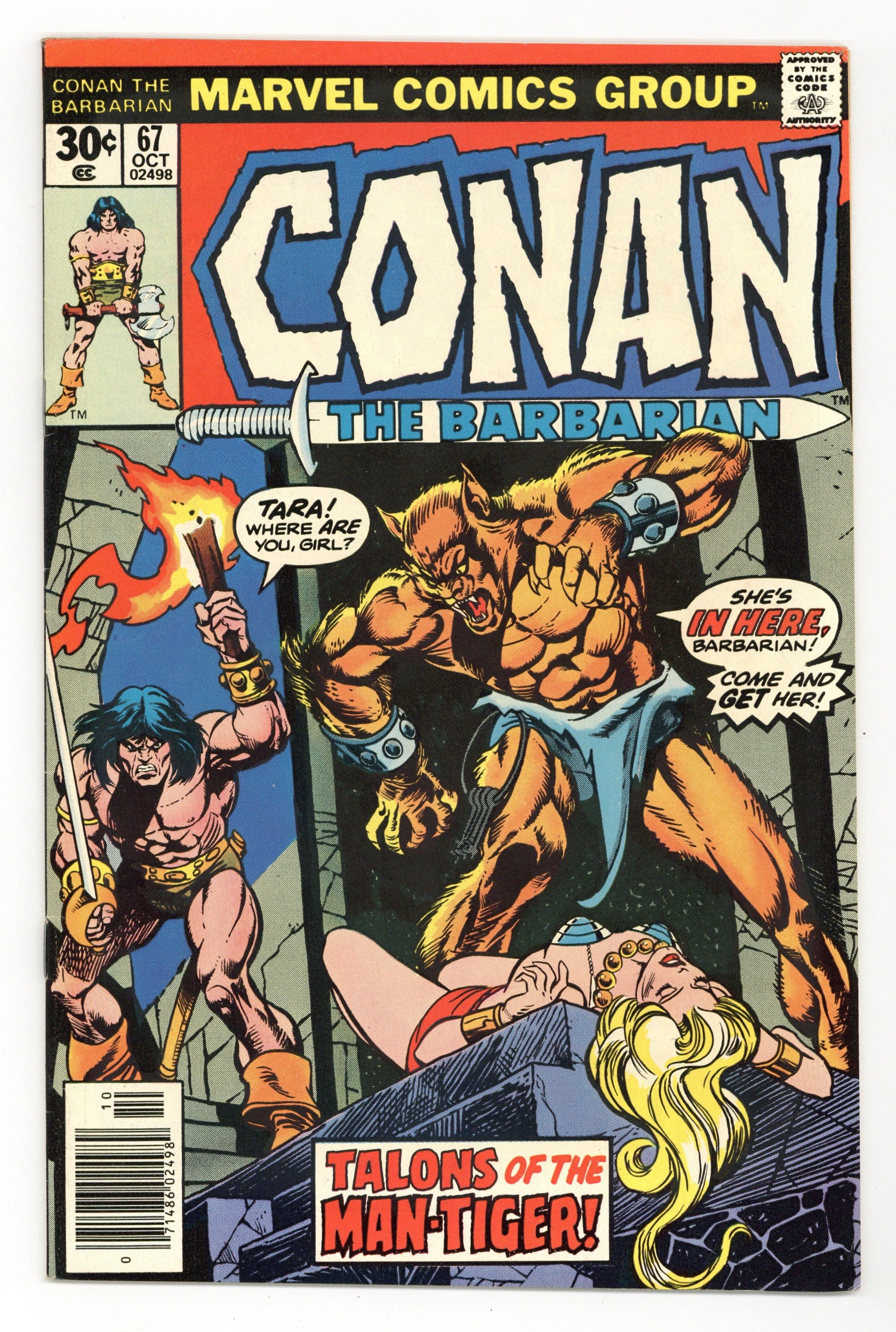 Tags: Marvel Legacy Numbering: Conan (part 67), Conan$6.00Cover pencils by Gil Kane. Red Sonja and Belit guest star in Talons of the Man-Tiger! Script by Roy Thomas, pencils by John Buscema, inks by the Tribe (Tony DeZuniga and others); setting: Messantia; Red Sonja beats Belit at swordplay (and takes page of skelos), Conan kills Man-tiger and frees Yusef from prison; Conan & Belit chase Red Sonja in last panel. Story continues in Marvel Feature #7. Letter to the editor from Kim Thompson (Comics Journal). 36 pgs. Cover price $0.30. Cover price $0.30.