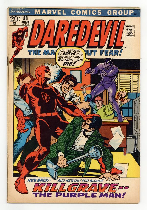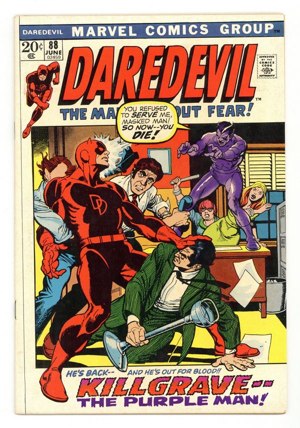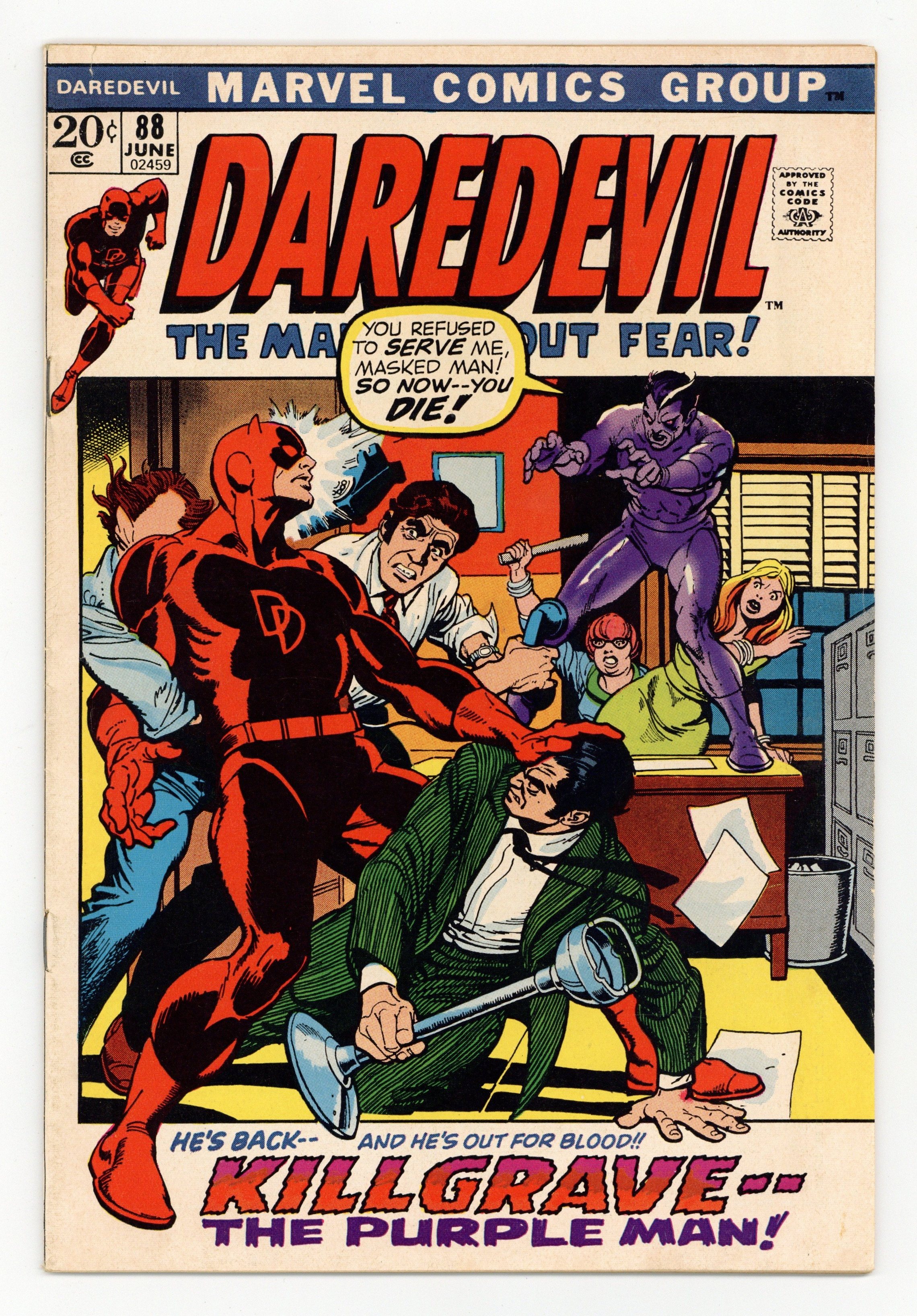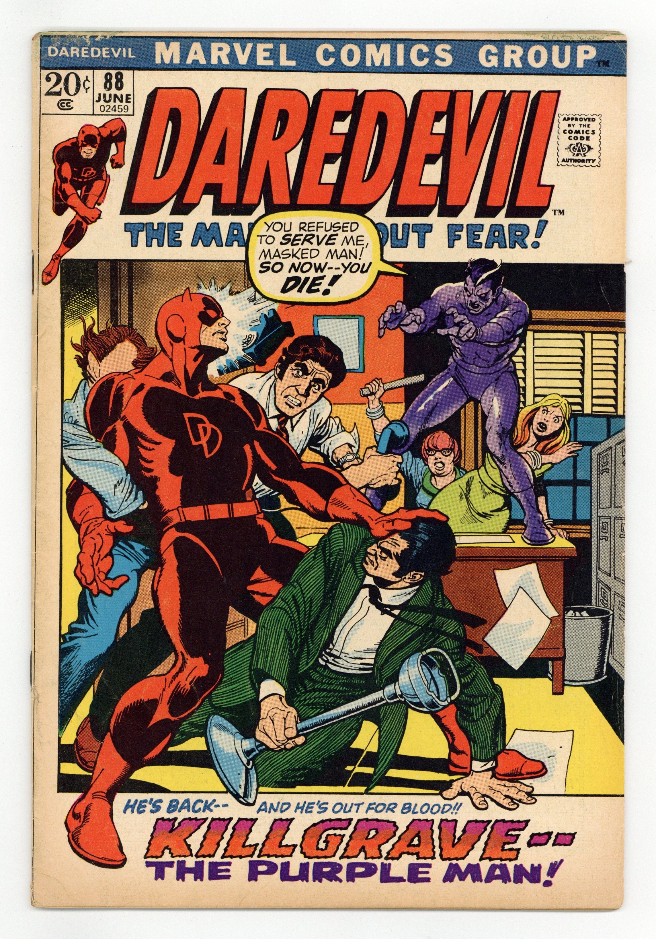 Cover pencils by Gil Kane, inks by Ralph Reese. Call Him Killgrave!, script by Gerry Conway, pencils by Gene Colan, inks by Tom Palmer; DD battles the Purple Man; Black Widow reconnects with an old spy buddy; While trying to track down the Widow, Ivan fills DD in on part of her origin story. 36 pgs. Cover price $0.20. Cover price $0.20.