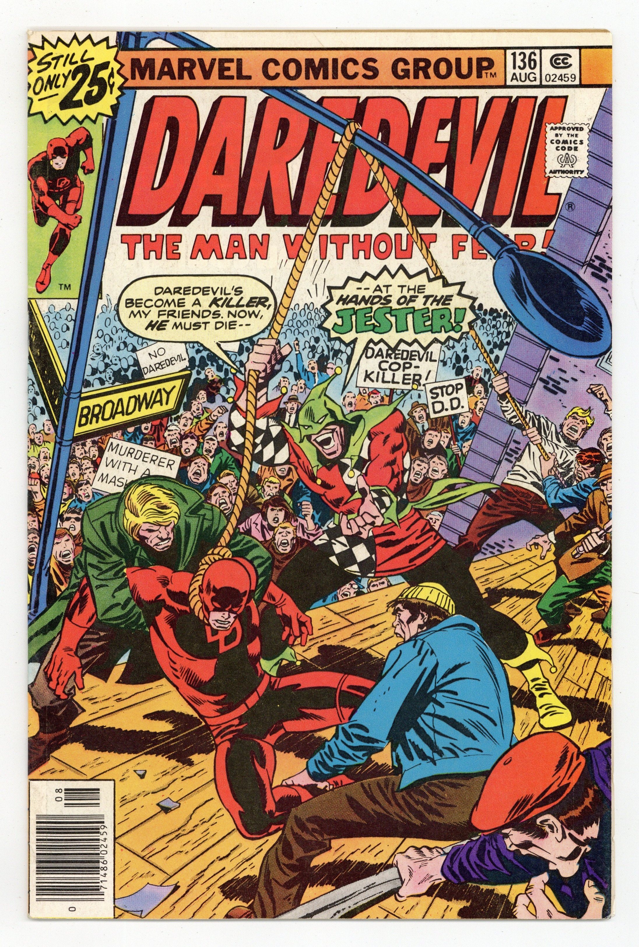 Tags: Marvel Legacy Numbering: Daredevil (part 136), Daredevil$8.60"A Hanging for a Hero!" Written by Marv Wolfman Pencils by John Buscema. Inks by Jim Mooney. Cover pencils by John Buscema, inks by Frank Giacoia. Jester continues to manipulate the media by faking a newscast by the president where he tells the public to kill all super heroes. Jester captures DD and holds a mock trial. Cameos by John F. Kennedy, Robert F. Kennedy, and Gerald Ford. Notes: The letters page contains Marvel Value Stamp series B #5 (Stan Lee). Last 25-cent cover price. This is the 25-cent cover price edition. There also exists a 30-cent cover price edition which had limited distribution (for market testing). Cover price $0.25.