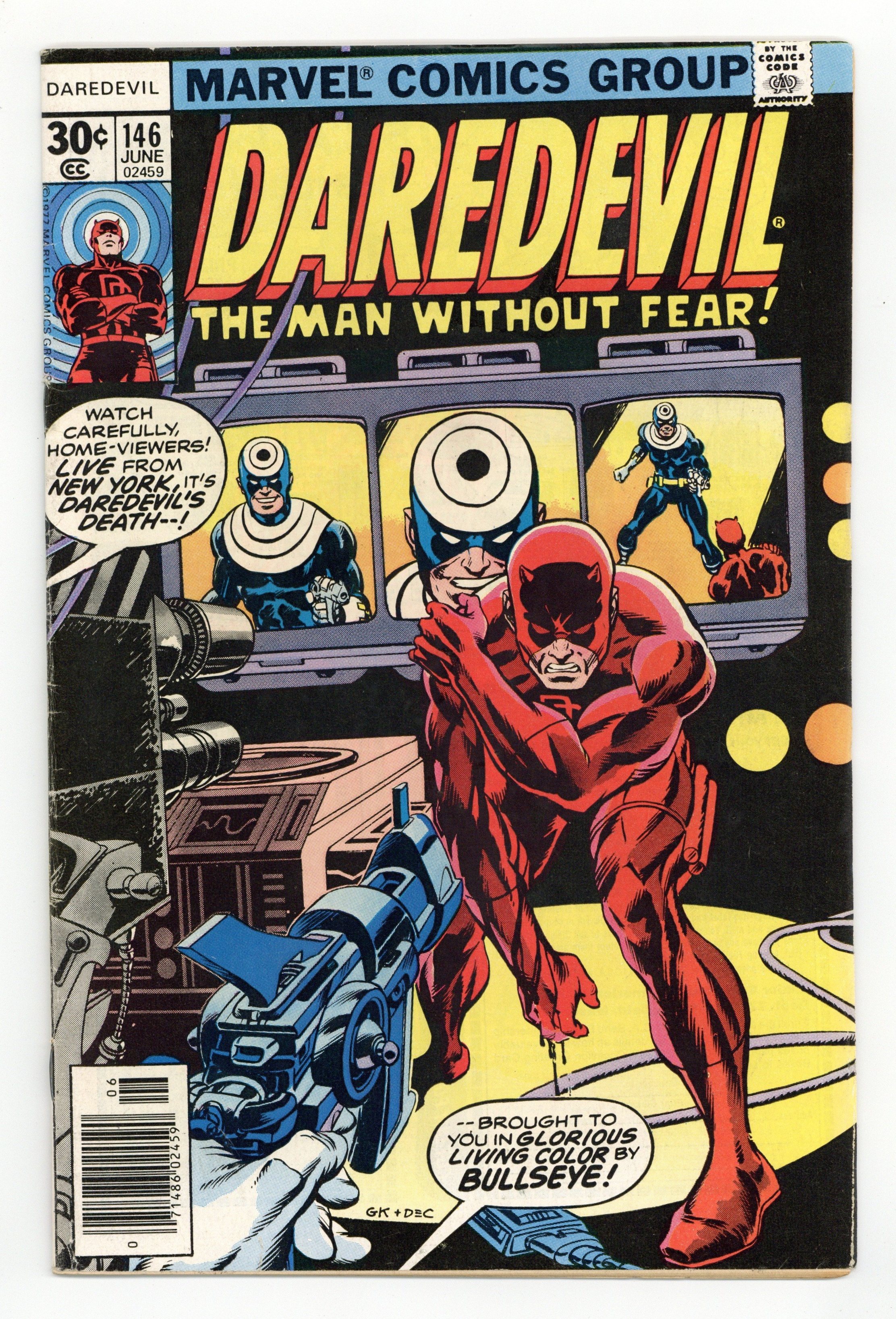 Tags: Marvel Legacy Numbering: Daredevil (part 146), Daredevil$15.50"Duel!" Written by Jim Shooter. Pencils by Gil Kane. Inks by Jim Mooney. Cover pencils by Gil Kane, inks by Dave Cockrum. Matt tries to stop Bullseye from robbing a gun store and gets beaned in the head with a golf ball wrecking his radar sense. Bullseye takes over a TV studio and challenges DD to fight him. DD has to take down the master marksman with his radar sense fading in and out. Notes: Letter to the editor from writer Peter Sanderson. This is the 30-cent cover price edition. There also exists a 35-cent cover price edition which had limited distribution (for market testing). Cover price $0.30.