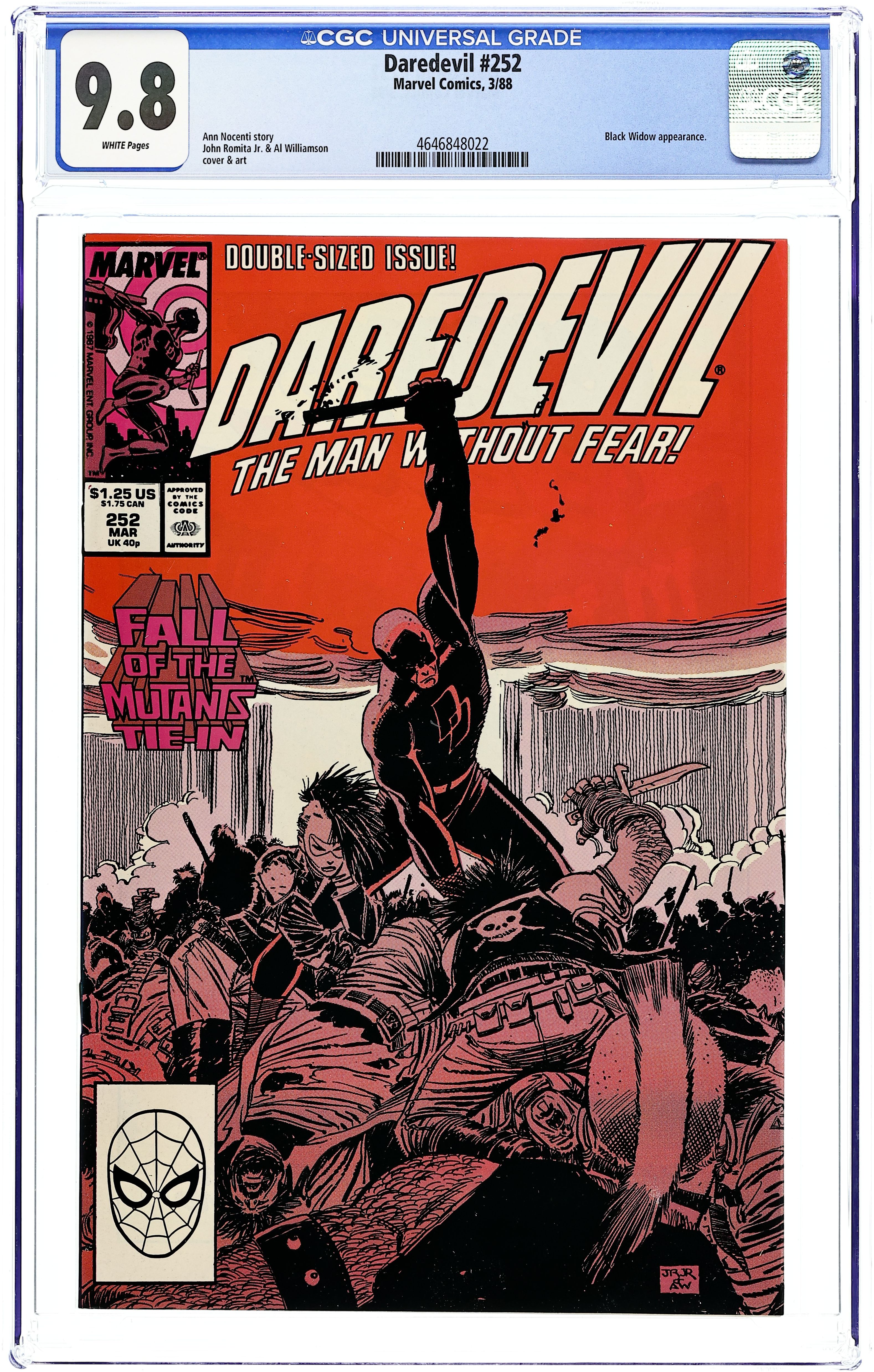 Cover pencils by John Romita, Jr., inks by Al Williamson. Ground Zero, script by Ann Nocenti, pencils by John Romita, Jr., inks by Al Williamson; New York is in a blackout due to the assault by Apocalypse's Horsemen, and DD and crew have to keep Ammo and his gang away from the ordinance they are trying to steal; Fall of the Mutants Tie-In. 48 pgs. Cover price $0.75. Cover price $0.75.