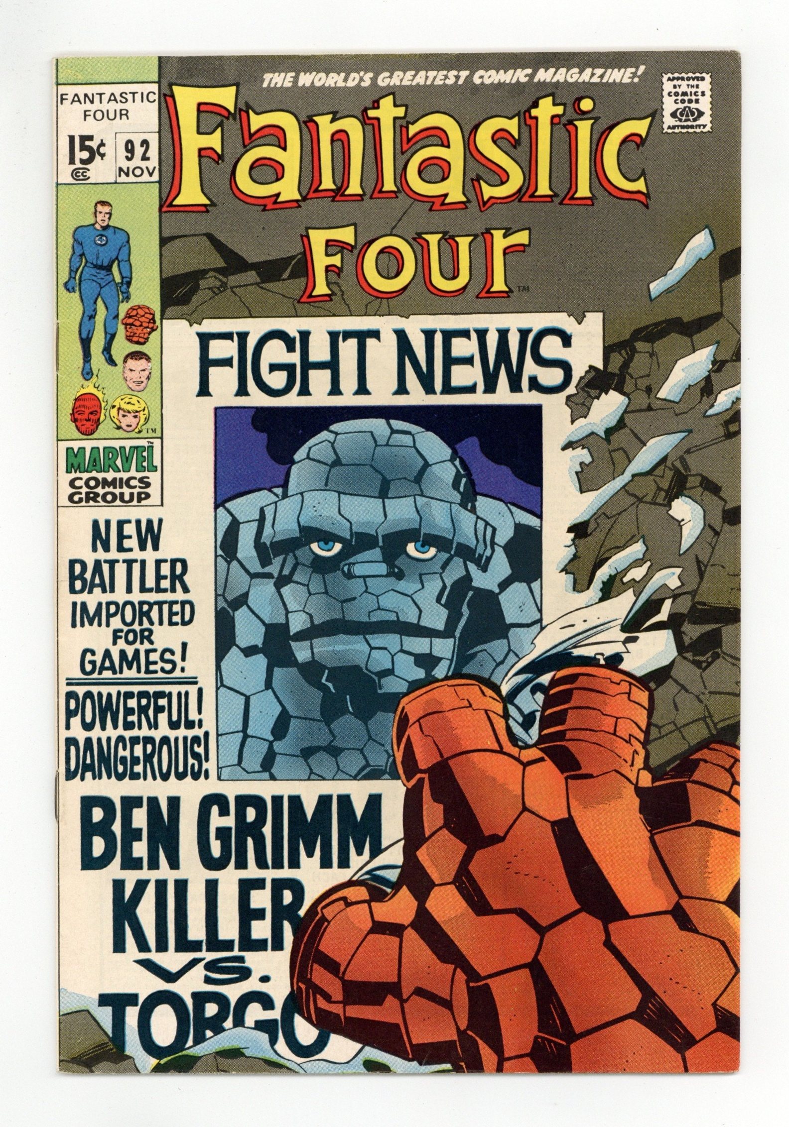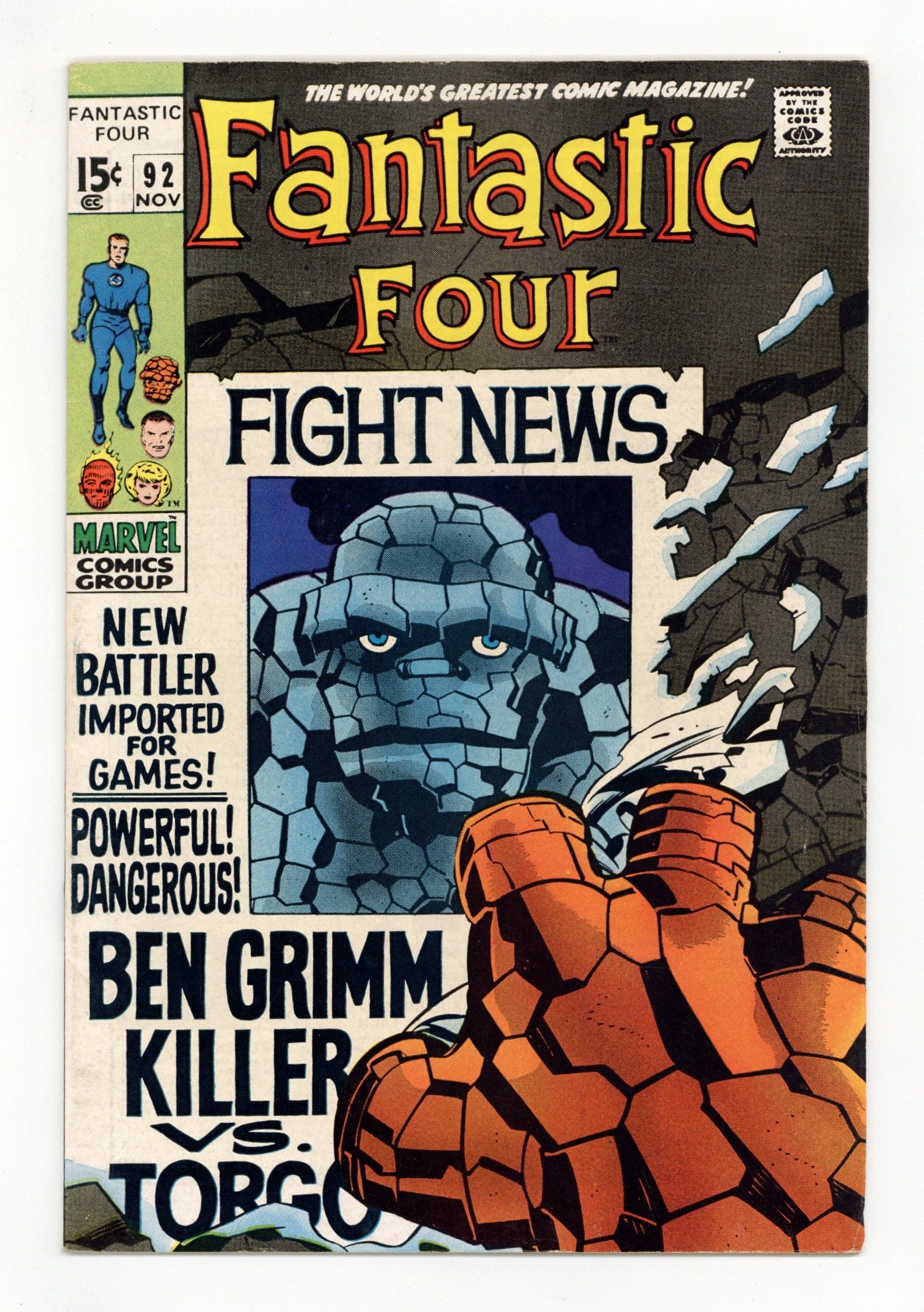 "Ben Grimm, Killer!" Part 3 of 4. Written by Stan Lee. Pencils by Jack Kirby. Inks by Joe Sinnott. Cover by Jack Kirby and Joe Sinnott. Trapped on the planet Kral in the Skrull galaxy, Ben Grimm waits for his turn in the arena of death! The Thing's scheduled opponent is his cellmate, Torgo! The powerful mechanoid from the planet Mekka! At the Great Games, the Thing will fight for Boss Barker's cartel, while Torgo will battle for Lippy Louie's racket! But is there any chance Ben could convince Torgo to fight with him for life…instead of against him for death? Meanwhile back on Earth, Reed surmises that the Skrulls must be behind Ben's disappearance! Can Mr. Fantastic, Crystal, and the Human Torch reach Kral before the death-duel begins? Cameo appearance by the Invisible Girl. (Notes: The letters page includes a letter from comics publisher Howard Keltner of Star-Studded comics fanzine fame.) 36 pgs. Cover price $0.15.