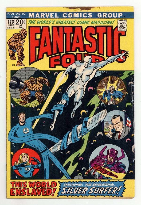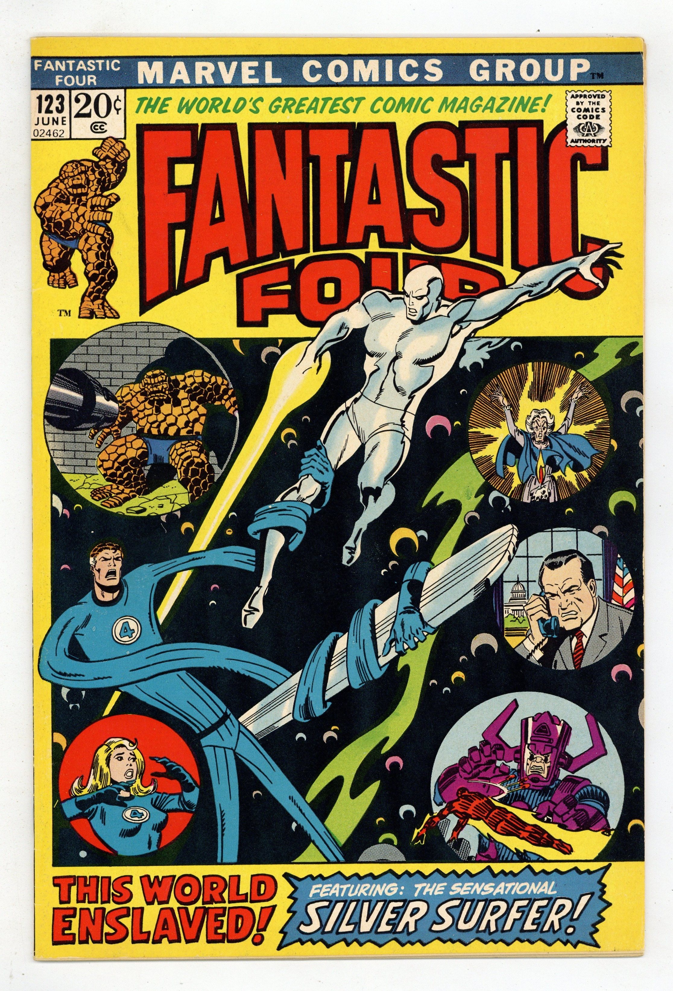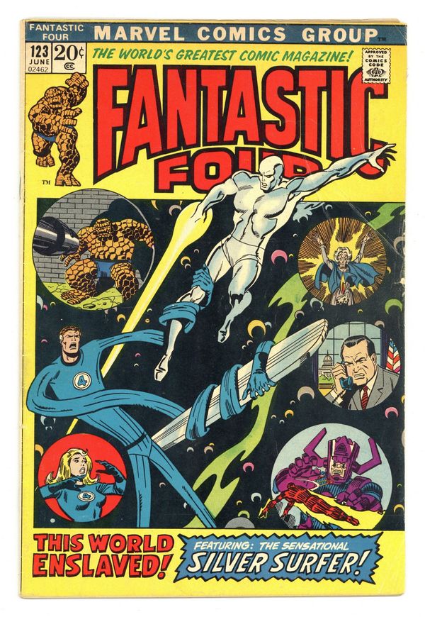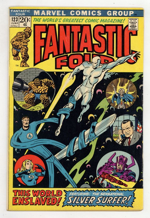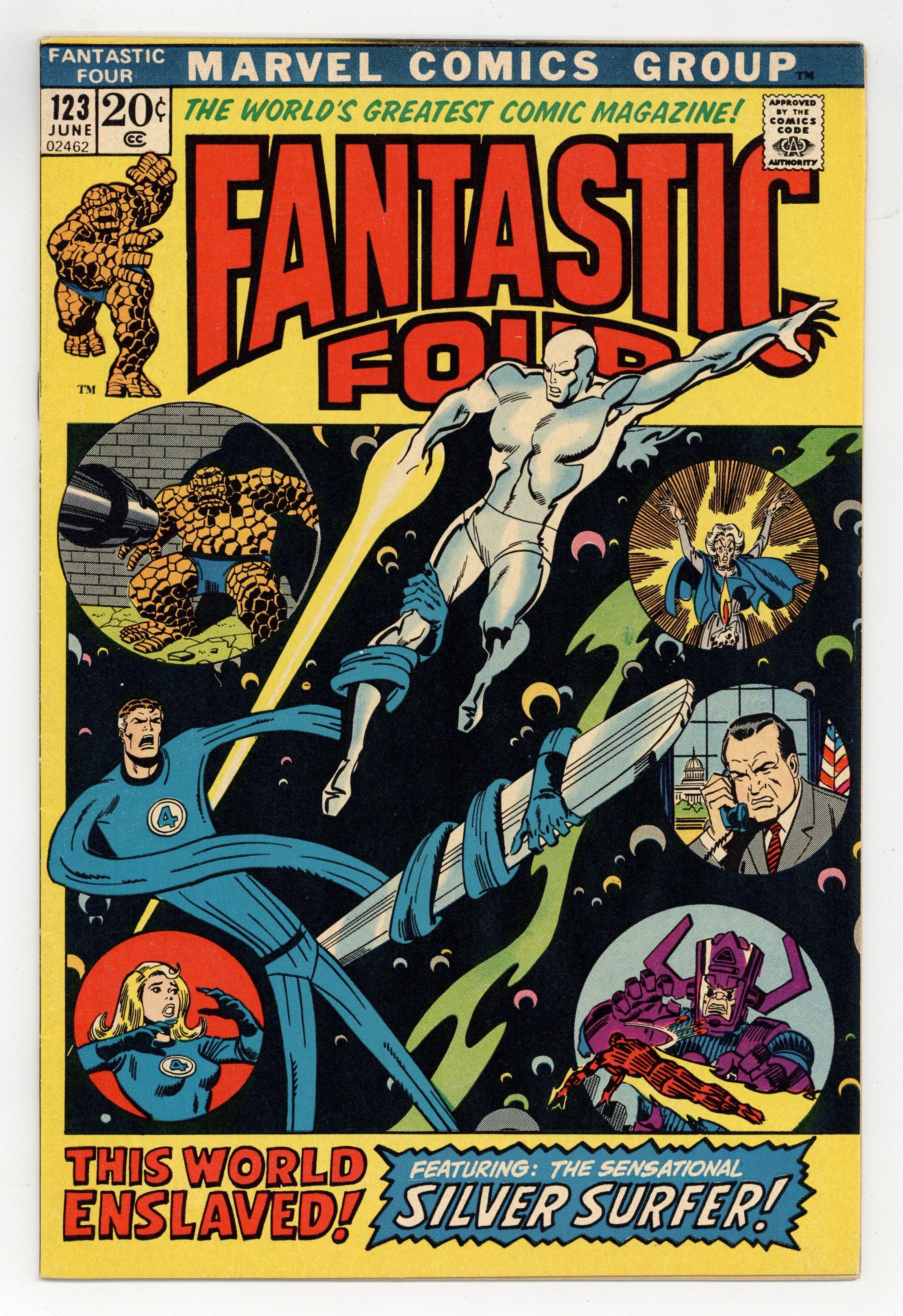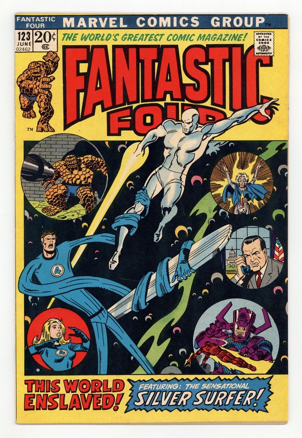 The Silver Surfer and Galactus guest star in "This World Enslaved! " Part 4 of 4 . Script by Stan Lee. Pencils by John Buscema. Inks by Joe Sinnott. Cover by Sal Buscema. With a bold maneuver, Reed Richards turns the tables on the Devourer of Worlds! After sneaking onboard Galactus' starship, Mr. Fantastic threatens to destroy it unless the cosmic Ravager departs from Earth immediately! Will Reed's gallant gamble succeed? Possibly so, but first Mr. Fantastic has to convince the Silver Surfer, Agatha Harkness, General Thunderbolt Ross, and President Richard Nixon to trust him! The FF are going "all in" vs. Galactus! Will it be blackjack or bust? Cameo appearance by Franklin. (Notes: Galactus appears next in Thor 225. The Fantastic Four tangle with Galactus again in FF 172 thru 175. This four-part story was reprinted in Marvel Treasury Edition 21. The letters page includes a letter from comics editor David McDonnell. This issue includes a full-page ad for the first issue of the Hero For Hire series, later renamed Power Man and Iron Fist.) 36 pgs. Cover price $0.20.