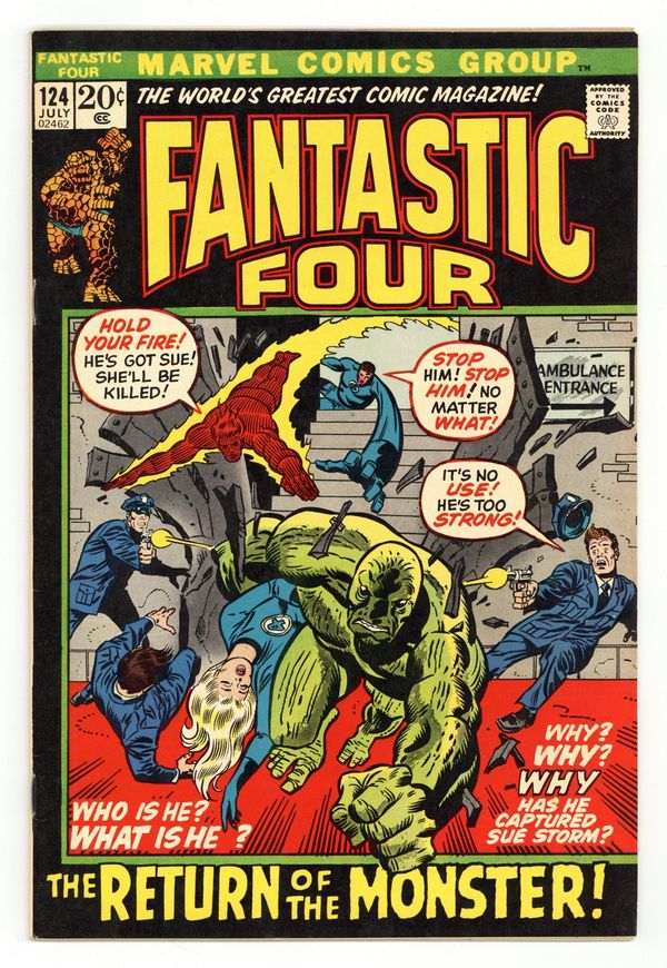 "The Return of the Monster!" Part 1 of 2. Script by Stan Lee. Pencils by John Buscema. Inks by Joe Sinnott. Cover by John Buscema and Joe Sinnott. The FF's cataclysmic confrontation with Galactus and the Silver Surfer is over! But on the way back to the Baxter Building, Reed collapses from total exhaustion; so Ben, Sue, and Johnny rush him to the East Side Medical Pavilion for recovery! Ironically, just a few hours earlier a strange monster was reported inside the medical pavilion. Is someone or something stalking the hospital? After the Thing is knocked out and the Invisible Girl is kidnapped, it certainly appears so! Fortunately though, the ever-present Human Torch is ready to challenge the monster! (Note: The Monster from the Lost Lagoon previously appeared in Fantastic Four 97.) 36 pages Cover price $0.20.
