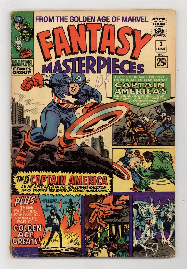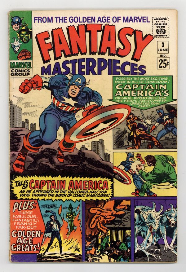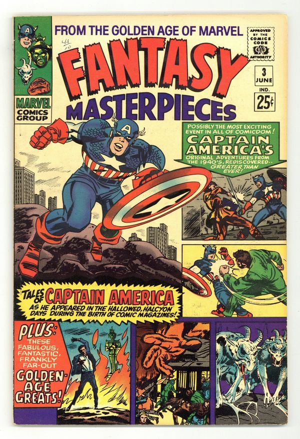 $7.50Cover pencils by Jack Kirby (Captain America), Gene Colan, and Don Heck, inks by Frank Giacoia (Captain America), Gene Colan, and Don Heck. Reprints. "The Hunchback of Hollywood and the Movie Murder" from Captain America Comics #3, script by Joe Simon and Jack Kirby, pencils by Jack Kirby, inks by Bernie Klein and George Roussos; Death and terror lurk behind the scenes of a Hollywood movie set as Cap and Bucky hunt a hunchback madman, whose bloody hand seeks to stop the grinding cameras from filming the truth for a liberty loving public. "I Am the Prisoner of the Voodoo King!" from Journey Into Mystery #82, art by Gene Colan; A criminal being brought to prison from a jungle outpost escapes into the jungle; He happens upon a tribe worshipping a gold idol and steals it. "Beware the Uboong!" from Strange Tales #100, art by Don Heck; Americans flee Uranus due to ferocious wildlife; The Soviets take the opportunity to land their own expedition, but because they ignore the American warnings they do not realize that the sheep-like creatures in the mountains are the deadly Uboongi. "Bruttu" from Tales of Suspense #22, art by Don Heck; An often-bullied scientist accidentally transforms himself into a monster, and is attacked when he cant make himself understood; In his new form he discovers that the girl hed thought out of his league really loves him, and manages to make himself human again. "I Saw the End of the World" from Strange Tales #73, art by Steve Ditko; A scientist builds a time machine and discovers that time is a loop with all events repeating themselves endlessly for eternity. "The Weird Case of the Pludering Butterfly and the Ancient Mummies!" from Captain America Comics #3, script by Joe Simon and Jack Kirby, pencils by Jack Kirby, inks by Reed Crandall; Laughing at law and order, the Butterfly loots a museum of its priceless treasures until Captain America and Bucky steps in to clip his wings. 68 pgs., full color. Cover price $0.25.