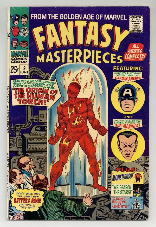 Cover pencils by Gil Kane, inks by Frank Giacoia. Reprints. "The Human Torch" from Marvel Comics #1, script and art by Carl Burgos; After the Scientist's Guild convinces inventor Horton to dispose of his new creation, a "human torch", a clever criminal figures out a way to use this creation for his own evil purposes. "The Sub-Mariner" from Marvel Mystery #4, script and art by Bill Everett; Betty, concerned on what effect the Nazi submarine warfare has had on ocean-going travel and commerce, enlists the aid of the Sub-Mariner and his aerial subs to deal with the problem. "Monsteroso" from Tales To Astonish #18, art by Steve Ditko; A creature hatches from an egg and imagines itself lord of all it surveys, but it is suddenly drowned, as it is only a microbe in a scientist's culture. "We Search The Stars!" from Strange Tales #110, script by Stan Lee (plot) and Larry Lieber (script), pencils by Larry Lieber, inks by Matt Fox; A space expedition discovers what they believe is a savage human-like species and flee, not suspecting that they are an advanced psychic race able to meet all their needs through thought. "I Don't Believe In Ghosts!" from Journey Into Mystery #77, script by Larry Lieber and Stan Lee (plot), pencils by Jack Kirby, inks by Dick Ayers; A man offers fifty thousand dollars to anyone who can show him a ghost but, time after time, he proves that there is a rational explanation behind the sightings. "Captain America: A Personal Accounting Of His Smashing a Spy Ambush" from Captain America Comics #10, script and pencils by Joe Simon and Jack Kirby, inks by Joe Simon; Cap and Bucky face the unparalled fury of a female Nazi agent, bent on capturing America's only model of the new rapid fire grenade gun for Hitler. 68 pgs., full color. Cover price $0.25.