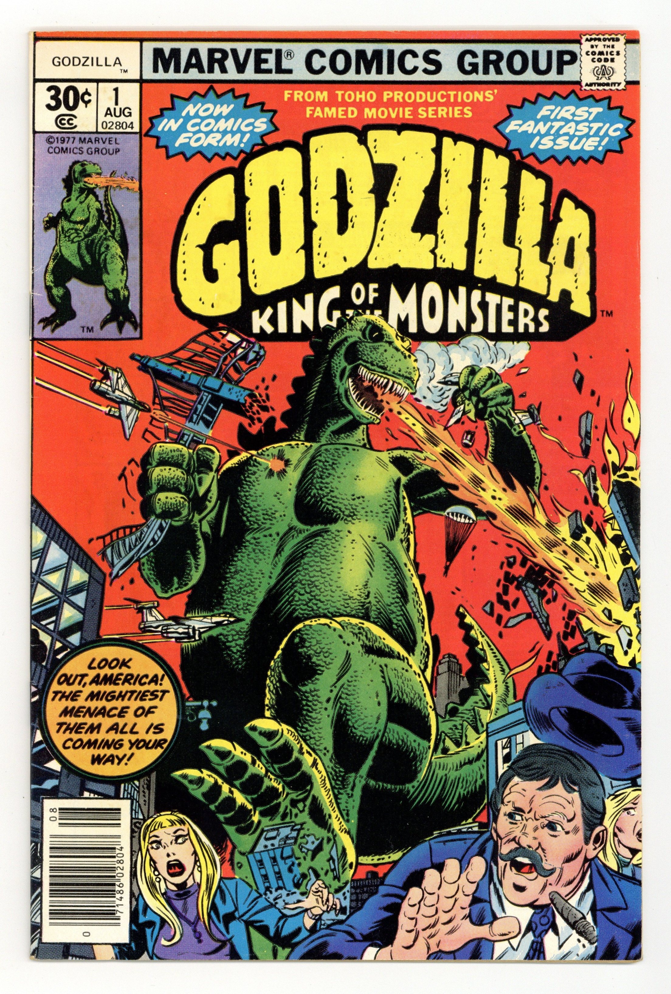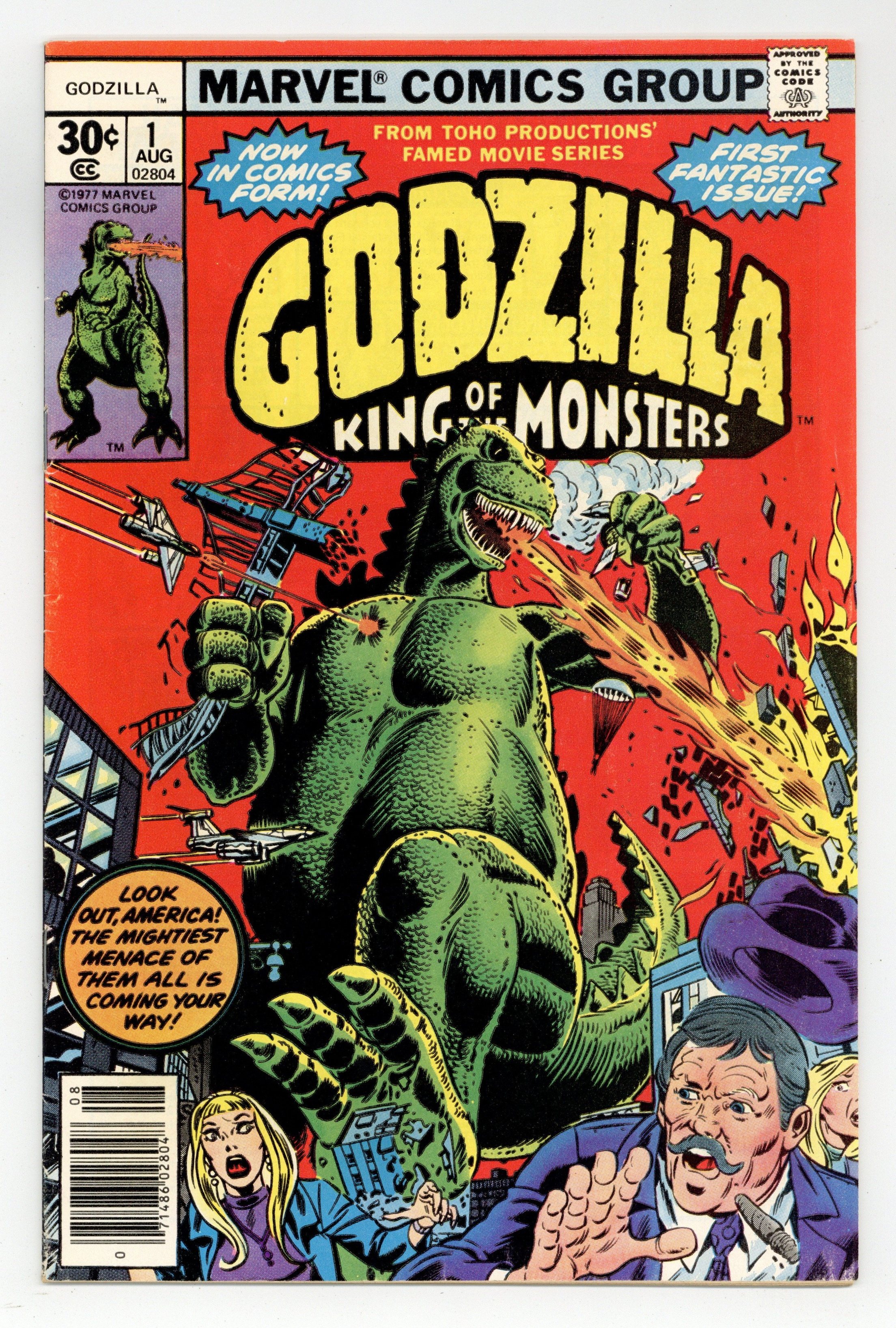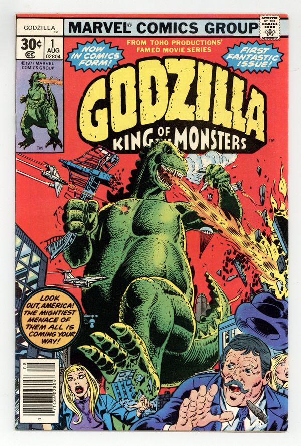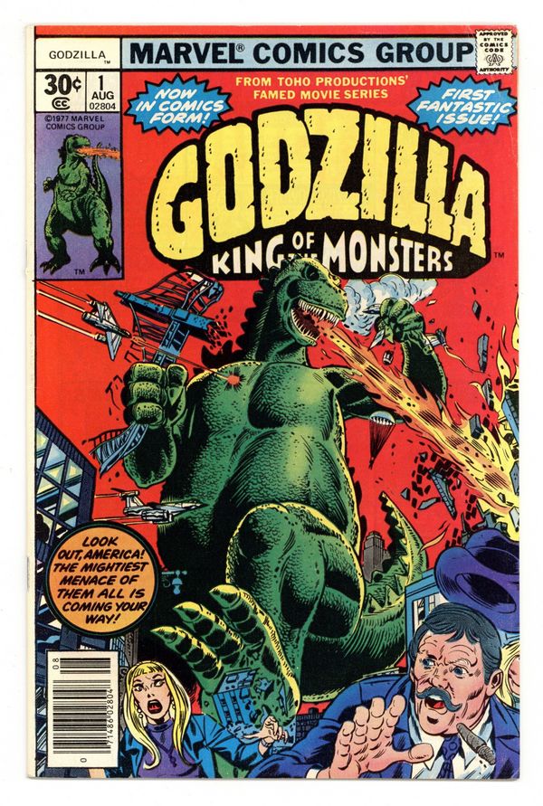 $136.00"The Coming!" Guest-starring Nick Fury and S.H.I.E.L.D. Story by Doug Moench. Art by Herb Trimpe and Jim Mooney. The slumbering leviathan known as Godzilla has awaken and rises out of the sea off the shores of Alaska. This reptilian titan has already left Japan devastated and now has made his way to America. With a tail that can smash mountains to dust and fiery breath born out of the Atomic Age, is there anything that can stop this monster's rampage? Right from the Toho Productions' famed movie series comes Godzilla, King of the Monsters. Cover price $0.30.