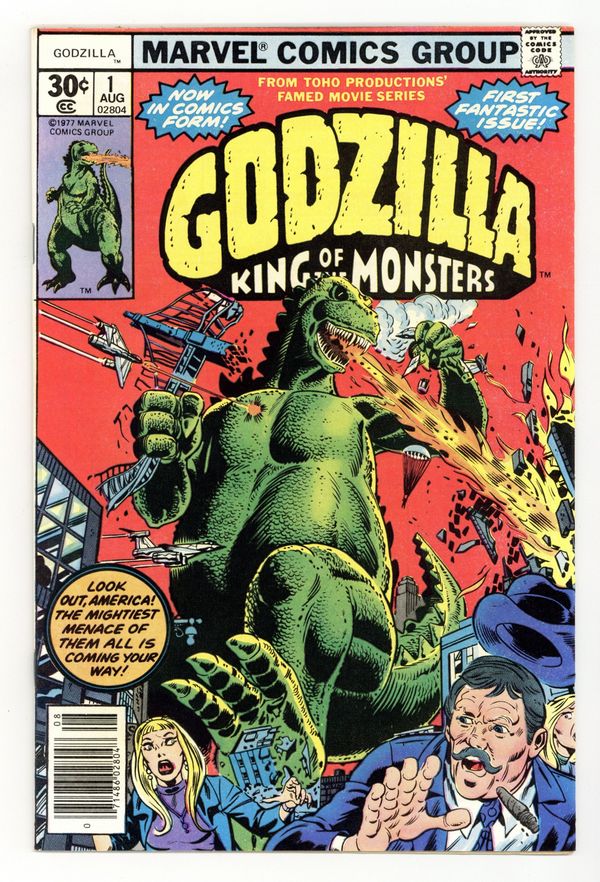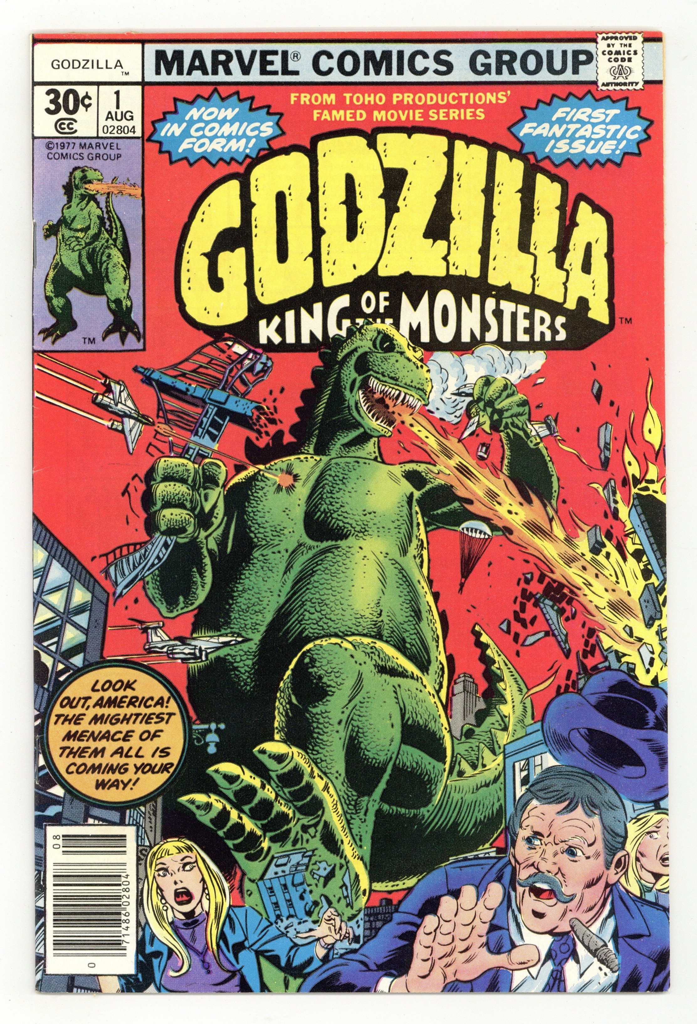 $113.00"The Coming!" Guest-starring Nick Fury and S.H.I.E.L.D. Story by Doug Moench. Art by Herb Trimpe and Jim Mooney. The slumbering leviathan known as Godzilla has awaken and rises out of the sea off the shores of Alaska. This reptilian titan has already left Japan devastated and now has made his way to America. With a tail that can smash mountains to dust and fiery breath born out of the Atomic Age, is there anything that can stop this monster's rampage? Right from the Toho Productions' famed movie series comes Godzilla, King of the Monsters. Cover price $0.30.