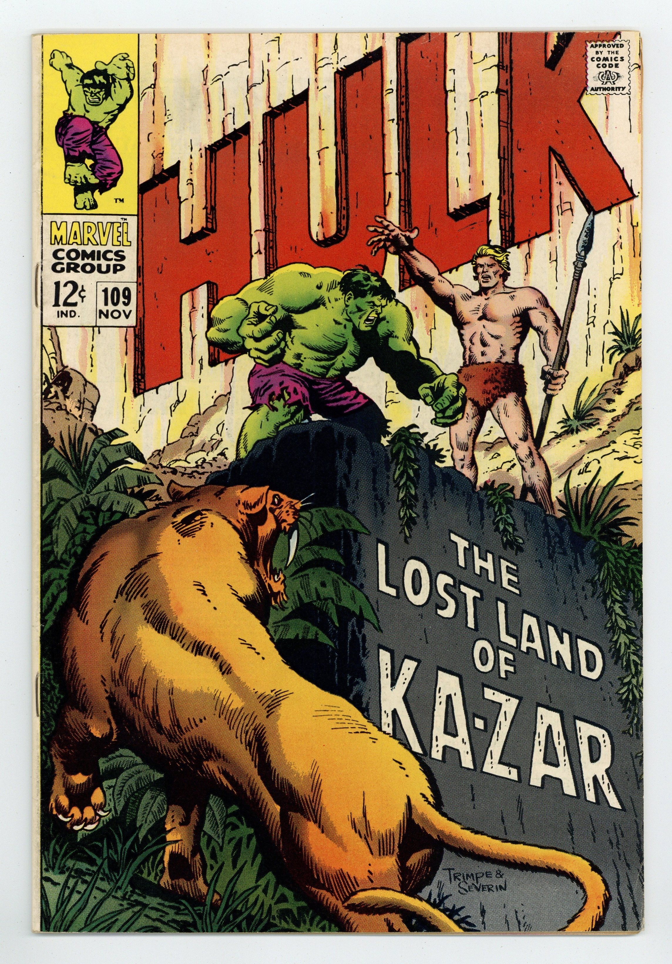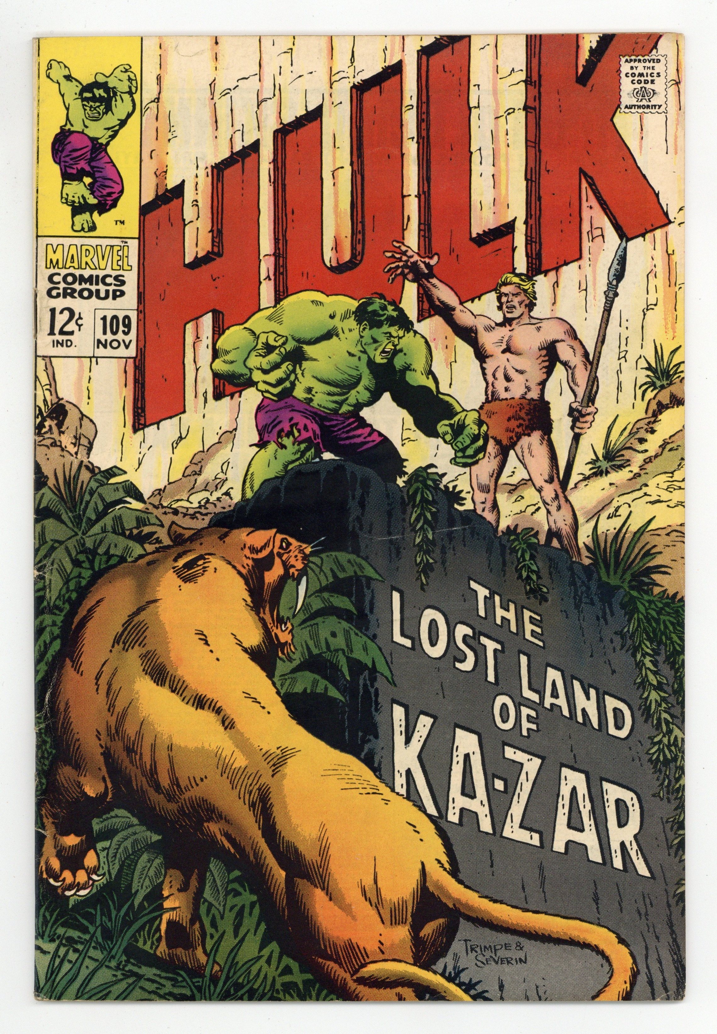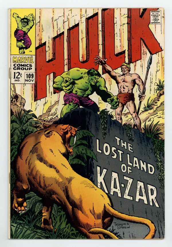 Tags: Marvel Legacy Numbering: Hulk (part 109), Hulk$75.00Cover pencils by Herb Trimpe, inks by John Severin. The Monster and the Man-Beast!, script by Stan Lee, pencils by Frank Giacoia (layouts) and Herb Trimpe, inks by John Severin; The Hulk stops a deadly Chinese missile from being launched but the huge detonation drops him into the Savage Land where he transforms back into Bruce Banner; Being rescued by Ka-Zar from the Swamp Men, the jungle lord asks for Banner's help in deactivating a mysterious machine that is making weather all over the world to go wild and will eventually lead to the destruction of earth; The Swamp Men renew their attack and Banner becomes the Hulk to face the threat, totally forgetting about the deadly machine he was supposed to deactivate. Letter to the editor from future pro Tony Isabella. 36 pgs. Cover price $0.12.