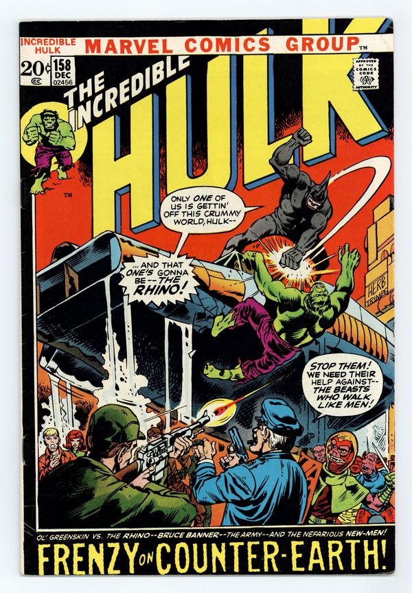 Cover art by Herb Trimpe. Frenzy On a Far-Away World!, script by Roy Thomas and Steve Gerber, pencils by Herb Trimpe, inks by Sal Trapani; While Hulk takes a trip to Counter-Earth where he battles the Rhino, gets involved in a New Men civil war and meets his counter alter ego (Bruce, his wife Betty and their son Bobby), back on his own Earth, Betty Ross and Glenn Talbot are busy getting married. 36 pgs. $0.20. Cover price $0.20.