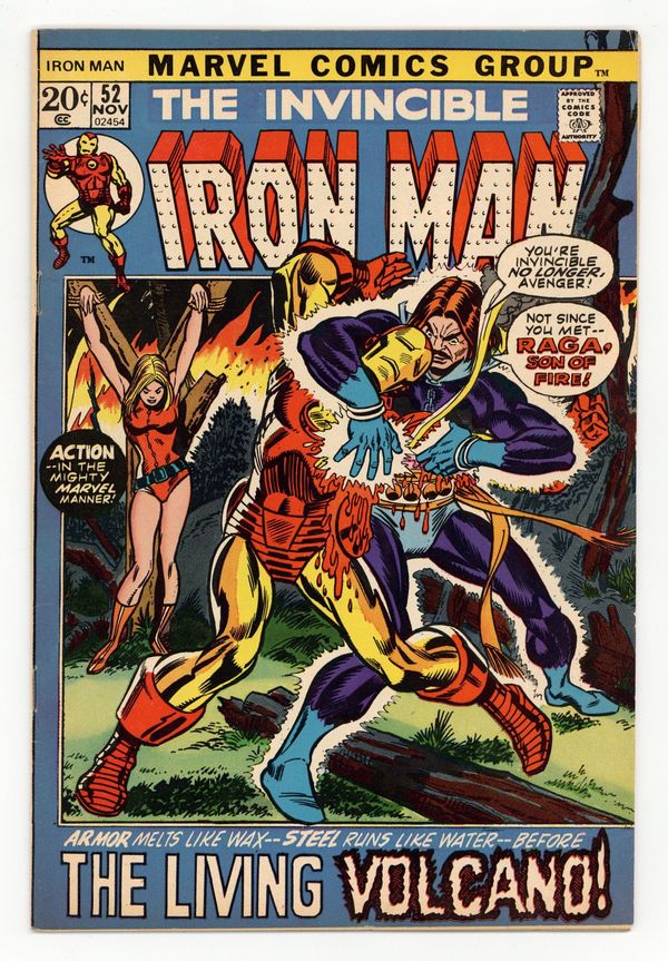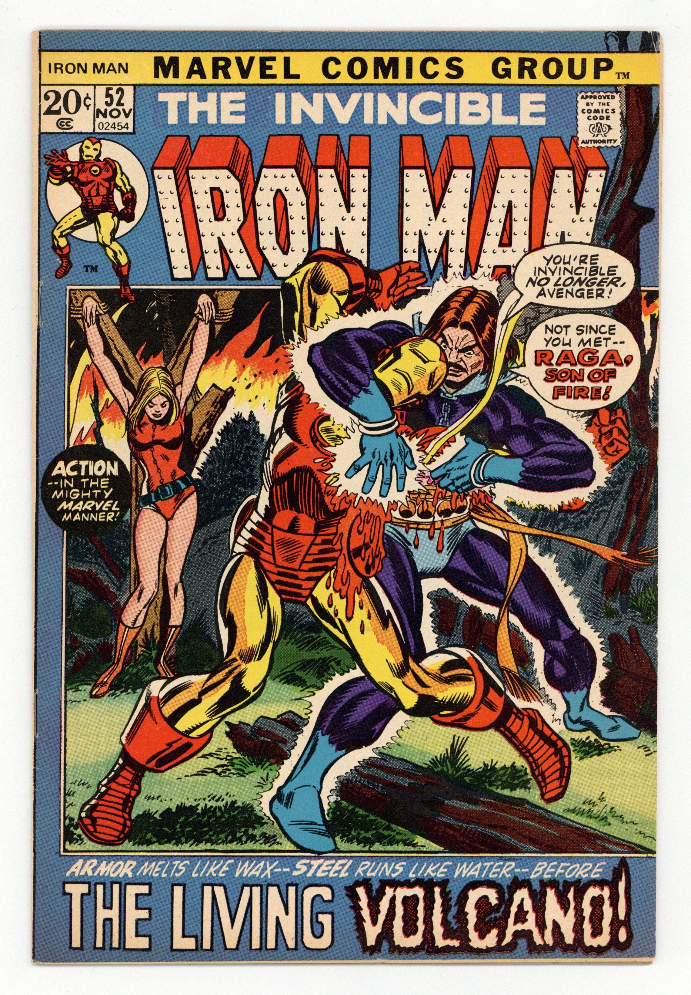 "Raga: Son of Fire!" Story by Mike Friedrich. Art by George Tuska and Vince Colletta. Cover by Gil Kane. Tony Stark decides to get away from New York for a while, so he takes a vacation to California. It's a very relaxing trip until a new villain, Raga, the Son of Fire, starts a forest fire in the Santa Monica Mountains! Shell-Head appears to be on the way to victory until he becomes trapped in a lava flow! (Note: The letters page includes a letter from comics editor David McDonnell. The letters page also includes a letter from Robert Kuntz, one of the early contributors and creators of role-playing games including Dungeons and Dragons.) 32 pages Cover price $0.20.