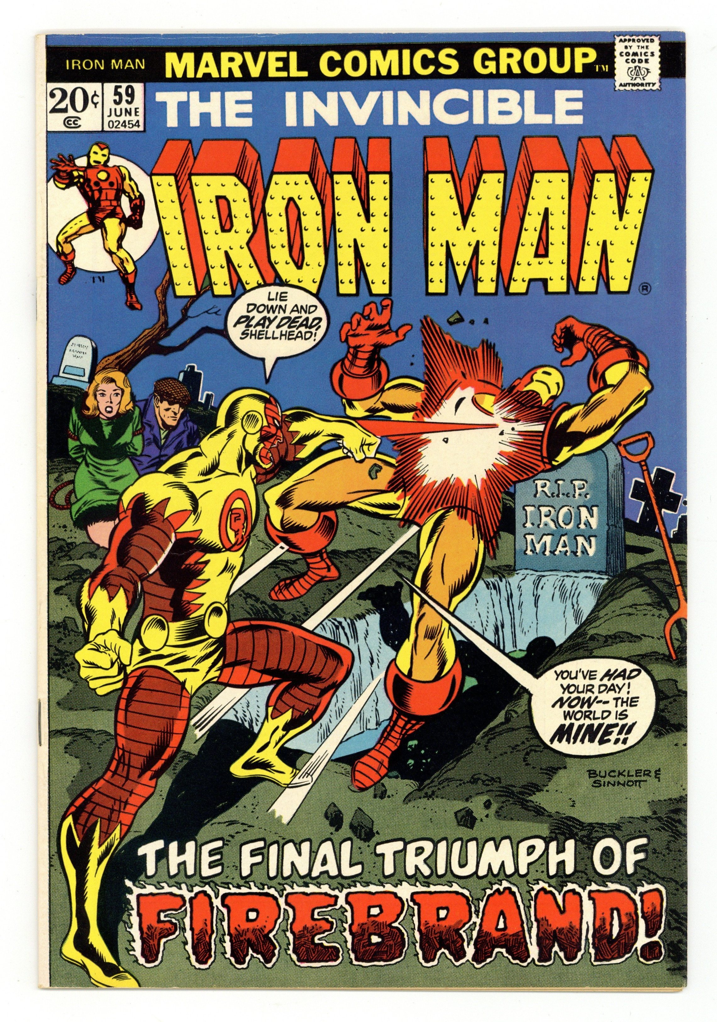 Tags: Marvel Legacy Numbering: Iron Man (part 59), Iron Man$11.25"A Madness in Motown!" Story by Mike Friedrich. Art by George Tuska and Mike Esposito. Cover by Rich Buckler and Joe Sinnott. Tony Stark takes a business trip to Detroit to oversee a stock transfer involving the shares of Roxanne Gilbert, but Tony does not know that Roxanne's brother is...Firebrand! Iron Man and Firebrand settle their differences in a grave yard. Meanwhile, Marianne Rodgers is admitted to a sanitarium. 32 pages Cover price $0.20.