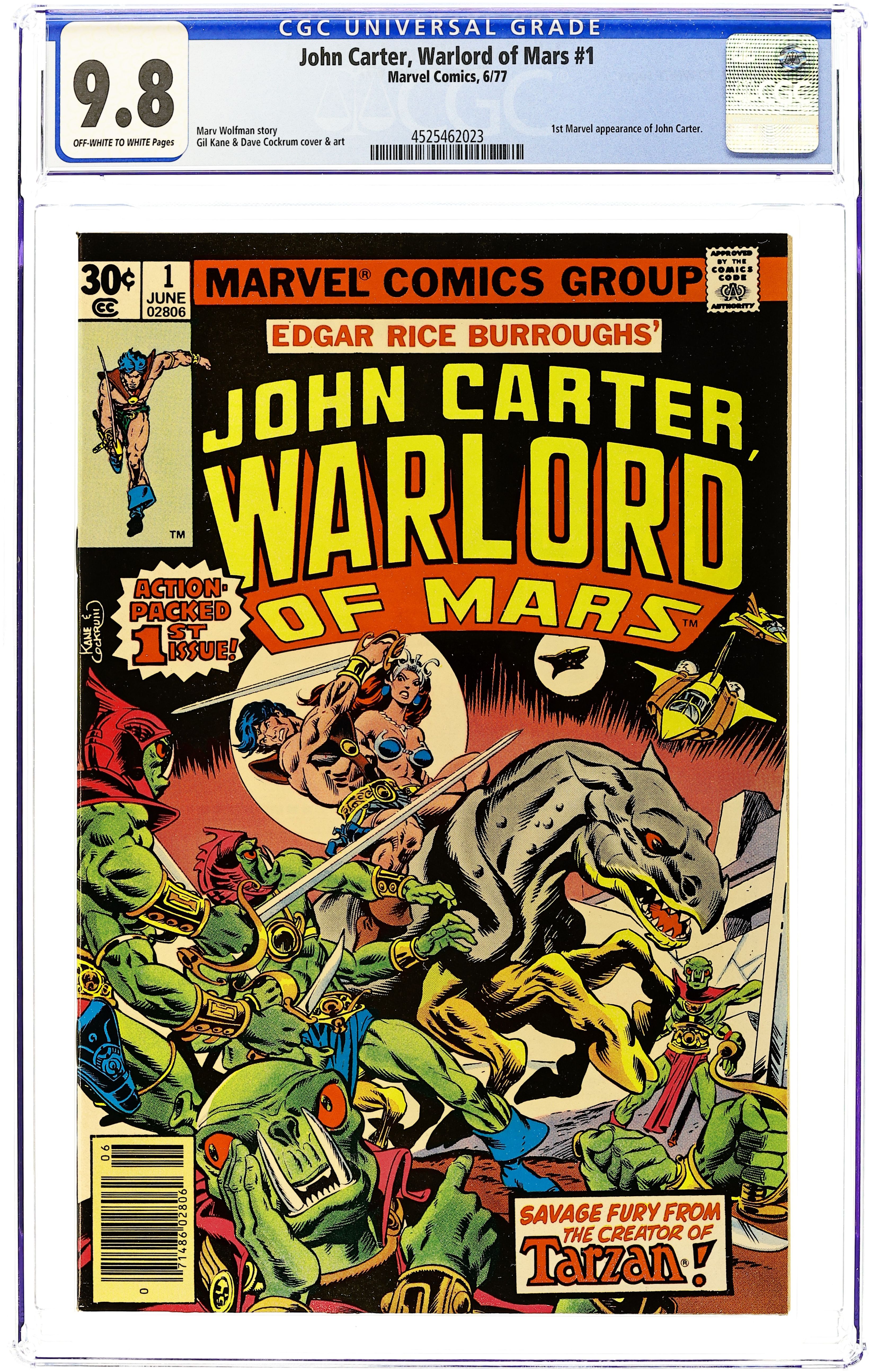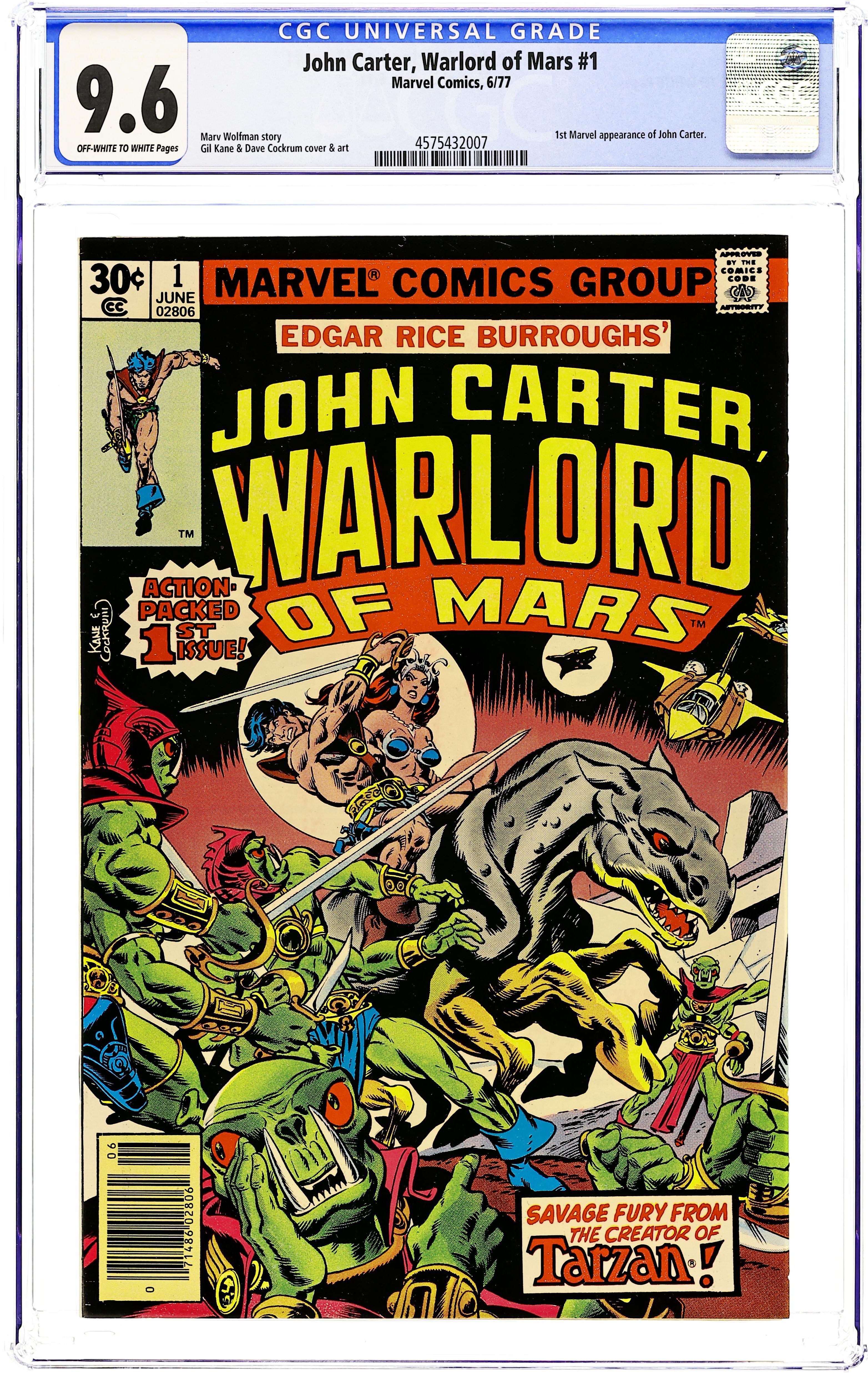 Based on Edgar Rice Burroughs' Martian novels, John Carter Warlord of Mars ran for 28 issues. "Air Pirates of Mars, Part 1" finds John Carter rescuing Dejah Thoris from an army of Tharks and uncovering a plot to destroy his beloved Barsoom. Includes Welcome Back, Carter text editorial. Script by Marv Wolfman, pencils by Gil Kane, inks by Dave Cockrum. Cover by Kane and Cockrum. Cover price $0.30.
