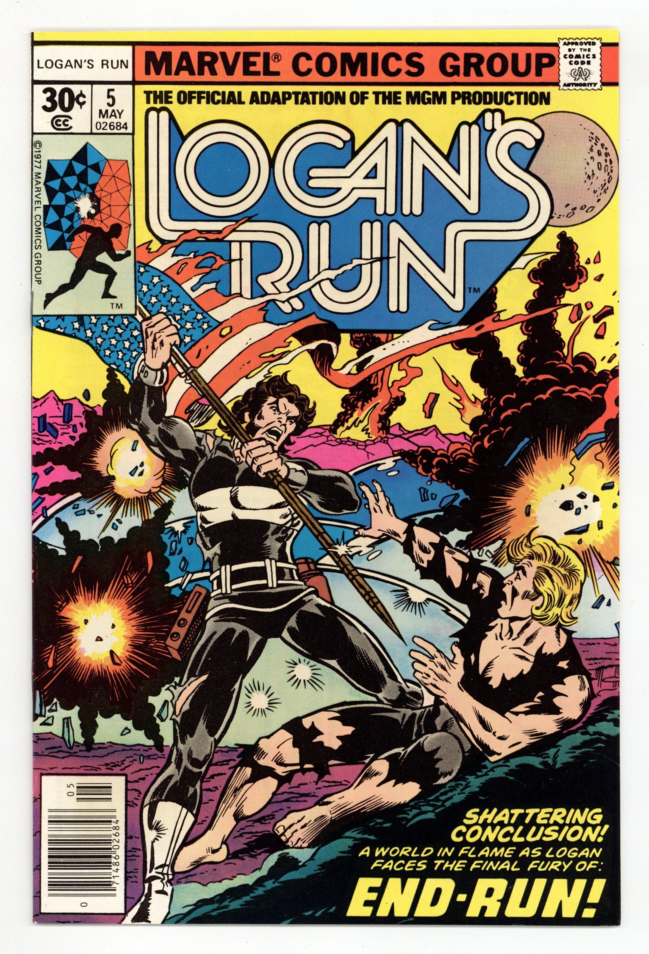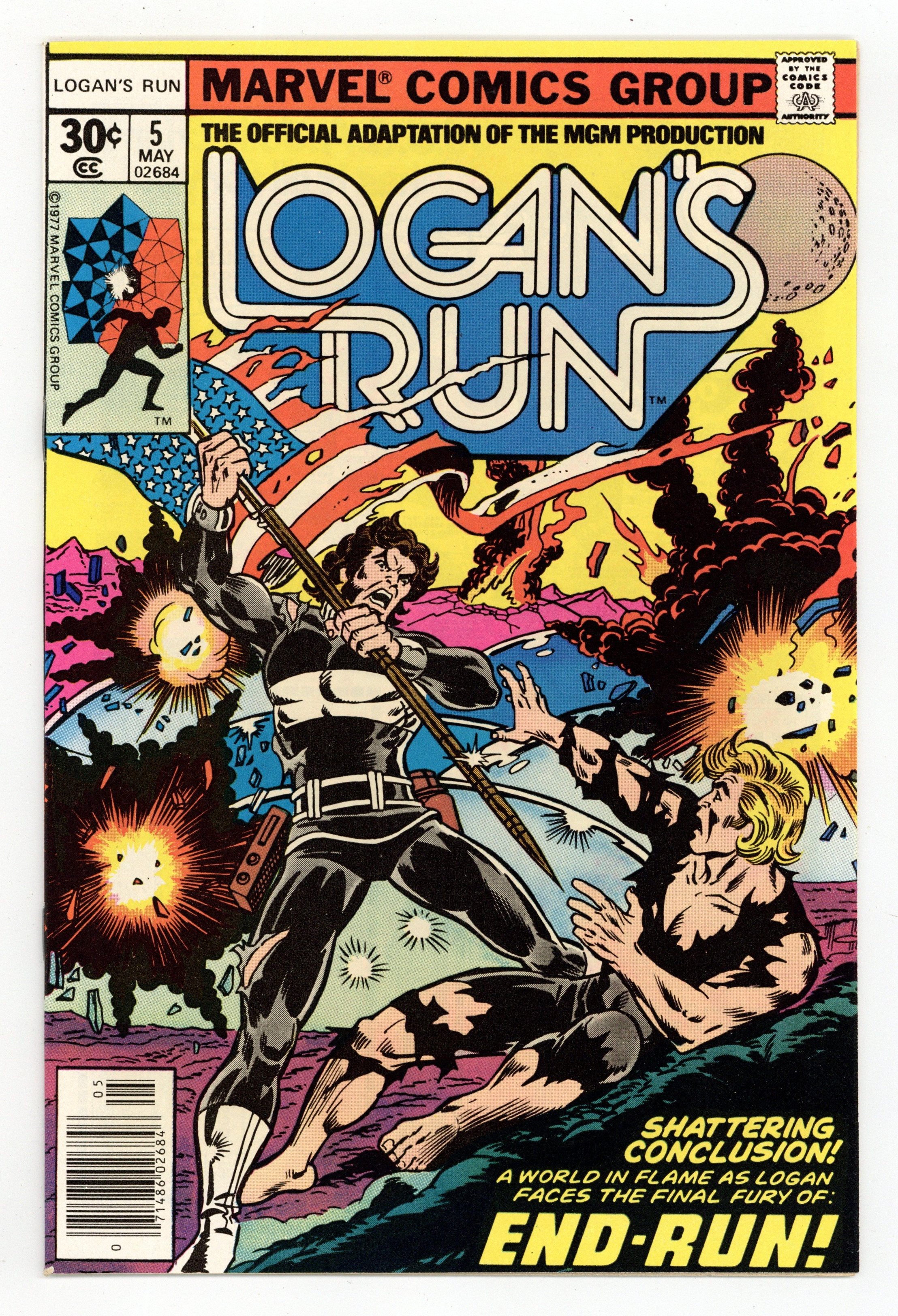 Cover by George Perez and Frank Giacoia. "End-Run". Part 5 of 5. Story by David Kraft(from the screenplay by David Zelag Goodman which was based on the novel by George Clayton Johnson and William F. Nolan). Pencils by George Perez. Inks by Klaus Janson. Logan and Jessica return home with the old man to tell everyone their lives are a lie. Captured by Sandmen, Logan is plugged into the central computer. When it quizzes him, it cannot accept the truth and explodes. Their world shattered, the cities inhabitants must leave to forge a new life in a new world. 32 pages. Full color. Cover price $0.30.