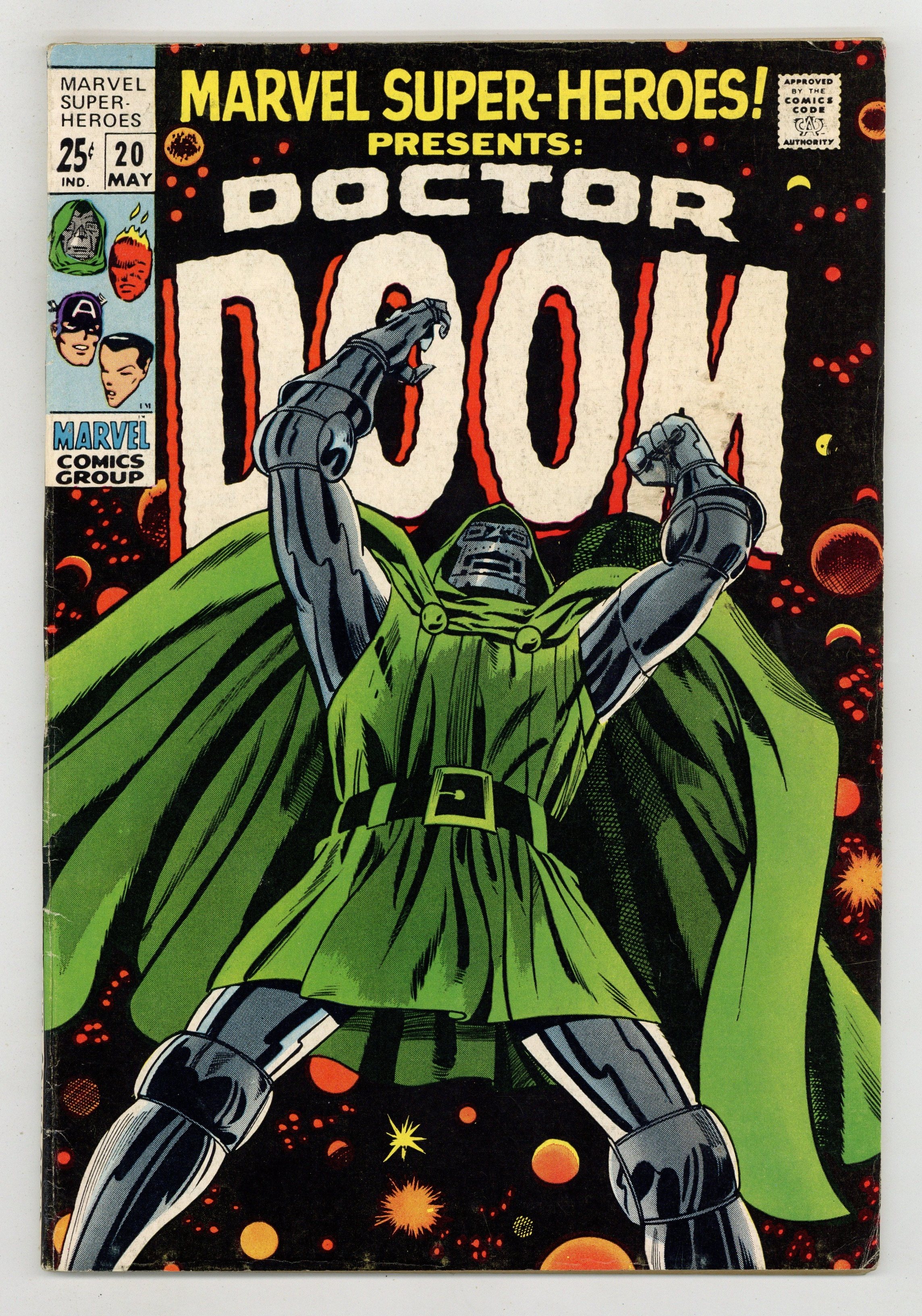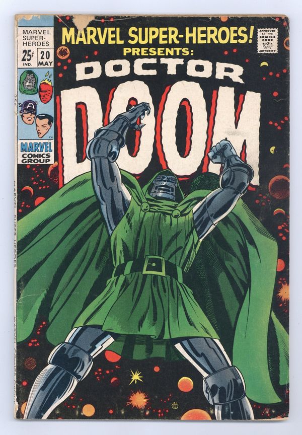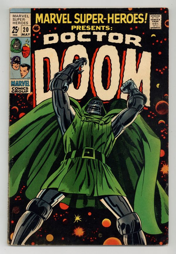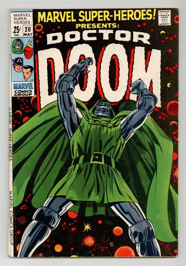 Giant-size issue. Doctor Doom stars in "This Man, This Demon!" Script by Larry Lieber and Roy Thomas, pencils by Lieber and Frank Giacoia, inks by Vince Colletta. Brief Fantastic Four appearance. The remainder of the issue contains Golden Age reprints: the Sub-Mariner by Bill Everett ("The Sub-Mariner Meets a New Enemy...Fire!"); and, from Young Men 24, the Human Torch, Captain America ("Back From the Dead!"), and the Sub-Mariner. This issue also contains a one-page ad for a Starhawk story that never appeared in Marvel Super-Heroes. John Buscema cover pencils. 68 pages, full color. Cover price $0.25.