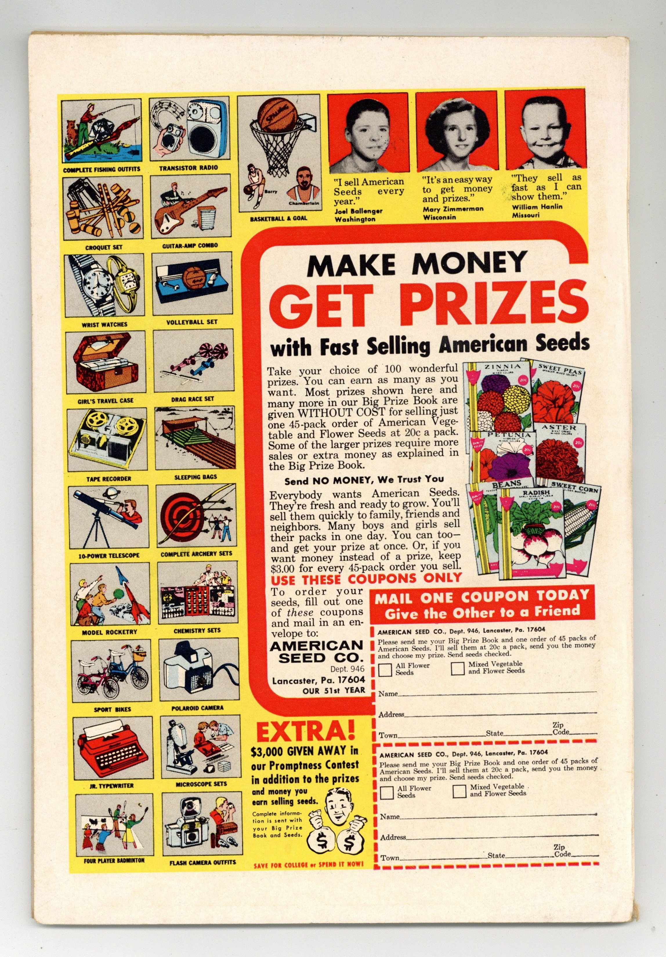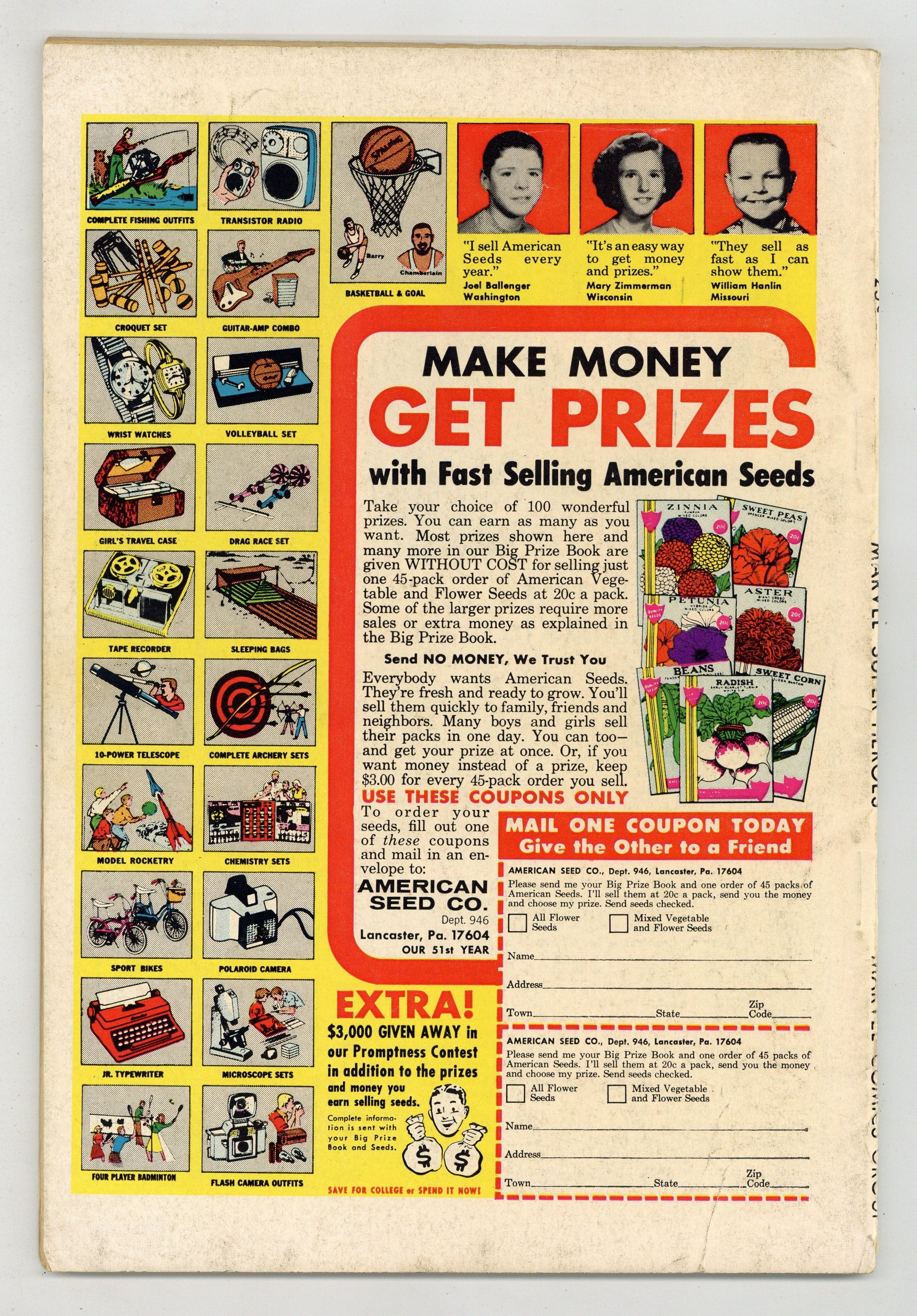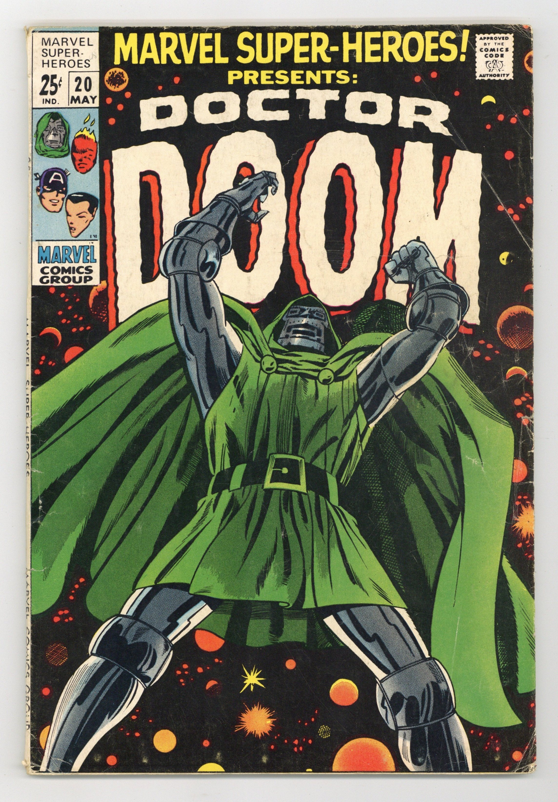 Giant-size issue. Doctor Doom stars in "This Man, This Demon!" Script by Larry Lieber and Roy Thomas, pencils by Lieber and Frank Giacoia, inks by Vince Colletta. Brief Fantastic Four appearance. The remainder of the issue contains Golden Age reprints: the Sub-Mariner by Bill Everett ("The Sub-Mariner Meets a New Enemy...Fire!"); and, from Young Men 24, the Human Torch, Captain America ("Back From the Dead!"), and the Sub-Mariner. This issue also contains a one-page ad for a Starhawk story that never appeared in Marvel Super-Heroes. John Buscema cover pencils. 68 pages, full color. Cover price $0.25.