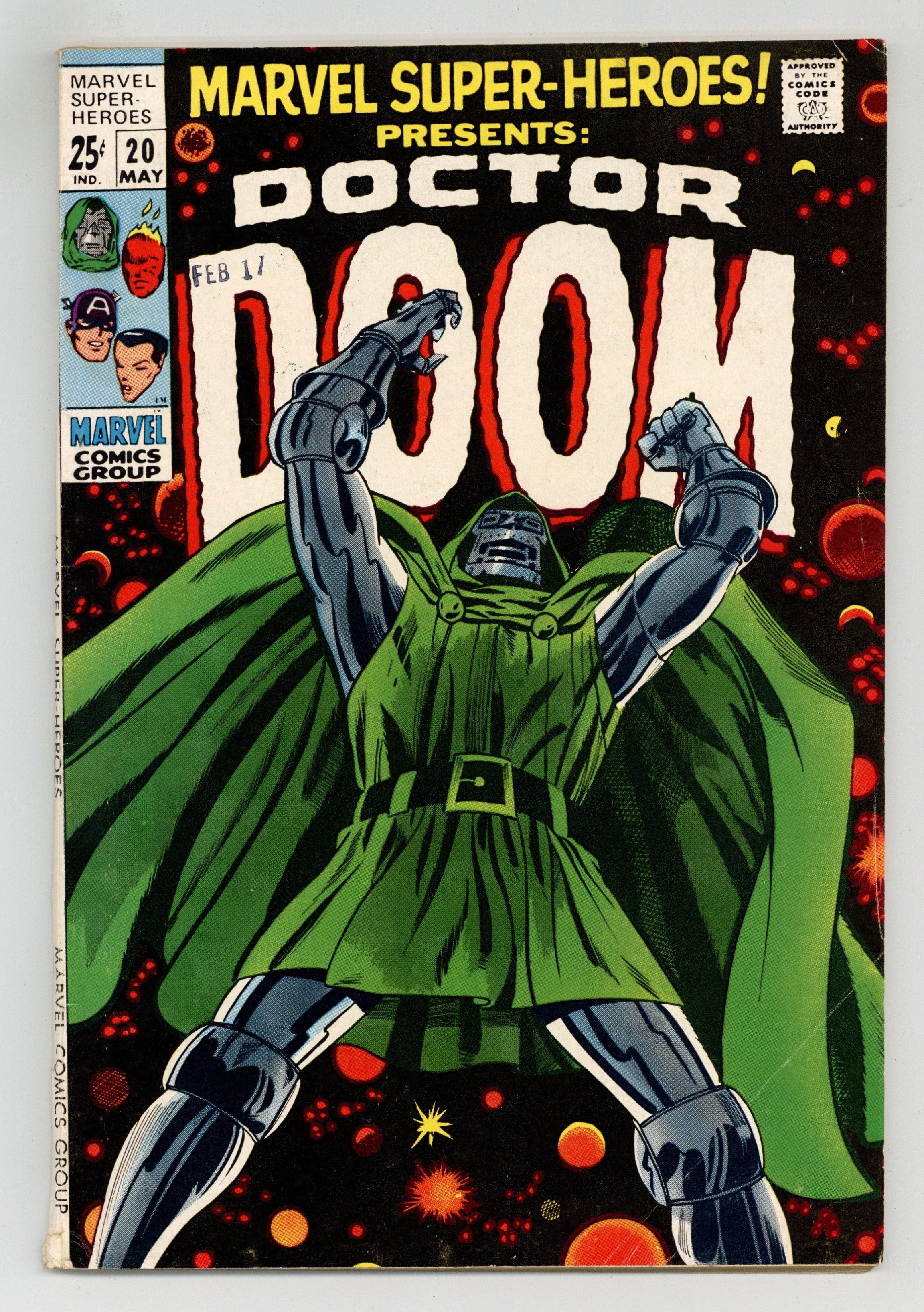 Starts Jan 3 Giant-size issue. Doctor Doom stars in "This Man, This Demon!" Script by Larry Lieber and Roy Thomas, pencils by Lieber and Frank Giacoia, inks by Vince Colletta. Brief Fantastic Four appearance. The remainder of the issue contains Golden Age reprints: the Sub-Mariner by Bill Everett ("The Sub-Mariner Meets a New Enemy...Fire!"); and, from Young Men 24, the Human Torch, Captain America ("Back From the Dead!"), and the Sub-Mariner. This issue also contains a one-page ad for a Starhawk story that never appeared in Marvel Super-Heroes. John Buscema cover pencils. 68 pages, full color. Cover price $0.25.