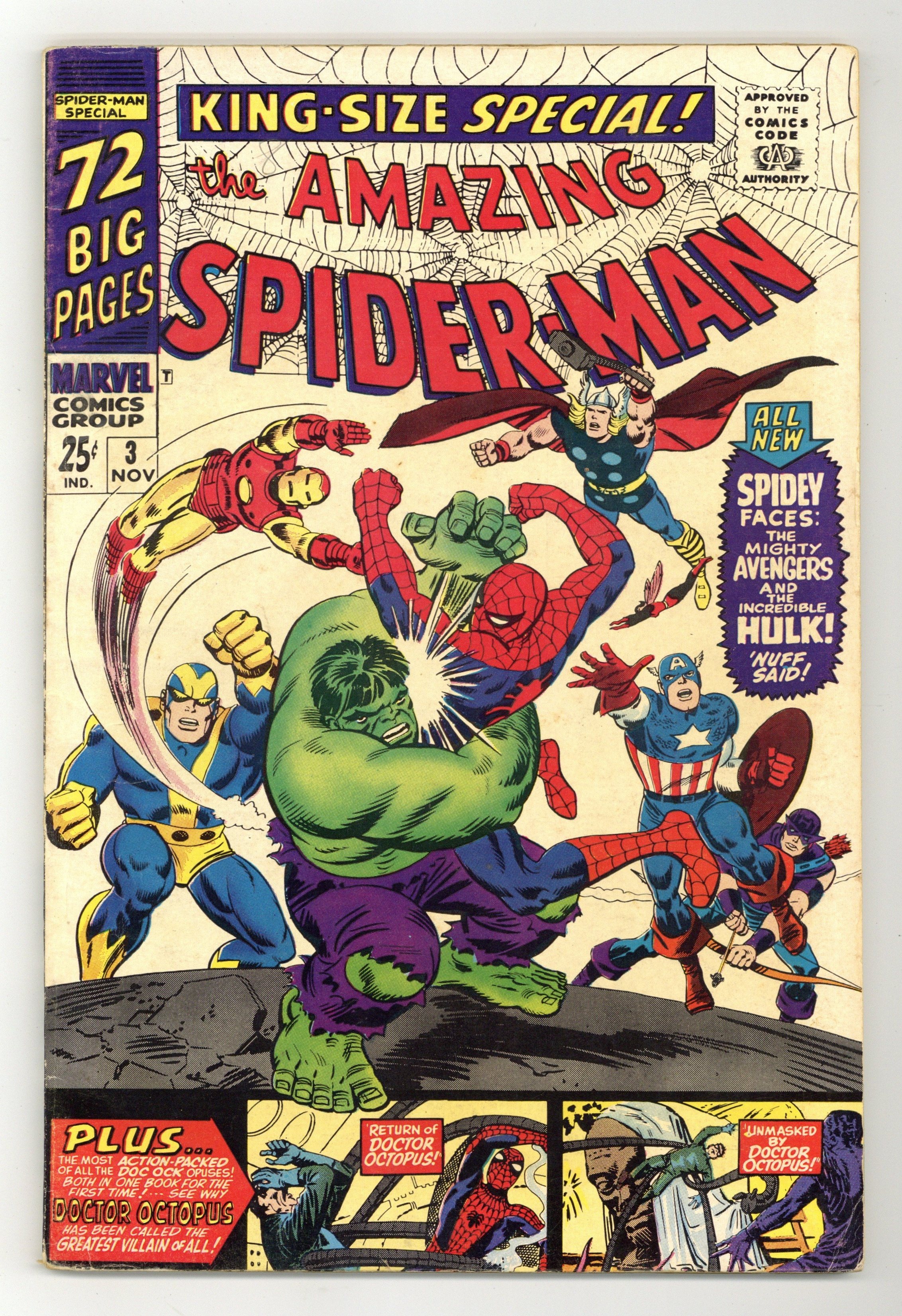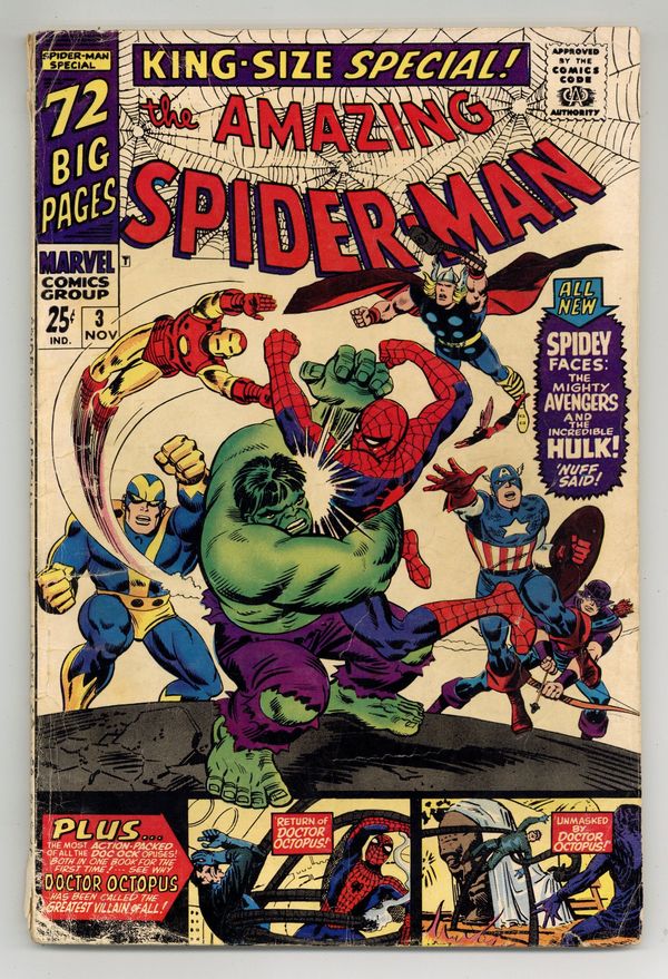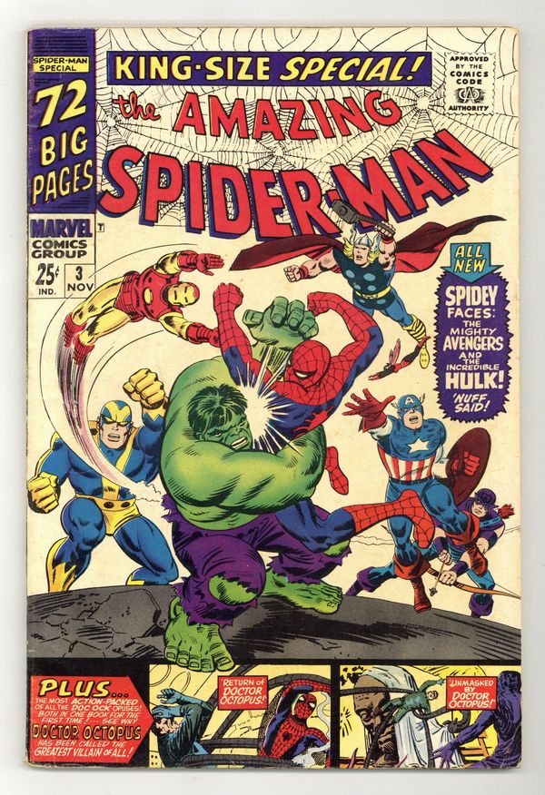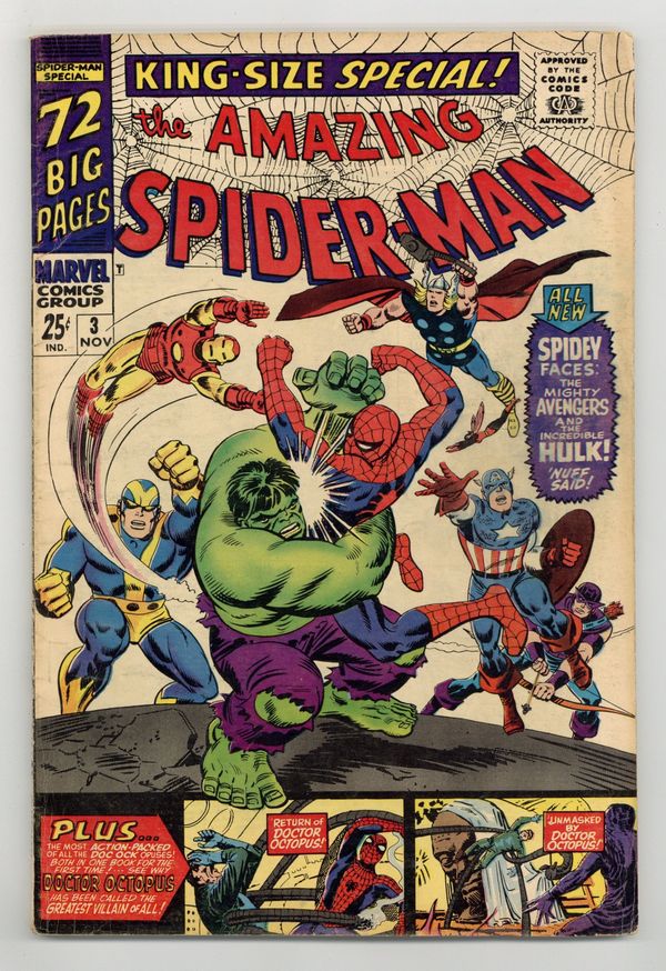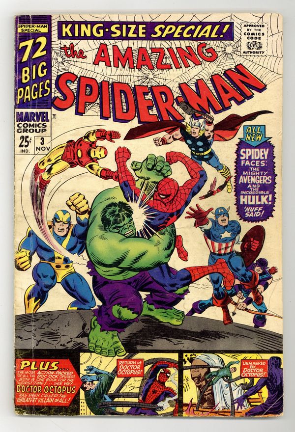 Cover pencils by John Romita and Steve Ditko, inks by Mike Esposito and Steve Ditko. Spidey faces the Avengers and the Hulk in a new 21-page story, "To Become an Avenger!", script by Stan Lee, layouts by John Romita Sr., pencils by Don Heck, inks by Mickey Demeo; The Avengers decide to ask Spider-Man to join the team but first he has to complete a test to prove himself; Reprinted in Marvel Tales # 181. The test is to capture the Hulk. Turning Point, script by Stan Lee, art by Steve Ditko; Betty's brother has gotten himself into trouble with gambling debts and Betty is forced to help in Doc Ock's plot to break Blackie Gaxton out of prison to keep her sibling alive; Spider-Man interrupts the escape and Blackie shoots Bennett during the conflict; reprinted from Amazing Spider-Man 11. Unmasked by Dr. Octopus, script by Stan Lee, art by Steve Ditko; Peter has the 24 hour flu when Doc Ock captures Betty Brant in hopes of luring Spider-Man into battle; Ock beats the sick web-head and unmasks him, but everyone thinks it is just Peter trying to be brave by impersonating Spidey; reprinted from Amazing Spider-Man 12. 76 pgs., full color. Cover price $0.25.