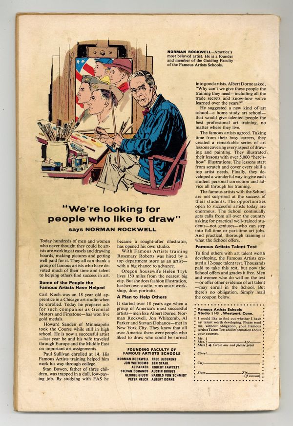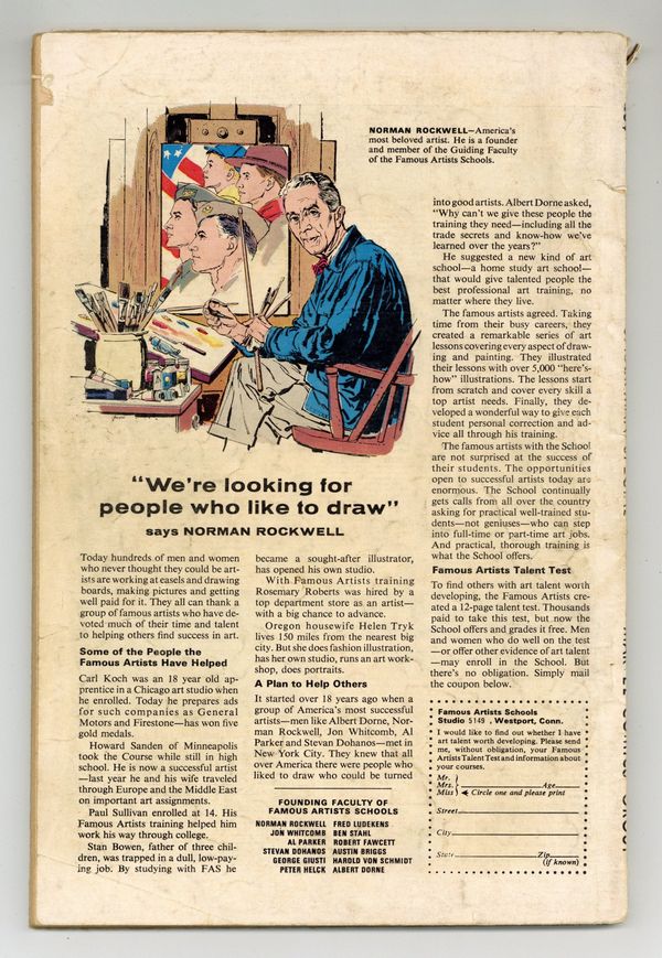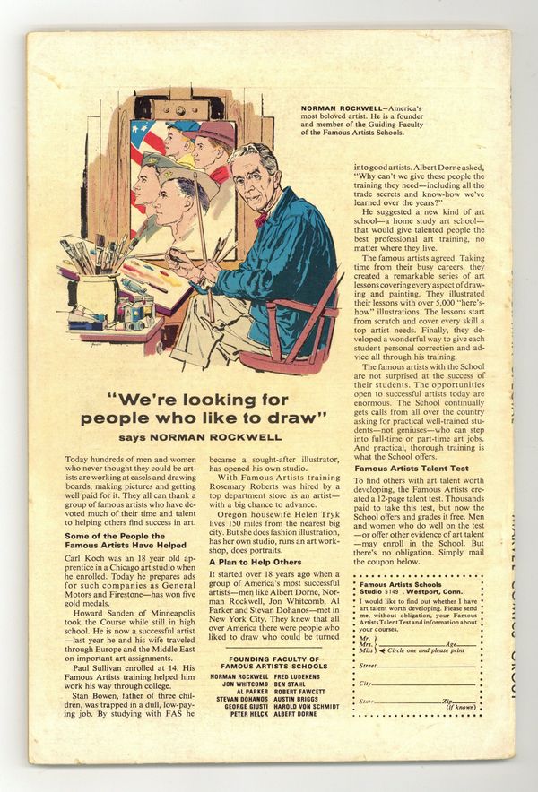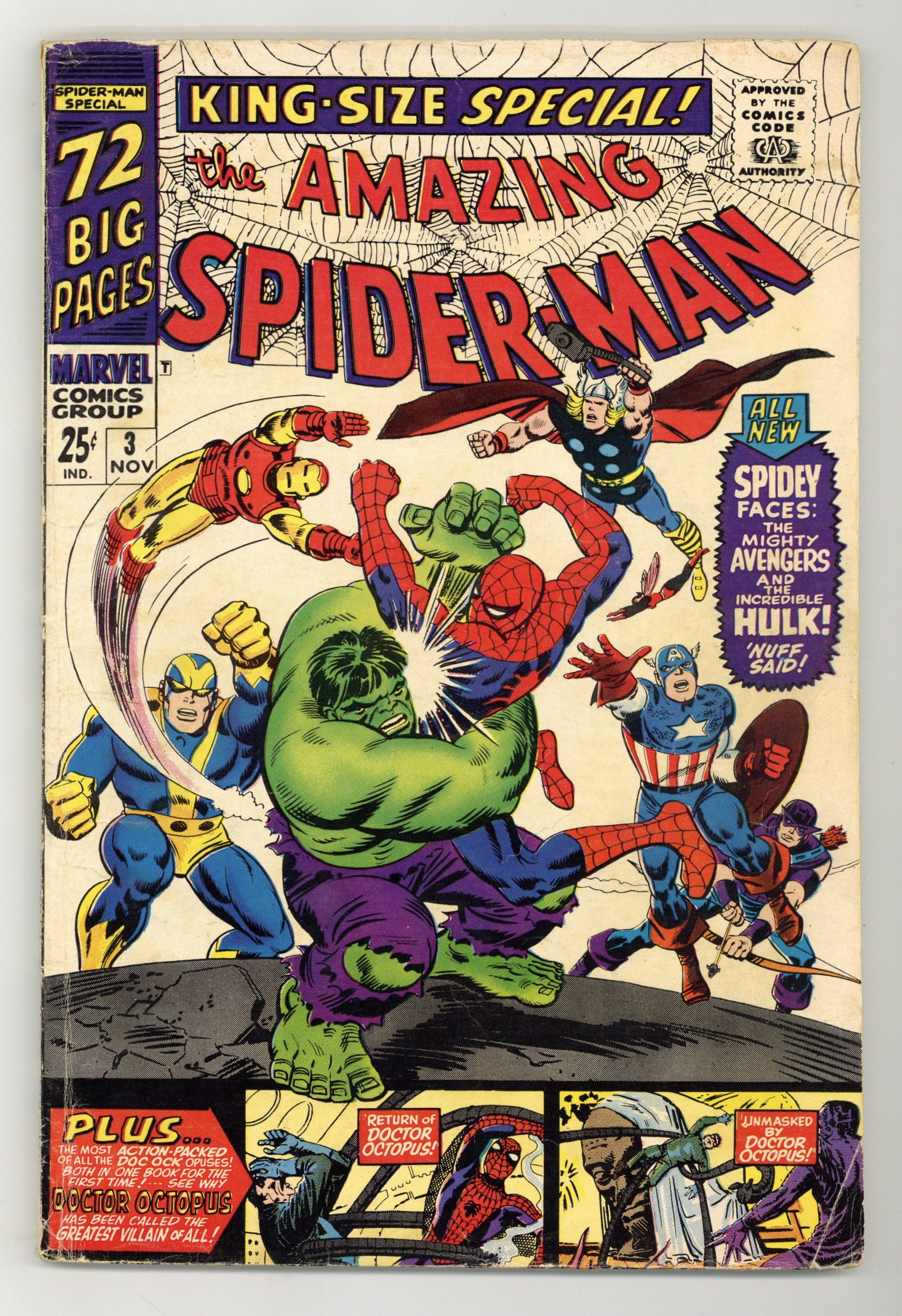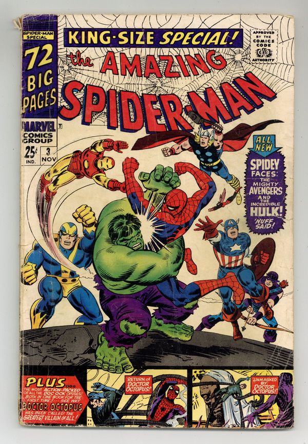 Cover pencils by John Romita and Steve Ditko, inks by Mike Esposito and Steve Ditko. Spidey faces the Avengers and the Hulk in a new 21-page story, "To Become an Avenger!", script by Stan Lee, layouts by John Romita Sr., pencils by Don Heck, inks by Mickey Demeo; The Avengers decide to ask Spider-Man to join the team but first he has to complete a test to prove himself; Reprinted in Marvel Tales # 181. The test is to capture the Hulk. Turning Point, script by Stan Lee, art by Steve Ditko; Betty's brother has gotten himself into trouble with gambling debts and Betty is forced to help in Doc Ock's plot to break Blackie Gaxton out of prison to keep her sibling alive; Spider-Man interrupts the escape and Blackie shoots Bennett during the conflict; reprinted from Amazing Spider-Man 11. Unmasked by Dr. Octopus, script by Stan Lee, art by Steve Ditko; Peter has the 24 hour flu when Doc Ock captures Betty Brant in hopes of luring Spider-Man into battle; Ock beats the sick web-head and unmasks him, but everyone thinks it is just Peter trying to be brave by impersonating Spidey; reprinted from Amazing Spider-Man 12. 76 pgs., full color. Cover price $0.25.