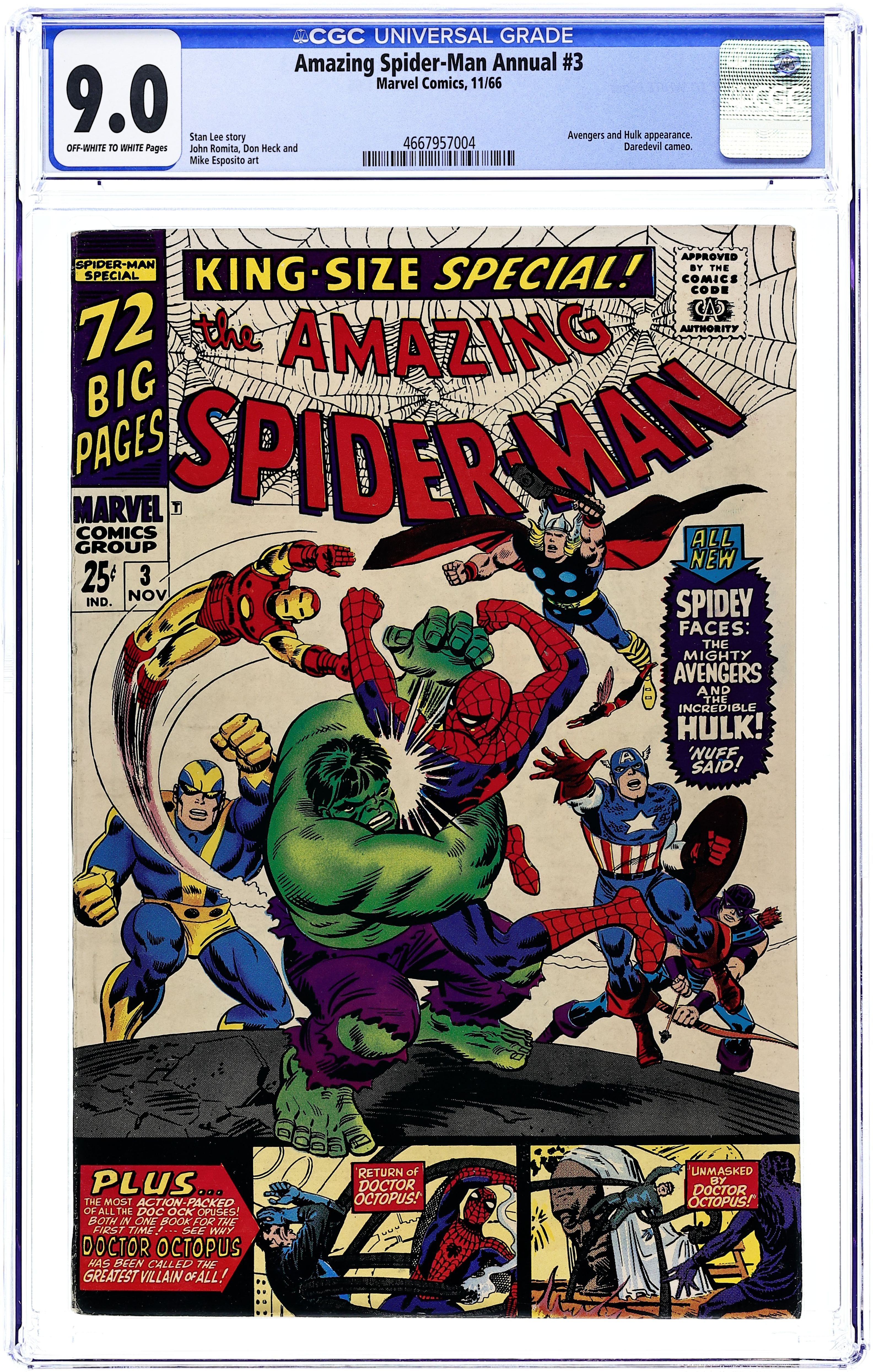 Starts Jan 3 Cover pencils by John Romita and Steve Ditko, inks by Mike Esposito and Steve Ditko. Spidey faces the Avengers and the Hulk in a new 21-page story, "To Become an Avenger!", script by Stan Lee, layouts by John Romita Sr., pencils by Don Heck, inks by Mickey Demeo; The Avengers decide to ask Spider-Man to join the team but first he has to complete a test to prove himself; Reprinted in Marvel Tales # 181. The test is to capture the Hulk. Turning Point, script by Stan Lee, art by Steve Ditko; Betty's brother has gotten himself into trouble with gambling debts and Betty is forced to help in Doc Ock's plot to break Blackie Gaxton out of prison to keep her sibling alive; Spider-Man interrupts the escape and Blackie shoots Bennett during the conflict; reprinted from Amazing Spider-Man 11. Unmasked by Dr. Octopus, script by Stan Lee, art by Steve Ditko; Peter has the 24 hour flu when Doc Ock captures Betty Brant in hopes of luring Spider-Man into battle; Ock beats the sick web-head and unmasks him, but everyone thinks it is just Peter trying to be brave by impersonating Spidey; reprinted from Amazing Spider-Man 12. 76 pgs., full color. Cover price $0.25.