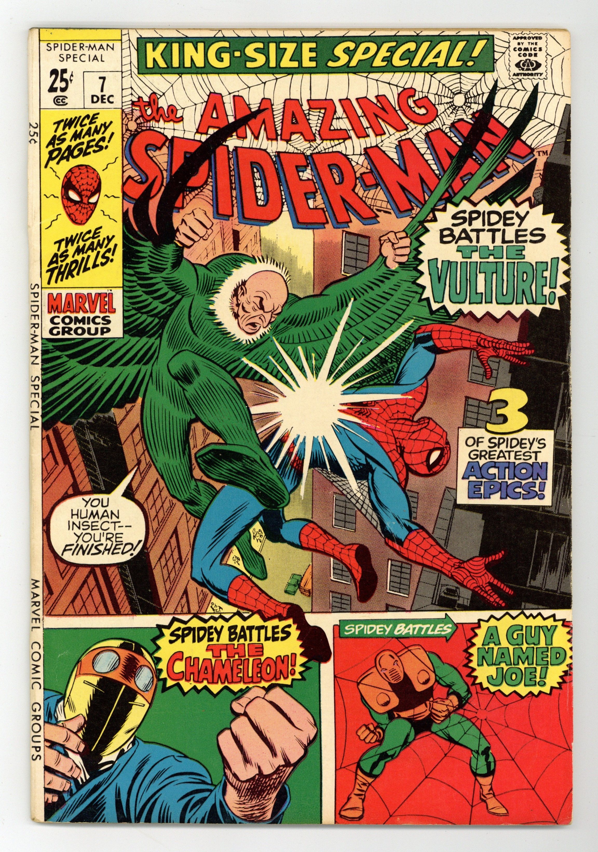 This annual features three reprint stories and a new cover by John Romita. First story reprinted from Amazing Spider-Man 1: "Spider-Man vs. the Chameleon!" Script by Stan Lee. Art by Steve Ditko. Guest-starring the Fantastic Four. The web-slinger tries to join the FF but ends up tussling with the Chameleon instead. Second story reprinted from Amazing Spider-Man 2: "Duel to the Death with the Vulture!" Script by Stan Lee. Art by Steve Ditko. The wall-crawler battles the Vulture for the first time and makes J. Jonah Jameson very happy with his pictures of the fight. Third story reprinted from Amazing Spider-Man 38: "Just a Guy Named Joe!" Script by Stan Lee. Art by Steve Ditko. Spidey clashes with a down-on-his-luck boxer. Special feature: 6 pages of assorted pin-ups and illustrations (with art by Steve Ditko and John Romita) featuring Spider-Man, Mysterio, the Vulture, Sandman, Electro, and Mary Jane Watson. 68 pages. 25 cents. Cover price $0.25.