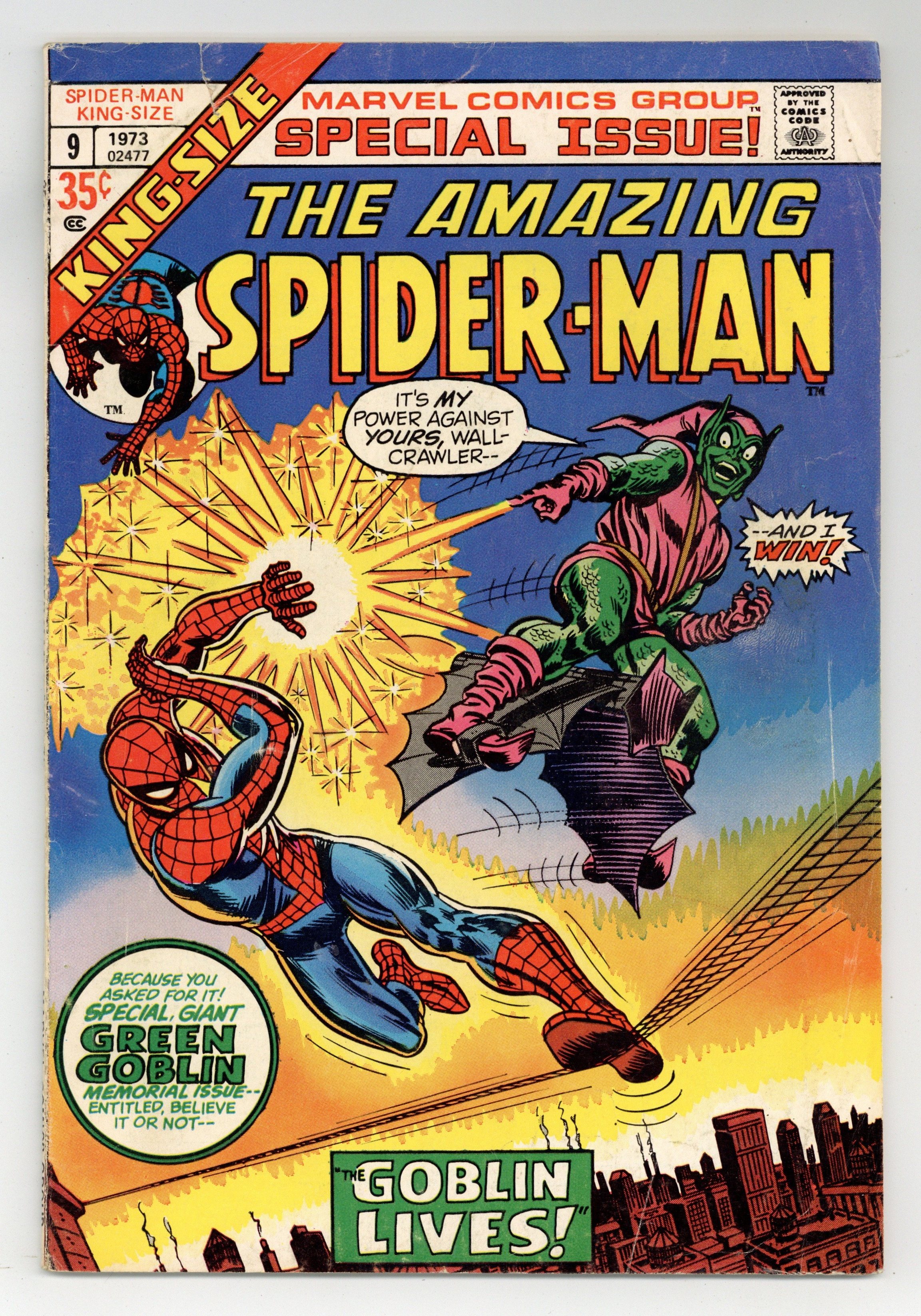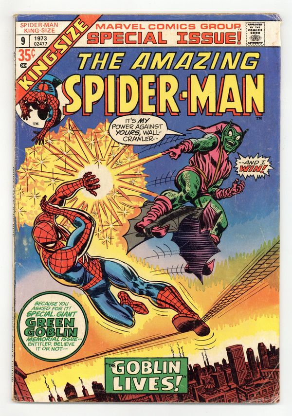This annual reprints Spectacular Spider-Man (1968 Magazine) #2 in condensed format. "The Goblin Lives!" Script by Stan Lee. Art by John Romita (layouts, pencils), Jim Mooney (pencils, inks) and Frank Giacoia (inks). Redrawn cover by John Romita (from his original painted magazine cover). Norman Osborn relapses and recalls that he is the Green Goblin! Oh no! That is very bad news for the Amazing Spider-Man! The sinister goblin wastes no time in threatening Peter's dear Aunt May! And that quickly drawsthe web-slinger into a terrific no-holds-barred battle with his long-time foe! But this time the wall-crawler turns one of the goblin's tricks against him! Could a psychedelic pumpkin bomb be the key to victory? Cameo appearances by Aunt May, Gwen Stacy, George Stacy, Mary Jane Watson, Harry Osborn, and J. Jonah Jameson. (Notes: 18 pages from the original story are omitted in order to reduce the story to 40 pages to fit the annual format. Missing pages includes numbers 4, 5, 8-11, 17, 21, 23, 24, 27-29, 33, and 36. Elements of the plot briefly cross over with Amazing Spider-Man 66. The Green Goblin previously appeared (chronologically) in Amazing Spider-Man 39-40; and appears next in Amazing Spider-Man 96-98 (the memorable anti-drug issues). 52 pages. 35 cents. Cover price $0.35.