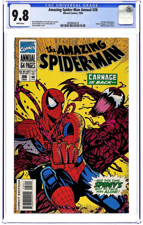 It's Carnage versus Spidey in "The Mortal Past, script by David Michelinie, pencils by Steven Butler, inks by Bud LaRosa; Cletus breaks out of jail and goes looking for one of his childhood friends...to kill him! Fatal Instinct, script by Tom Brevoort and Mike Kanterovich, pencils by Anthony Williams, inks by Keith Williams; Cloak and Dagger stop some drug dealers. Mr. Smith Goes to Town starring Joe Smith and Julia Trainor, with Cameo by Captain America, script by Tom Brevoort and Mike Kanterovich, pencils by Mark Tenny, inks by Joe Rubinstein. No Son of Mine, script by Eric Fein, art by Larry Alexander; Someone breaks into Rhino's home and steals his niece's locket; Rhino's not happy. 3 pages of Mark Bagley sketches (Peter and Mary Jane's apartment, and the new Vulture). 68 pgs., full color. Cover price $2.95.