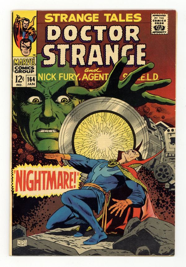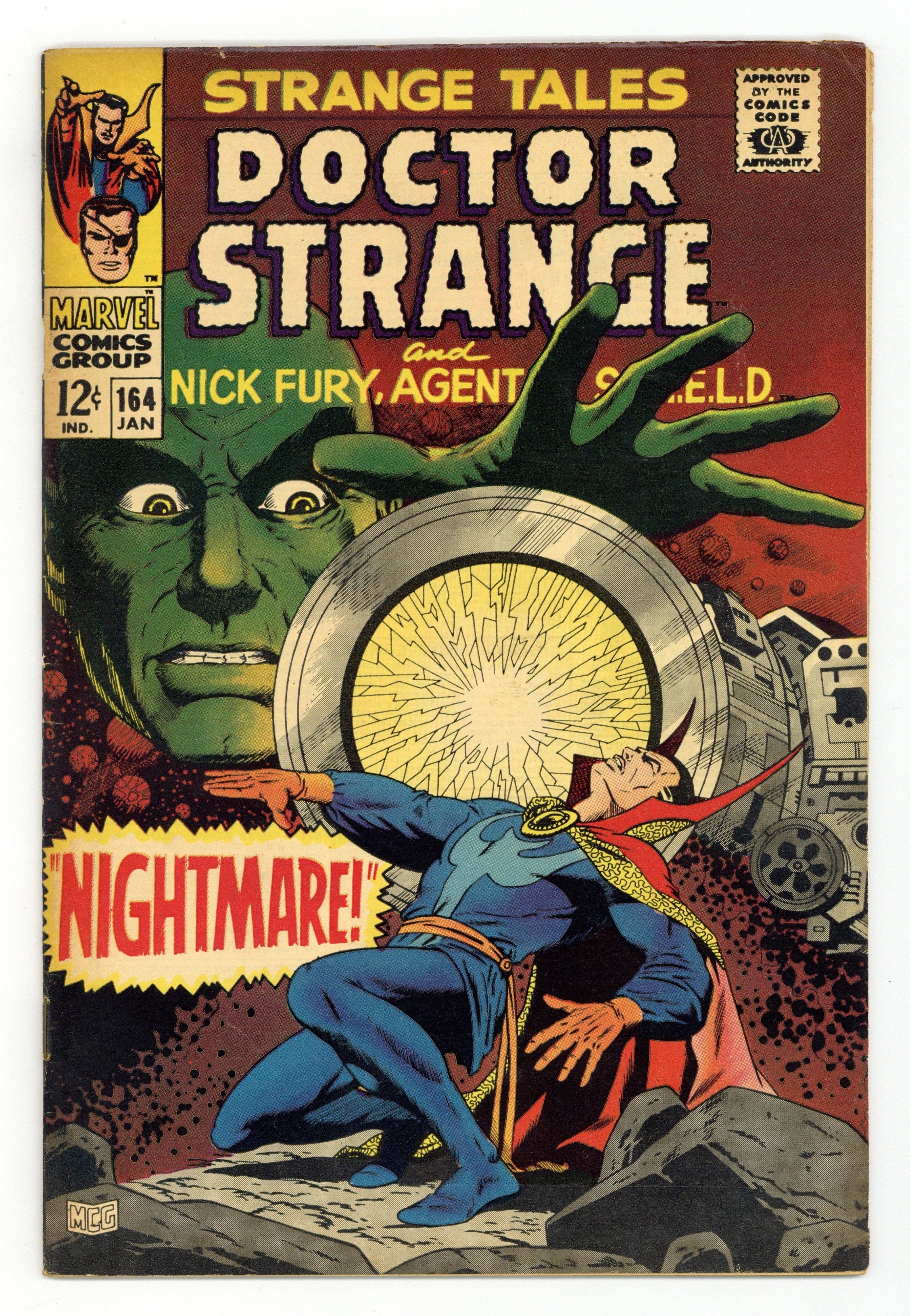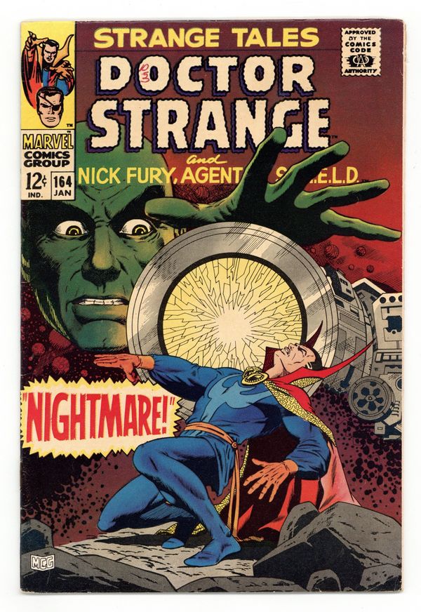 Tags: Marvel Legacy Numbering: Doctor Strange (part 164)$25.50Cover art by Dan Adkins. Nick Fury stars in "Nightmare!", script by Jim Lawrence and Dan Adkins (co-plot), art by Dan Adkins; Hurling thru the void of space, Strange sees a vision of Victoria Bentley, surrounded by machinery; He lands on a jungle planet inhabited by savage, monstrous creatures; Strange finds an underground cavern, and inside it, an elaborate machine, from which emits a mental challenge; Yandroth, Scientist Supreme, claims to have unlocked the "inner-most secrets of the cosmos"; Yellow Claw appearance. "When Comes... Black Noon!", script and pencils by Jim Steranko, inks by Bill Everett; At the instant the Claw fired The Ultimate Annihilator at Fury, Suwan teleports him thru Hyper-Dimensional Space to the underground lair and then back to SHIELD; In his lair The Claw tests the Ultimate Annihilator by destroying a satellite in orbit. SHIELD medics warn Fury that further stimulation could be fatal; Fury follows a tip and invisibly trails a Claw agent leading him to The Claw & Voltzmann; Fury discovers he's on board The Sky Dragon, a huge airship miles above the city! Marvel Marching Society info and coupon. 36 pgs., full color. Cover price $0.12.
