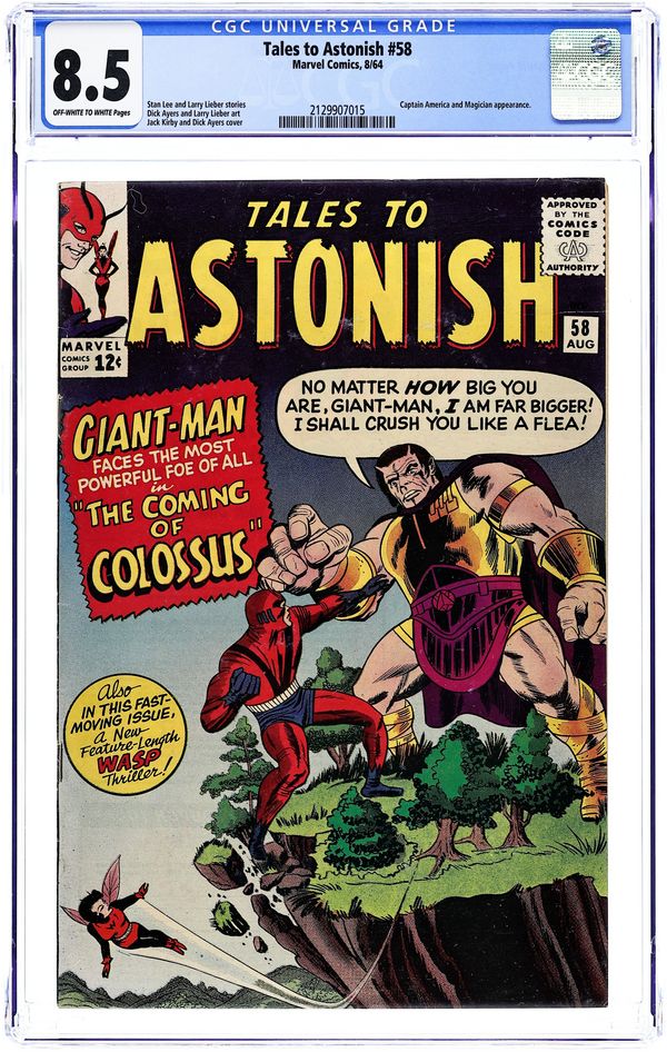 Captain America has a cameo in the Giant-Man story, "The Coming of Colossus!" Script by Stan Lee, pencils by Dick Ayers, inks by Paul Reinman. Back-up story: "The Magician and the Maiden!" Plot by Lee, script and art by Larry Lieber. Jack Kirby/Sol Brodsky cover. 36 pgs. Cover price $0.12.