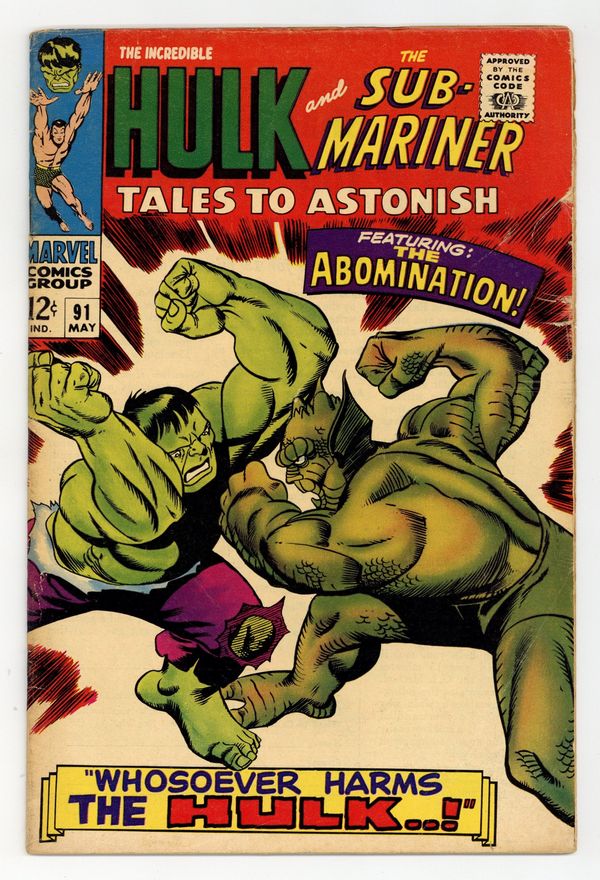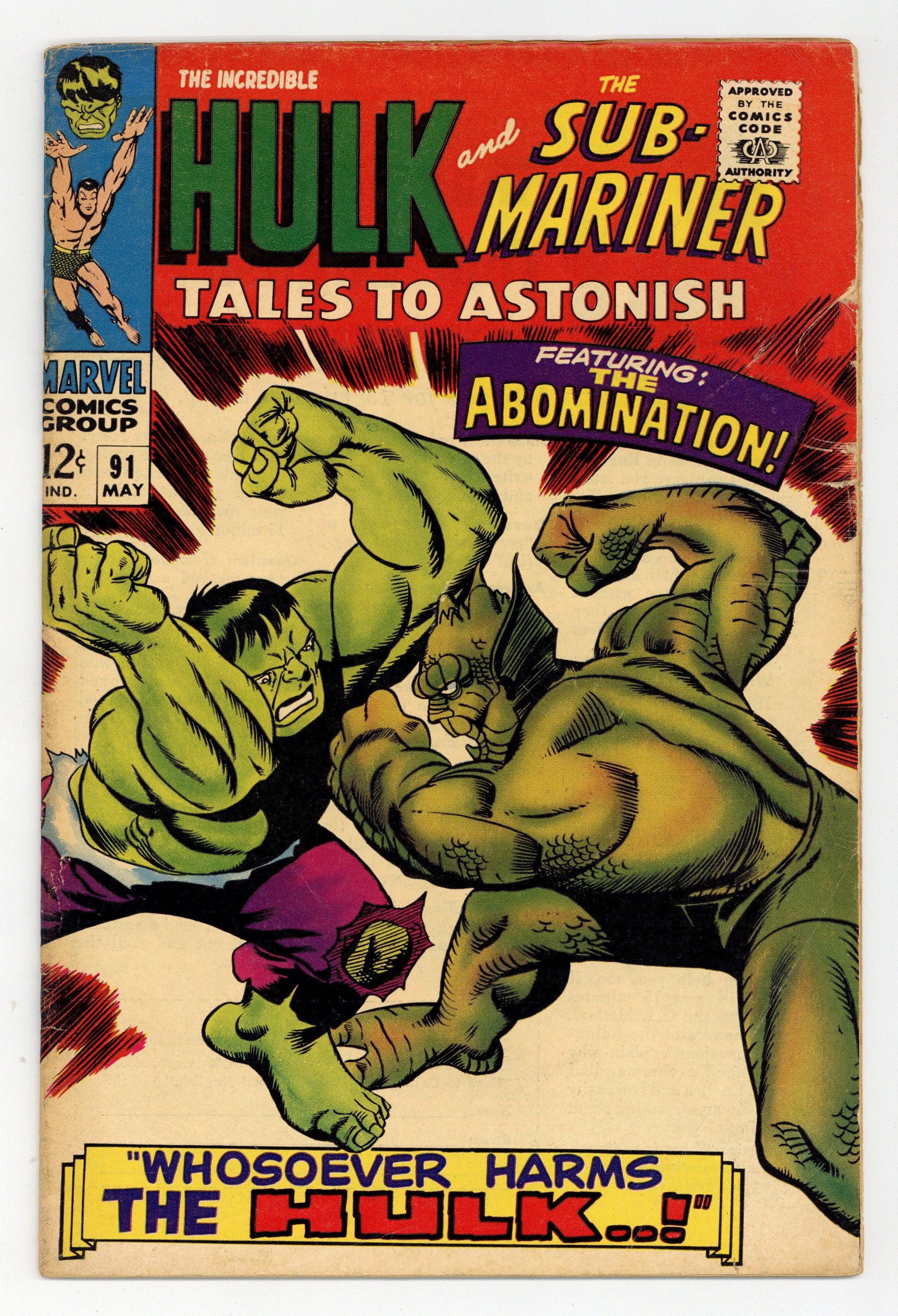 Starts Feb 16 Cover by Gil Kane. Outside the Gates Waits..Death!, script by Stan Lee, art by Bill Everett and Dan Adkins; As the new ruler of Atlantis, Byrrah has Namor arrested and sent to the dreaded Inferno Isle; Namor battles the lava monster that lives there and returns to Atlantis to seek his vengeance; Meanwhile, back in the undersea kingdom, Dorma has found Byrrah's hypnosis machine that won him the throne and uses it to turn the Atlantean allegiance back to Namor. Whosoever Harms the Hulk..!, script by Stan Lee, art by Gil Kane; Ross and his men try to revive the Hulk after his beating by the Abomnation; Returning from the brink of death, Hulk is about to leave when the pleading Rick Jones causes him to transform back to Banner; Banner uses his knowledge to lure Abomination back to Gamma base with Betty in tow; Hulk and Abomination clash once again; Watching from a distant galaxy, the Stranger realizes that the Abomination is a much better ally than the Hulk and zaps him to his side, ending the battle. 36 pgs., full color. $0.12. Cover price $0.12.