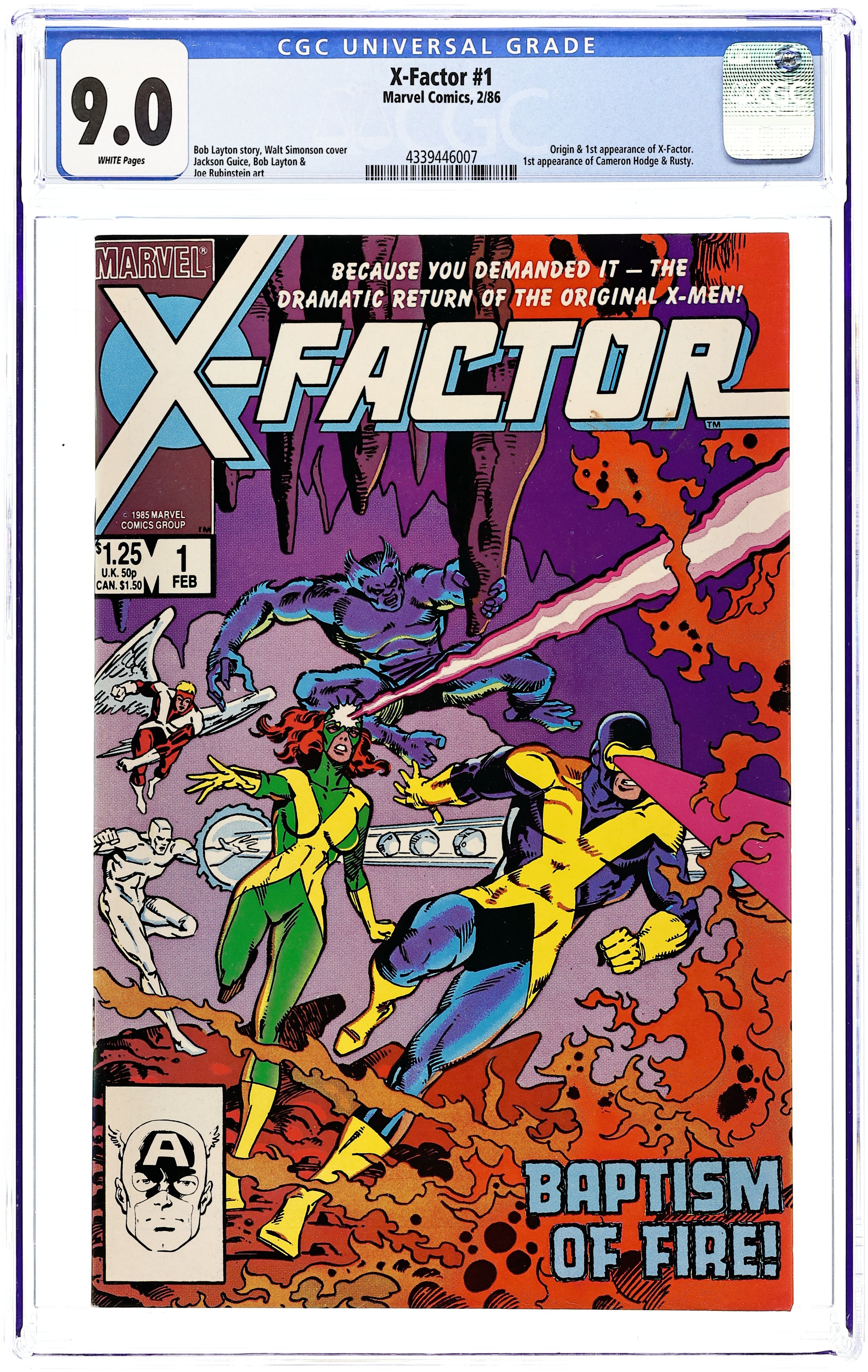 Direct Edition. Return of Jean Grey: Part 3 of 3 - "Third Genesis!" Mr. Fantastic cameo. Avengers flashback cameo. Story by Bob Layton. Art by Jackson Guice, Bob Layton, and Joe Rubinstein. Cover by Walt Simonson. Story continued from Avengers (1963-1996 1st Series) #263 and Fantastic Four (1961-1996 1st Series) #286. Charles Xavier is gone, whisked away to the far side of the universe by the Shi'Ar Empire (see Uncanny X-Men #200), but his dream is not dead. His original X-Men, Cyclops, Angel, Beast, Ice Man, and the recently resurrected Jean Grey, have reunited as the super-group called X-Factor to see his dream of mutants and humans co-existing in peace realized and brought to fruition. Cover price $1.25.