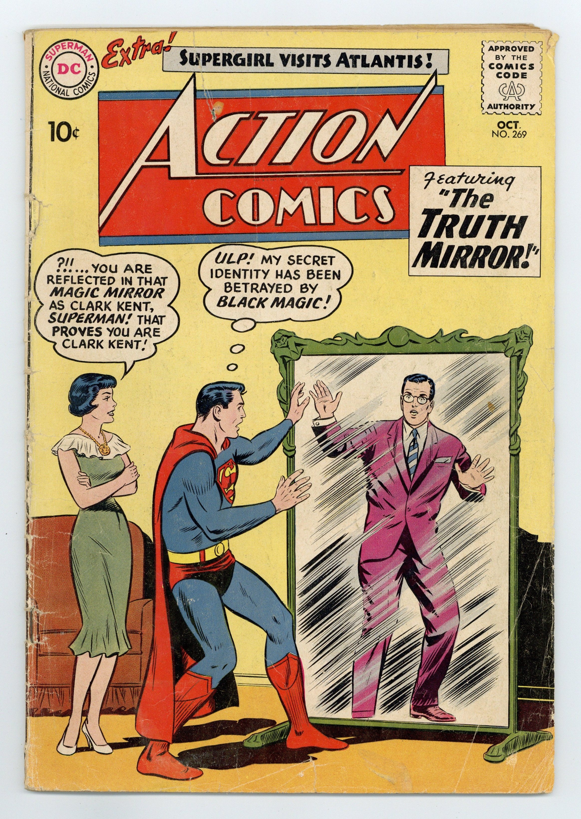 Cover pencils by Curt Swan, inks by Stan Kaye. "The Truth Mirror!", script by Jerry Siegel, pencils by Curt Swan, inks by Stan Kaye; Lois receives a magic mirror from her uncle that reveals a person's true nature; She uses it to find out Superman is really Clark Kent, but Superman then tricks her into believing that the mirror does not always work. One-page Tricksy story by Henry Boltinoff. "Supergirl's First Romance!", script by Jerry Siegel, art by Jim Mooney; Supergirl is called upon by Lori Lemaris to help Atlantis from a disaster. There, she falls in love with a merboy, Jerro. 36 Pages, Full Color. $.10 Cover price $0.10.
