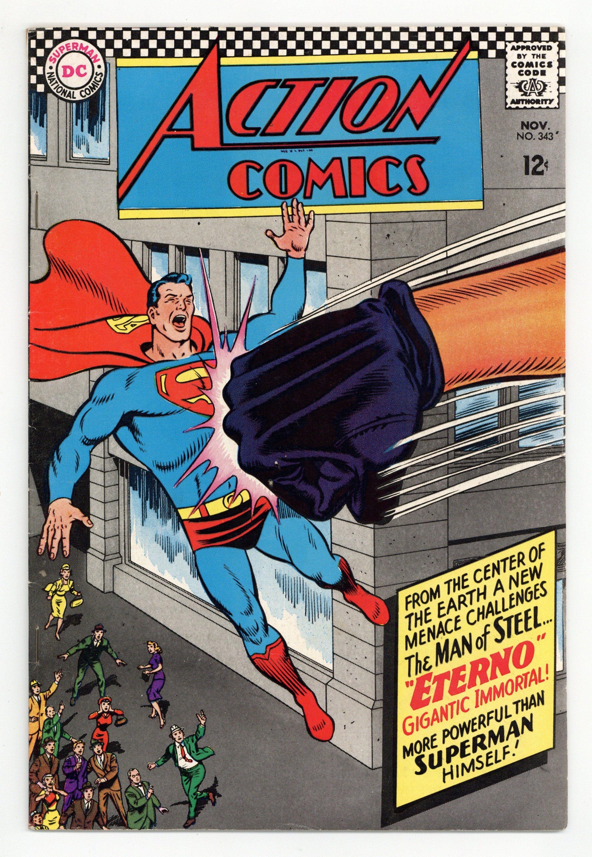 Cover pencils by Curt Swan, inks by George Klein. "Eterno the Immortal," script by Jim Shooter, art by Wayne Boring; The Superman Revenge Squad revives Eterno, a 50-foot giant half-robot, half-android that was built by a lost civilization. Plastic Man ad. Justice League of America ad. "Jimmy Olsen, Supergirl's Pal!", script by Otto Binder, pencils by Curt Swan, inks by John Forte; Supergirl tries to reveal her existence to Jimmy Olsen but Jimmy has temporarily lost his sight and does not believe that a Supergirl exists. Letter to the editor from comic artist Dave Cockrum. 36 Pages, Full Color. $0.12 Cover price $0.12.