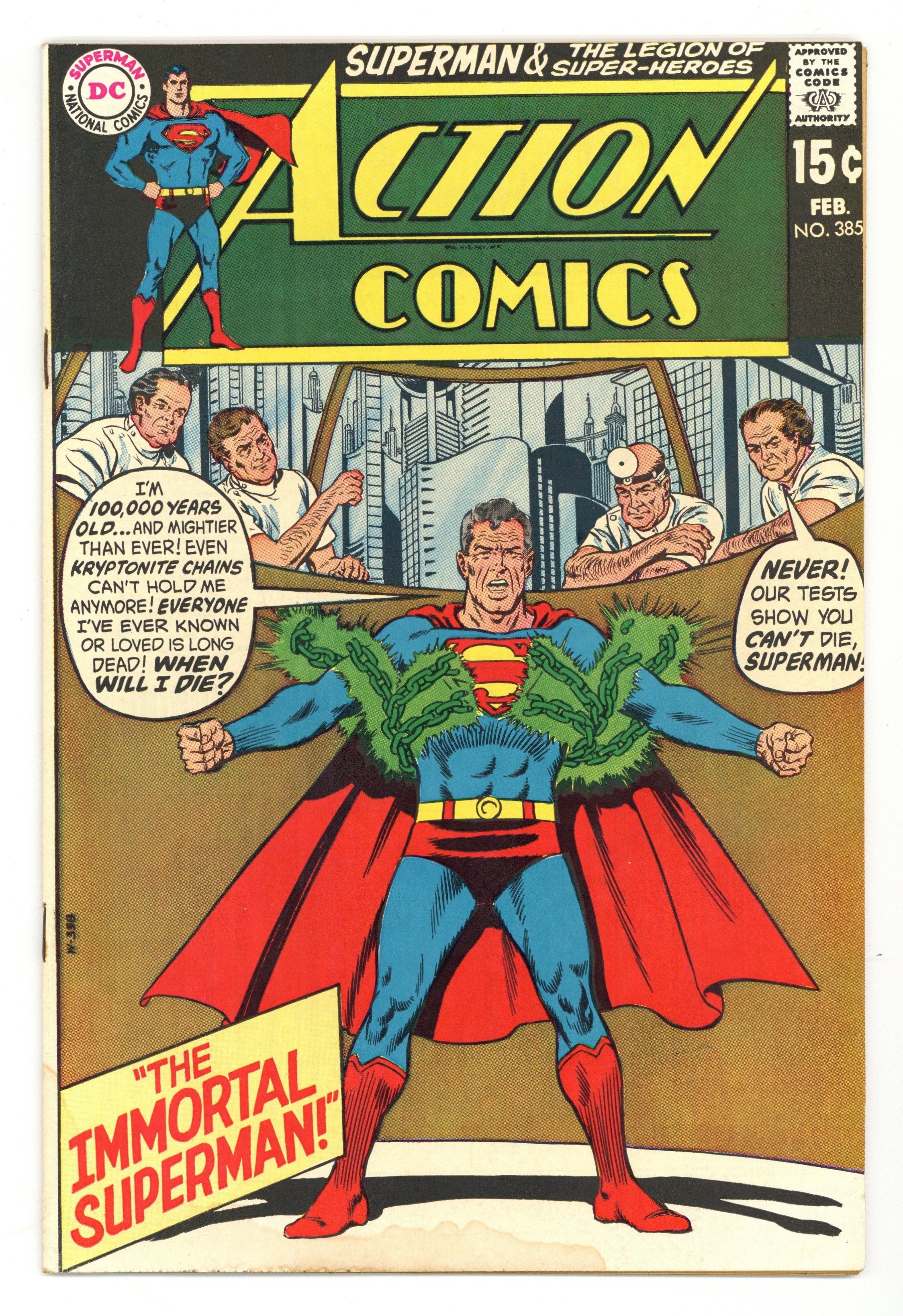 Cover pencils by Curt Swan, inks by Murphy Anderson. "The Immortal Superman!", script by Cary Bates, pencils by Curt Swan, inks by George Roussos; After promising the President not to travel through the time-barrier using his powers, Superman must use a defective Legion time bubble to answer a call for help from the future; When he arrives in the year 101970 he finds that he has aged a hundred thousand years. Sgt. Rock's Prize Battle Stars ad. Tales of the Legion of Super-Heroes back-up, "The Fallen Starboy!", script by E. Nelson Bridwell, pencils by Win Mortimer, inks by Jack Abel; Star Boy leads a mission to his home planet and faces the brother of Kenz Nuhor, the man he once killed in self-defense. 36 Pages, Full Color. $0.15 Cover price $0.15.