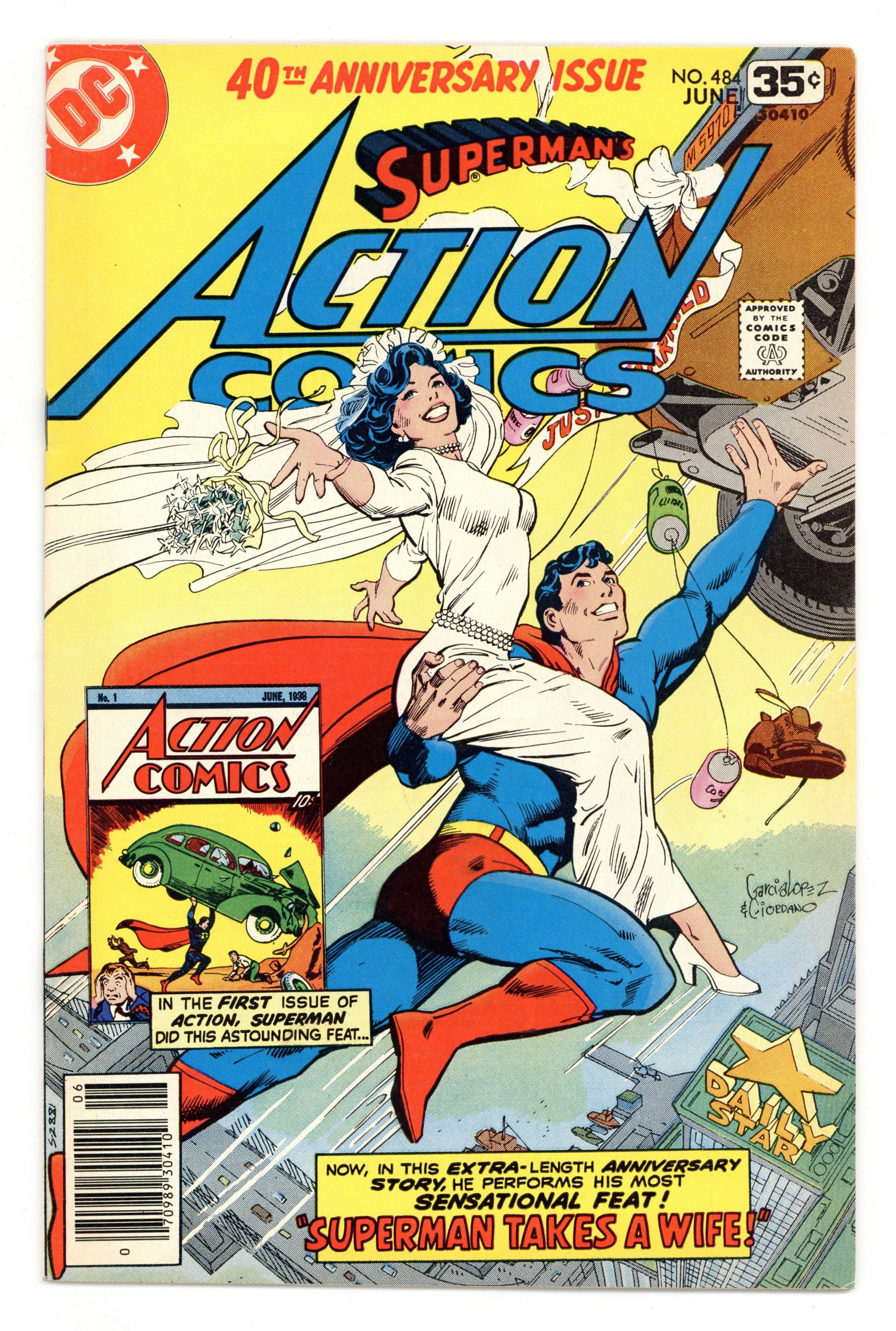 Tags: Superman$22.50Cover art by Jose Luis Garcia-Lopez and Dick Giordano. Superman Takes a Wife, script by Cary Bates, pencils by Curt Swan, inks by Joe Giella; Colonel Future and The Wizard team to prevent the existence of Earth 2 Superman, who eventually restates his marriage vows with Lois; 40th anniversary issue. 36 Pages, Full Color. Cover price $0.35.