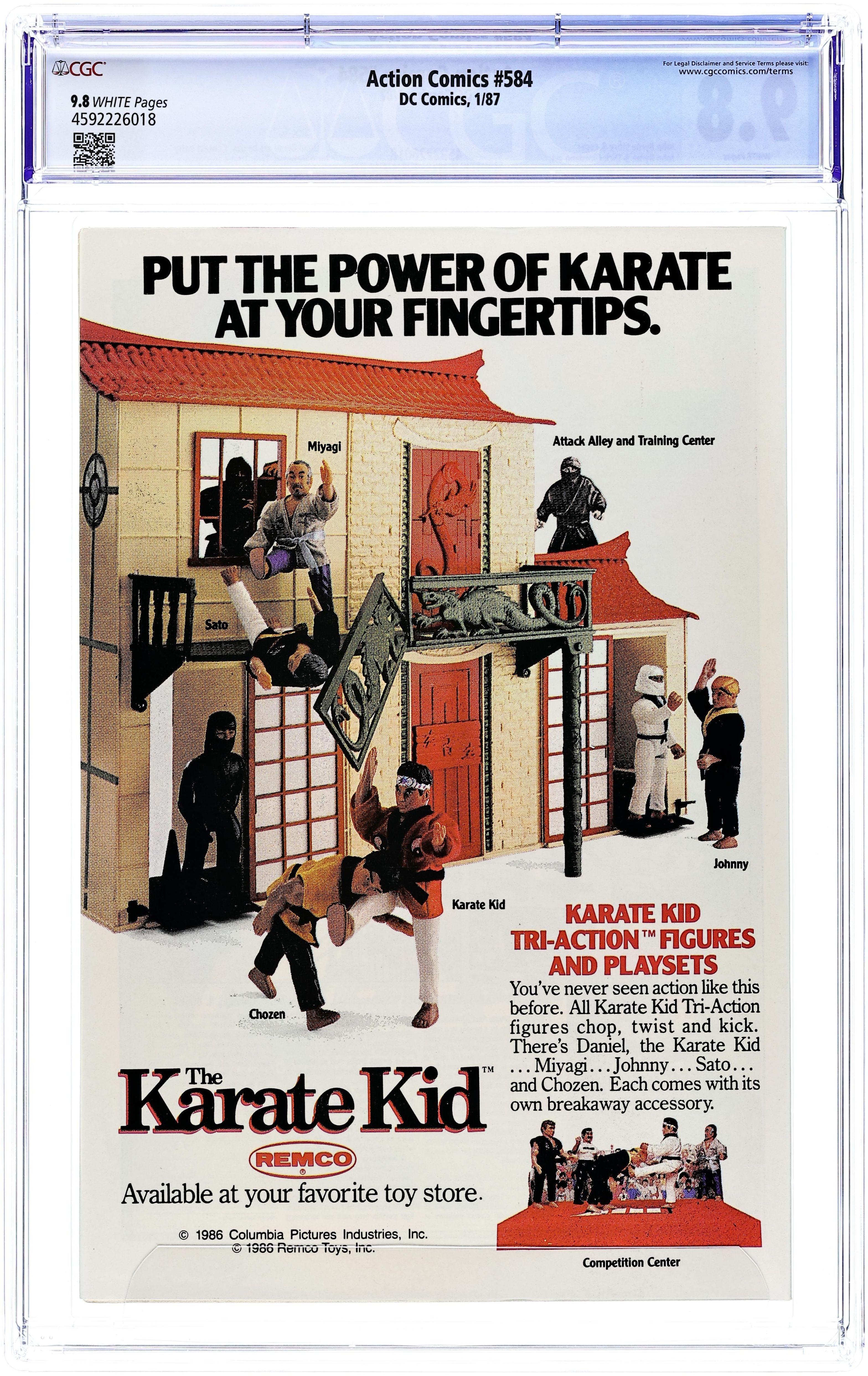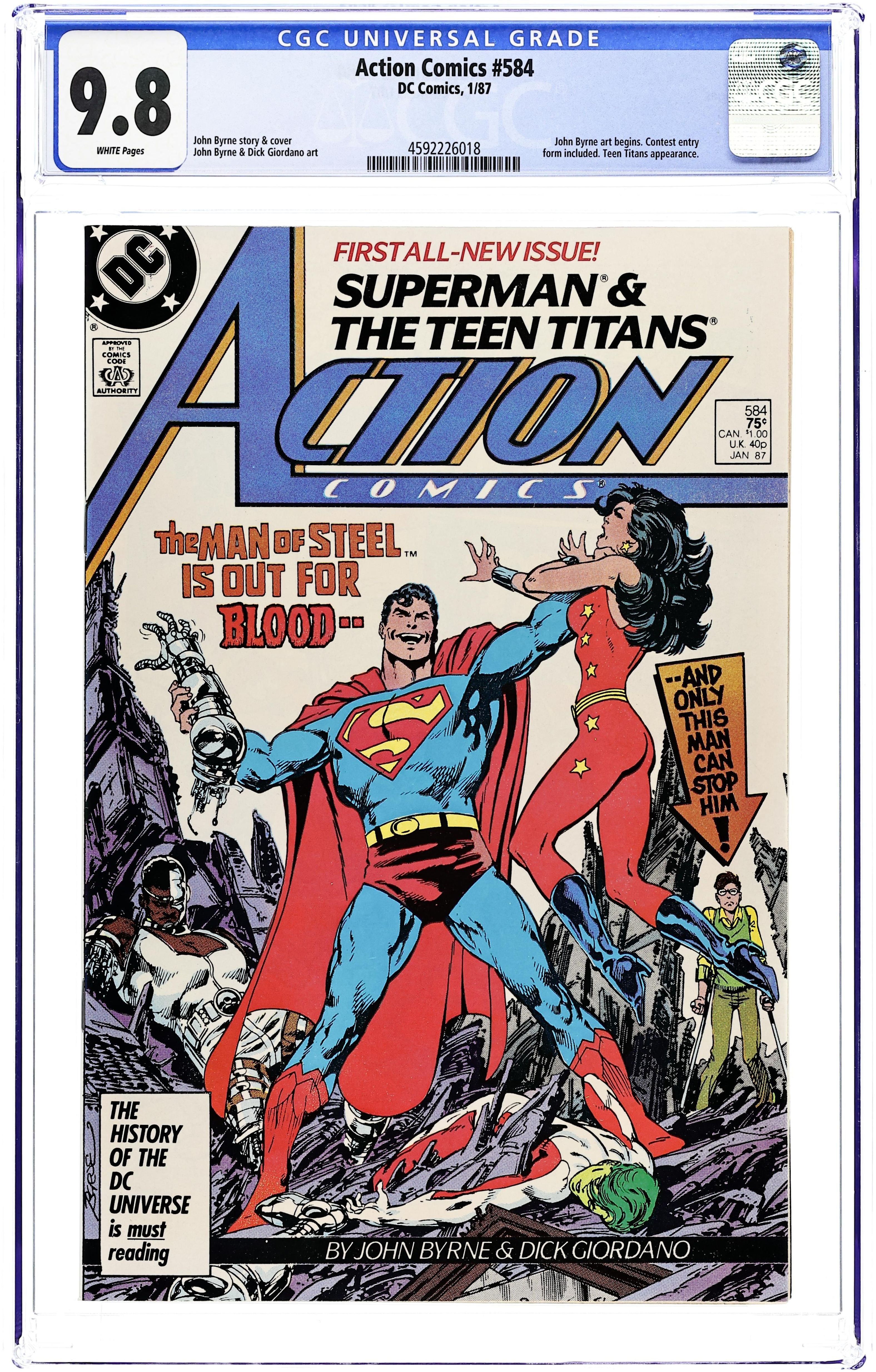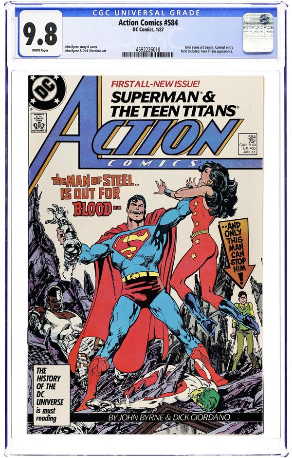 Cover art by John Byrne. Squatter starring Superman and the Teen Titans, script and pencils by John Byrne, inks by Dick Giordano; David Gunderson uses a machine to control Superman's mind, making him destructive. Action Comics: In the Beginning... article by John Byrne. Postcard insert for contest to win The Man of Steel trade paperback, art by Byrne. 36 Pages, Full Color, $0.75. Cover price $0.75.