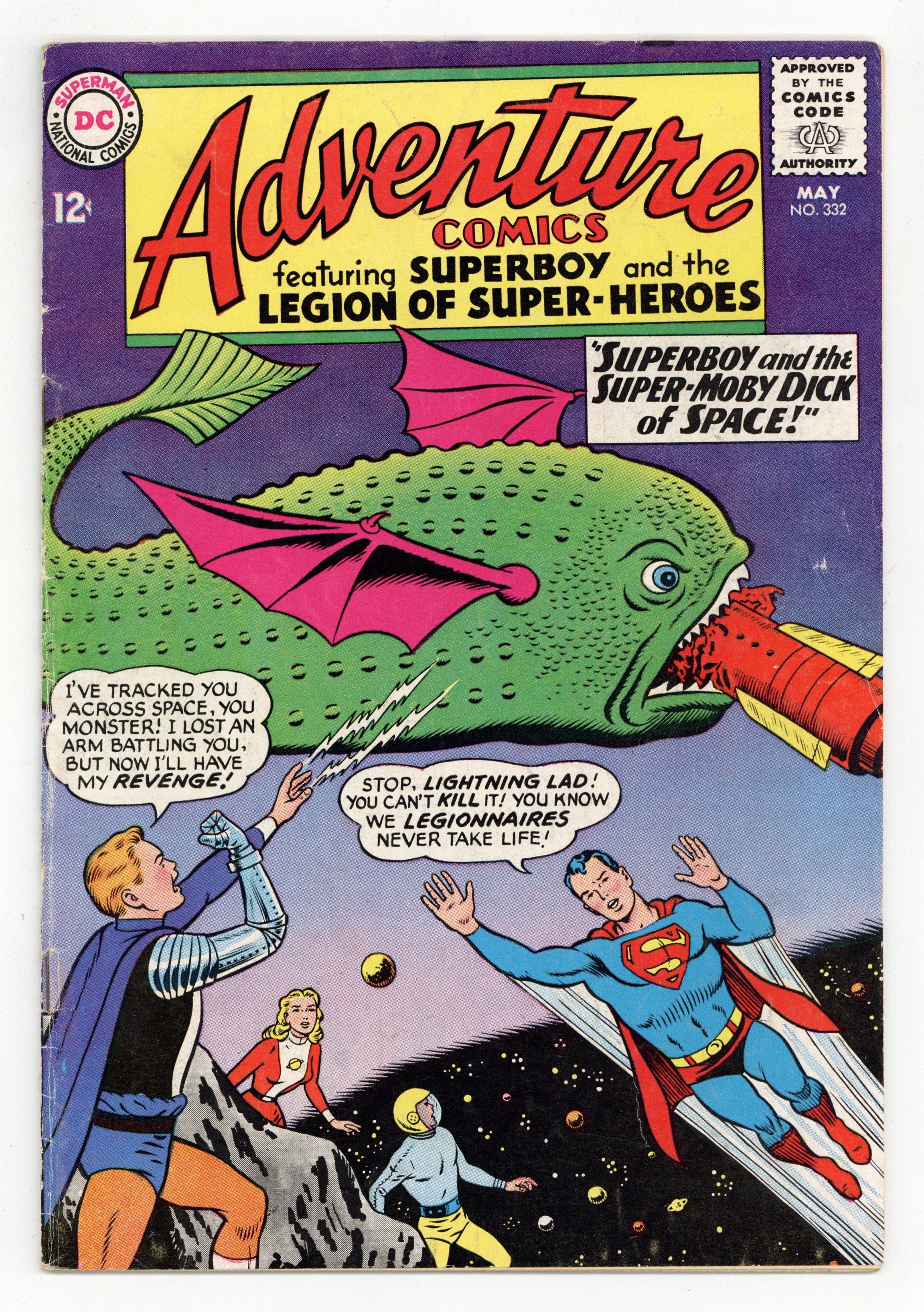 $25.50Cover pencils by Curt Swan, inks by George Klein. The Super-Moby Dick of Space!--Tales of the Legion of Super-Heroes, script by Edmond Hamilton, pencils by John Forte, inks by George Klein; Lightning Lad loses an arm to the Super-Moby Dick of Space; When Ultra Boy fails to subdue the space creature, Lightning Lad leads a team against it and shrinks the space creature to its original size with the help of the scientist who accidentally enlarged it. Letters from Bob Rozakis and Cary Bates. The Junior Super-Sleuths of Smallville!, art by John Sikela; Clark solves a mystery in which Lana appears to be a thief. Letter to the editor from comic writer Cary Bates. Rocky and Bullwinkle star in a one-page Cheerios ad. 36 Pages, Full Color. Cover price $0.12.