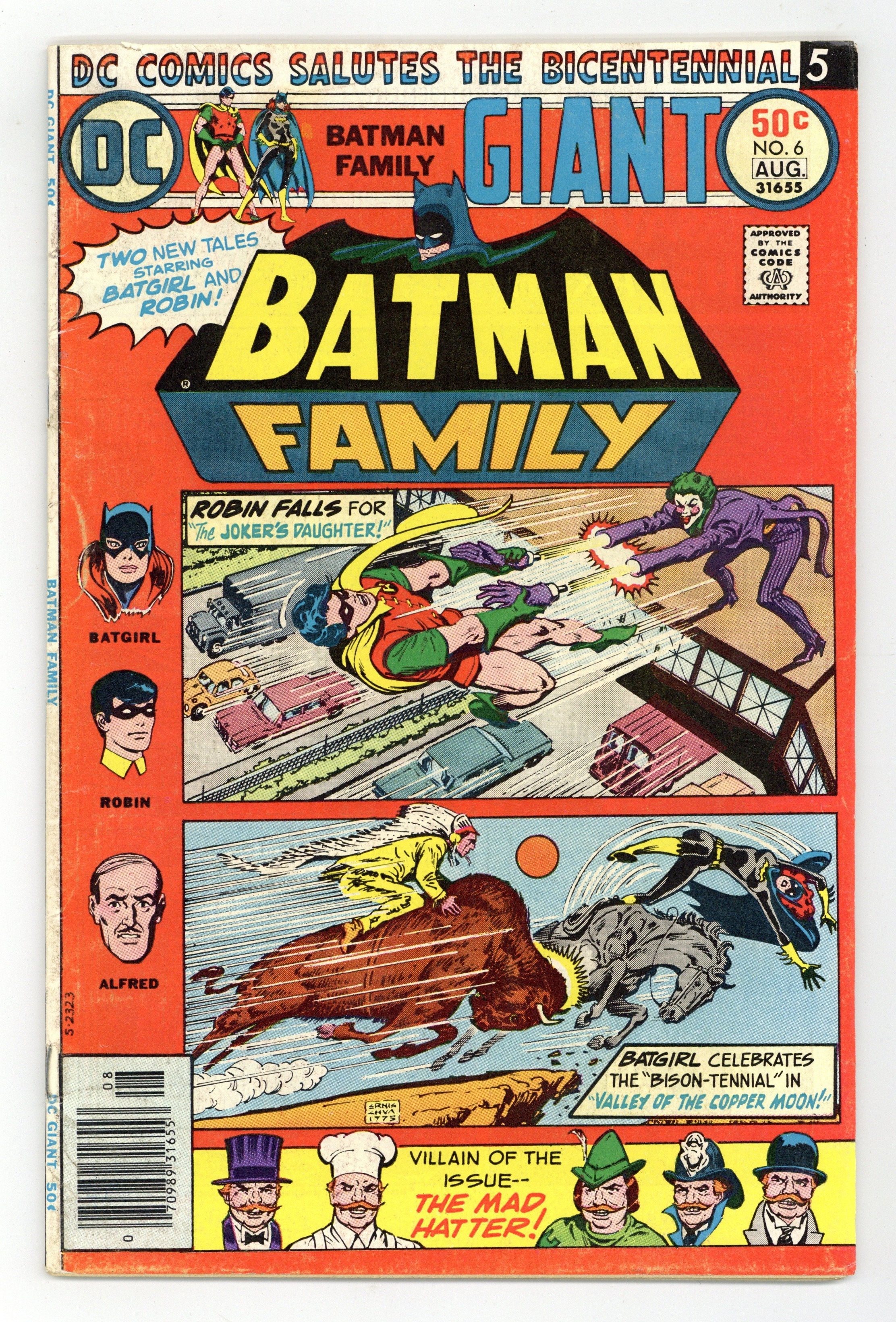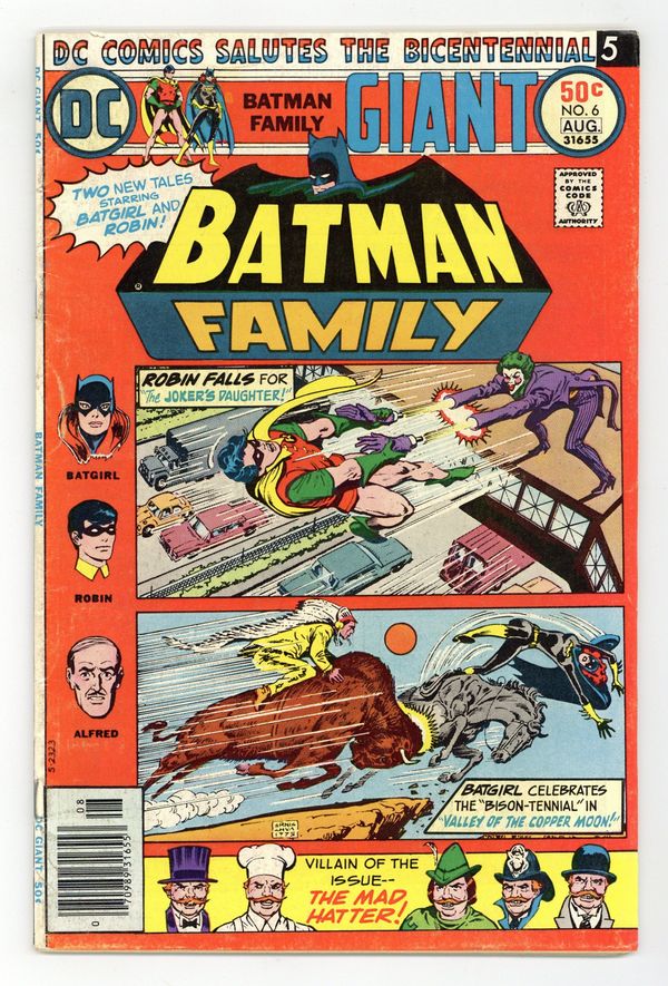 Giant-size issue. Batgirl stars in "Valley of the Copper Moon!" Script by Elliot Maggin, pencils by Jose Delbo, inks by Vince Colletta. Robin stars in "The Joker's Daughter!" Script by Bob Rozakis, pencils by Irv Novick, inks by Frank McLaughlin (1st appearance). Reprint back-up stories: Alfred stars in "In the Soup!" with art by Jerry Robinson (from Batman 32); Batman and Robin star in "The New Crimes of the Mad Hatter" (from Batman 161). Ernie Chan (as "Ernie Chua") cover. Cover price $0.50.
