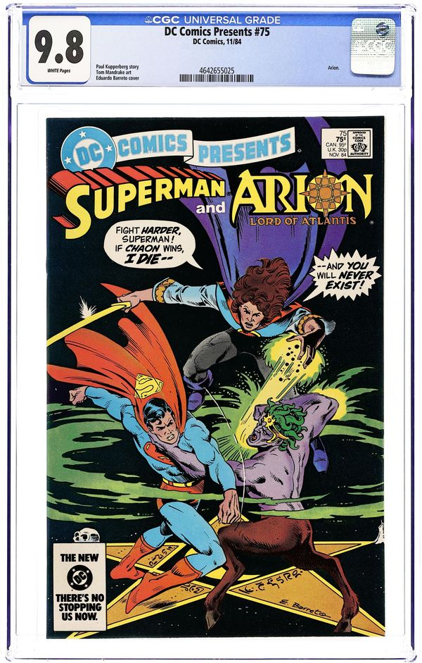 Partners in Time! - Written by Paul Kupperberg. Art by Tom Mandrake. Cover by Eduardo Barreto. Superman tries to figure out how and why Arion, Lord High Mage of Atlantis, has suddenly materialized in Metropolis. Characters in this issue: Superman; Arion; Chaon (villain); Wyynde (flashback); Lady Chian (flashback); Mara (flashback); Caculha; Ernie; Bert. 32 pages, full color. Cover price $0.75.