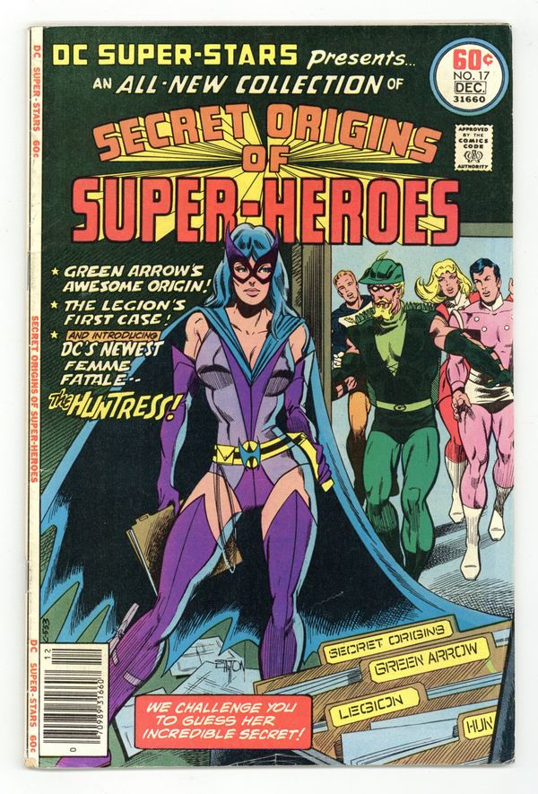 Starts Jan 3 Secret Origins of Super-Heroes -- an all-new collection! Green Arrow's awesome origin! The Legion's first case! And introducing DC's newest femme fatale -- the Huntress! Featuring: 1 page Legion of Super-Heroes; Huntress; Green Arrow story "Secret Origins of Super-Heroes" written by Paul Levitz and drawn by Jim Aparo; 10 page Green Arrow story "Origin of Green Arrow" written by Denny O'Neil and drawn by Mike Grell & Bruce Patterson; 10 page Legion of Super-Heroes story "The Secret of the Quintile Crystal!" starring the Legion of Super-Heroes [Cosmic Boy; Saturn Girl; Lightning Lad] (origin retold), Superman (cameo), R.J. Brande and Lord Lorval (villain), written by Jack C. Harris and drawn by Juan Ortiz & Bob Smith; 1 page text article "Secret Origins of Secret Origins" by Paul Levitz; 1 page Huntress illustration "Huntress Concept Art" drawn by Joe Staton (concept sketch) and Joe Orlando (cover design); 13 page Huntress story "From Each Ending...A Beginning!" starring Huntress [Helena Wayne] (origin), Batman (Earth-2), Catwoman (Earth-2), Flash [Barry Allen] (flashback), Flash [Jay Garrick] (flashback), Robin (Earth-2, flashback), Silky Cernak (villain) and Commissioner Gordon (Earth-2, cameo), written by Paul Levitz and drawn by Joe Staton & Bob Layton. Cover by Joe Staton & Bob Layton. Note : First appearance of second Huntress (Helena Wayne). This is shared by All Star Comics (1940-1978) #69 as they came out on the same day. Cover price $0.60.