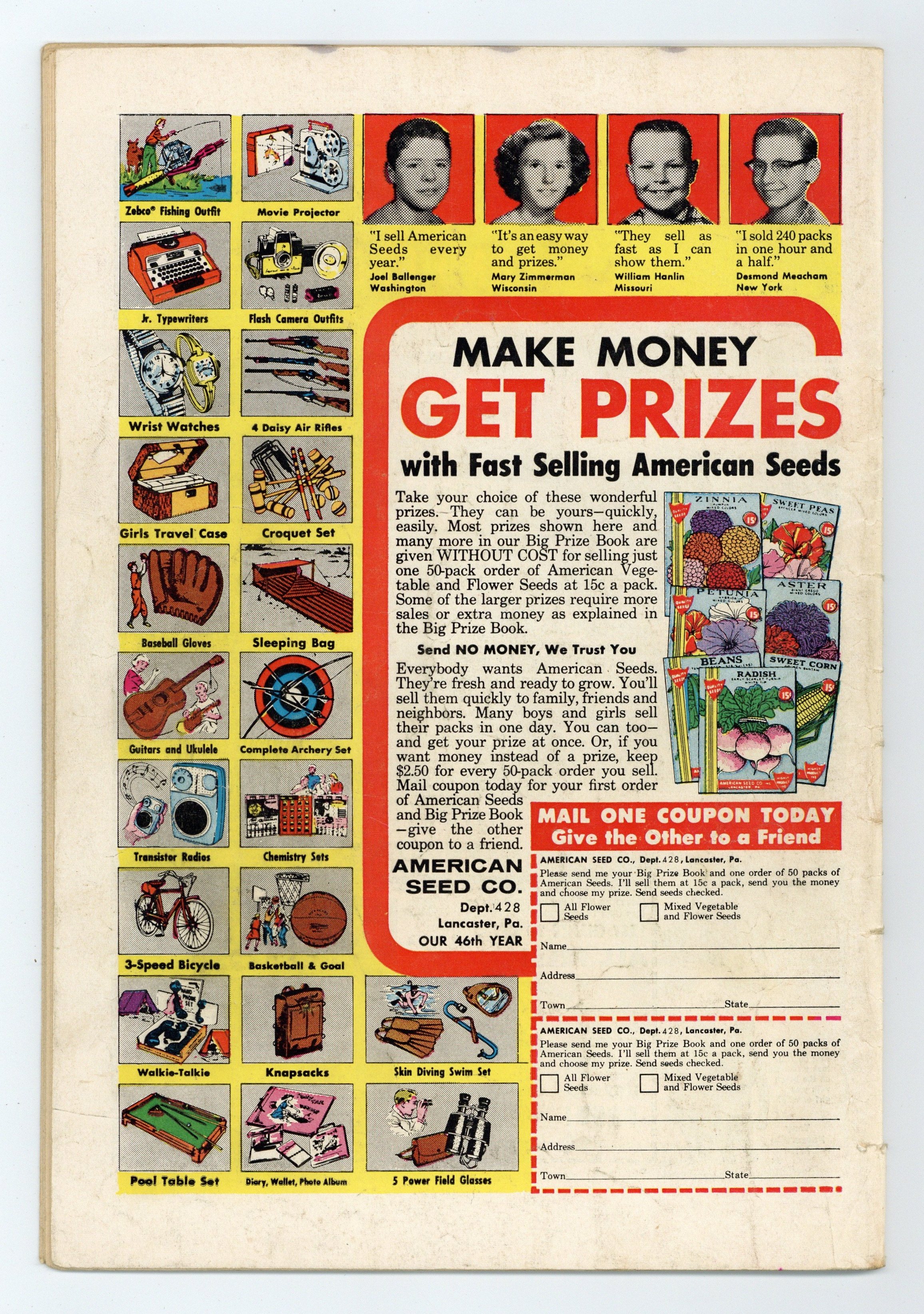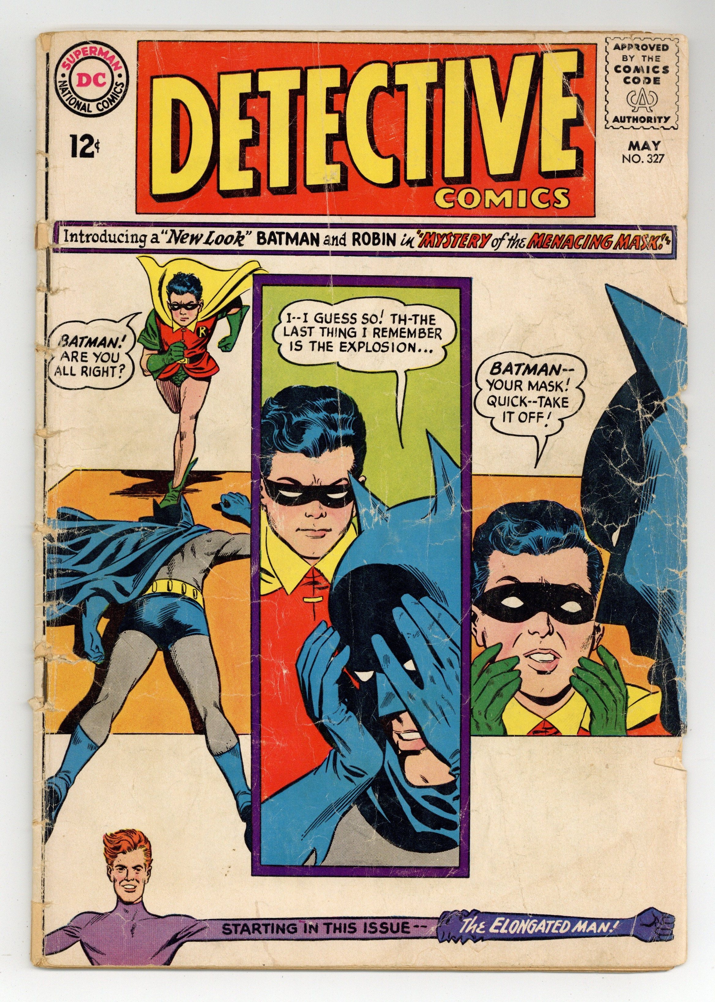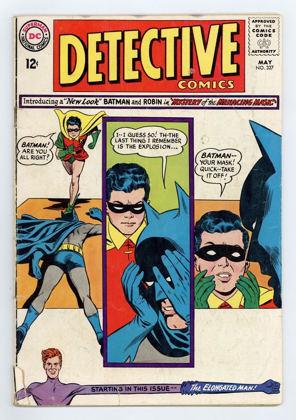 First "new look" Batman. Written by John Broome. Art by Carmine Infantino and Joe Giella. Cover by Carmine Infantino and Joe Giella. First "new look" Batman in "The Mystery of the Menacing Mask!"; The trail of a jewel thief leads to subterranean enclave of criminals. Fantastic Fingerprints article. Batman's Hot-Line article. Written by Gardner Fox. Art by Carmine Infantino. Ten Miles to Nowhere!; Ralph and Sue stumble on to a mystery involving diamond smuggling at a motel; Flash and Kid Flash cameos. 36 pages, full color. $0.12. Cover price $0.12.