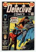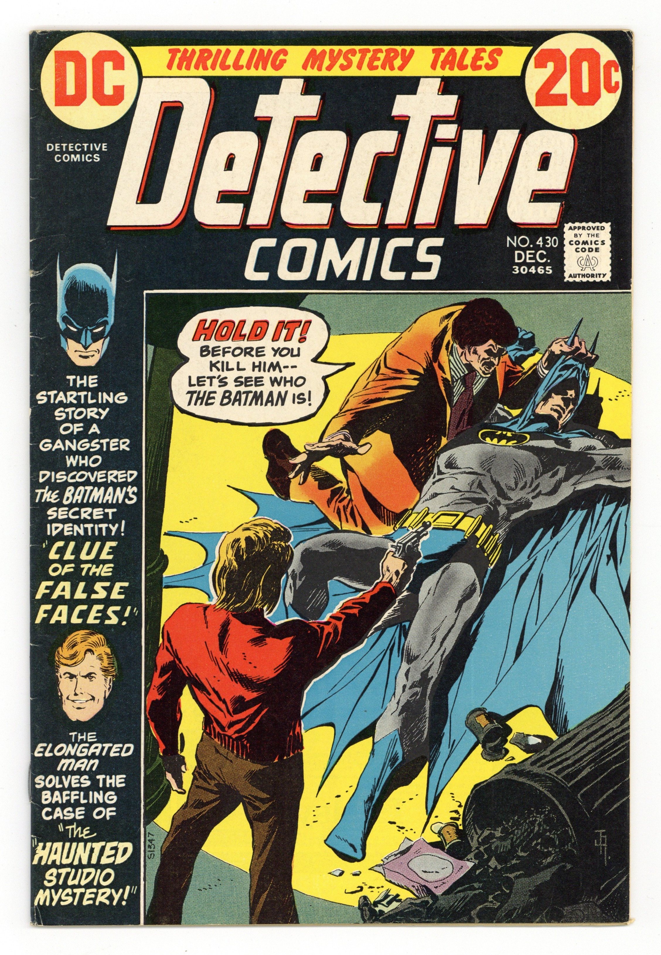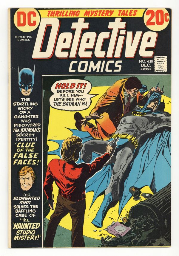 Tags: Batman$17.50Cover by Jim Aparo. "Clue of the False Faces!", script by Frank Robbins, pencils by Bob Brown, inks by Nick Cardy; After receiving a blow to the head, Batman awakens to find that the unfamiliar face beneath his mask belongs to a criminal. "The Haunted Studio Mystery!," script by E. Nelson Bridwell, art by Dick Giordano; the Elongated Man and Sue Dibny encounter thieves disguised as famous actors. Letter to the editor from Guy Lillian III. 36 pgs., full color. $0.20. Cover price $0.20.