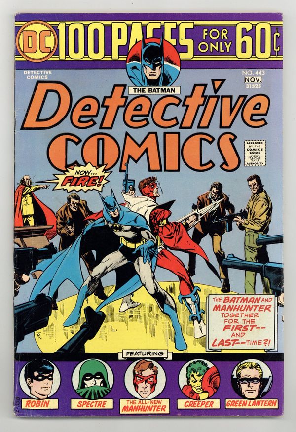96 Page Super Spectacular. Batman/Manhunter crossover in "Gotterdammerung" (script by Archie Goodwin, art by Walt Simonson). Two Simonson pin-ups. Reprints: the Spectre (from More Fun Comics 65; art by Bernard Baily), Golden Age Green Lantern in "The End of Sports" (from All-American Comics 98; art by Alex Toth), the Creeper in "The Coming of the Creeper" (from Showcase 73; script by Don Segall, art by Steve Ditko), and Batman and Robin in "The Secret of Hunter's Inn!" (from Batman 18). Simonson contents page illustration. Jim Aparo cover. 100 pgs. Cover price $0.60.